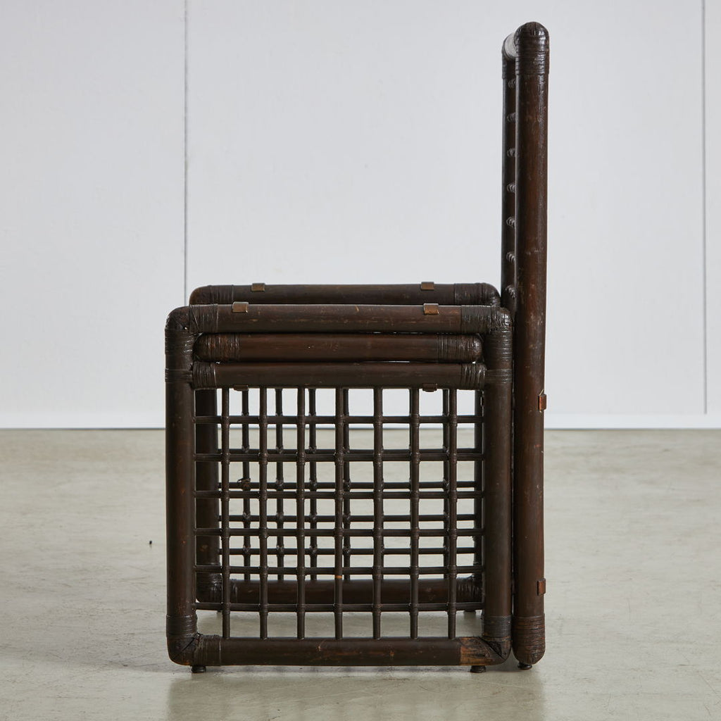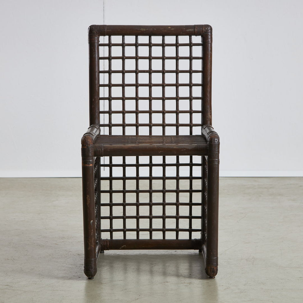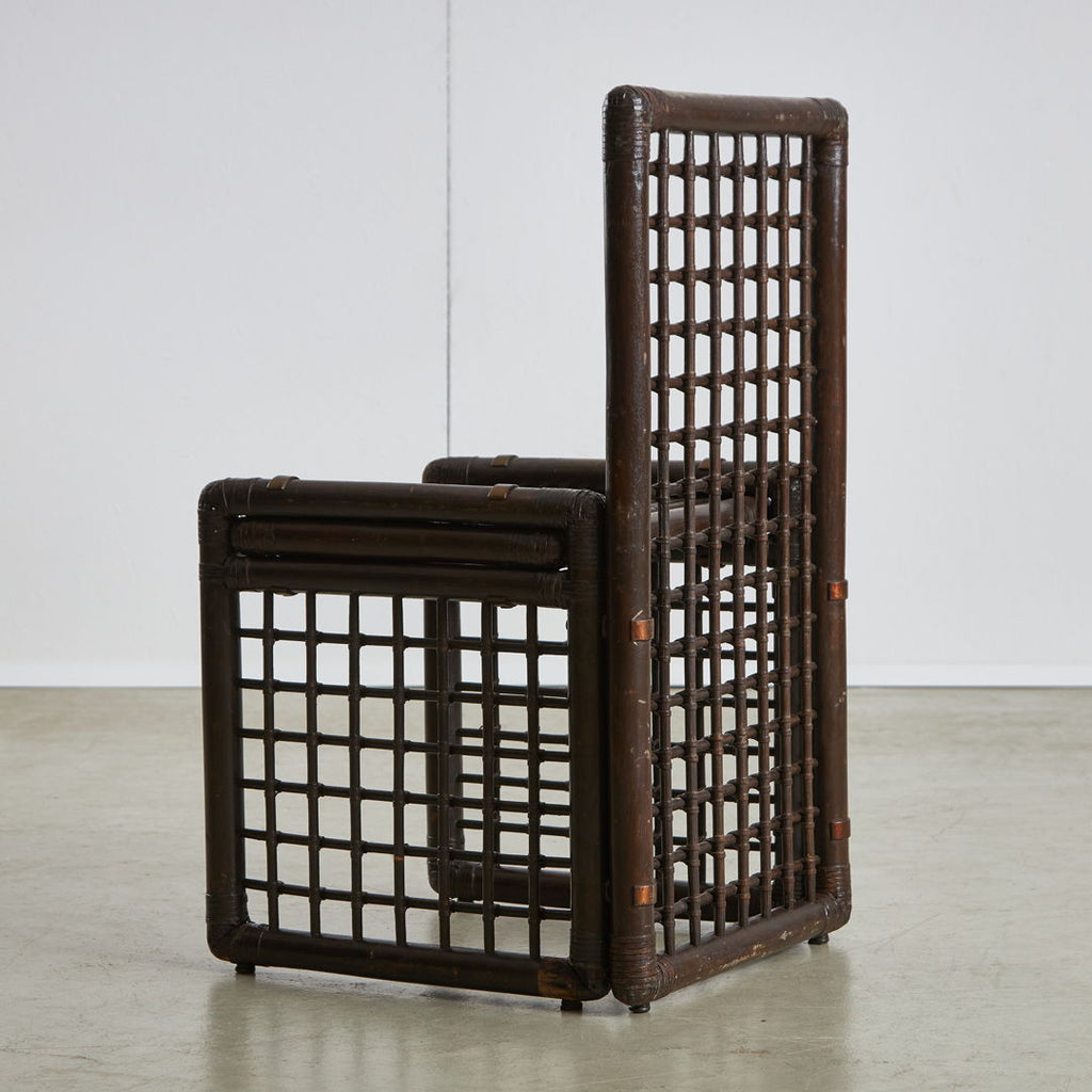 Afra e Tobia Scarpa 사각 격자 대나무 의자는 짙은 갈색-빨간색으로 우아한 구리 디테일이 있습니다. 1970년대 B&B Maxalto를 위해 Basilian I 시리즈로 디자인되었습니다. 의자는 완전한 기능을 유지하고 시각적으로 매력적입니다. 세월과 사용으로 인한 마모의 흔적이 발견될 수 있으며 일부 장식 연결부가 깨지거나 찢어질 수 있습니다. 그러나 이러한 결함이 의자 고유의 아름다움, 안정성 및 견고성을 손상시키지는 않습니다.