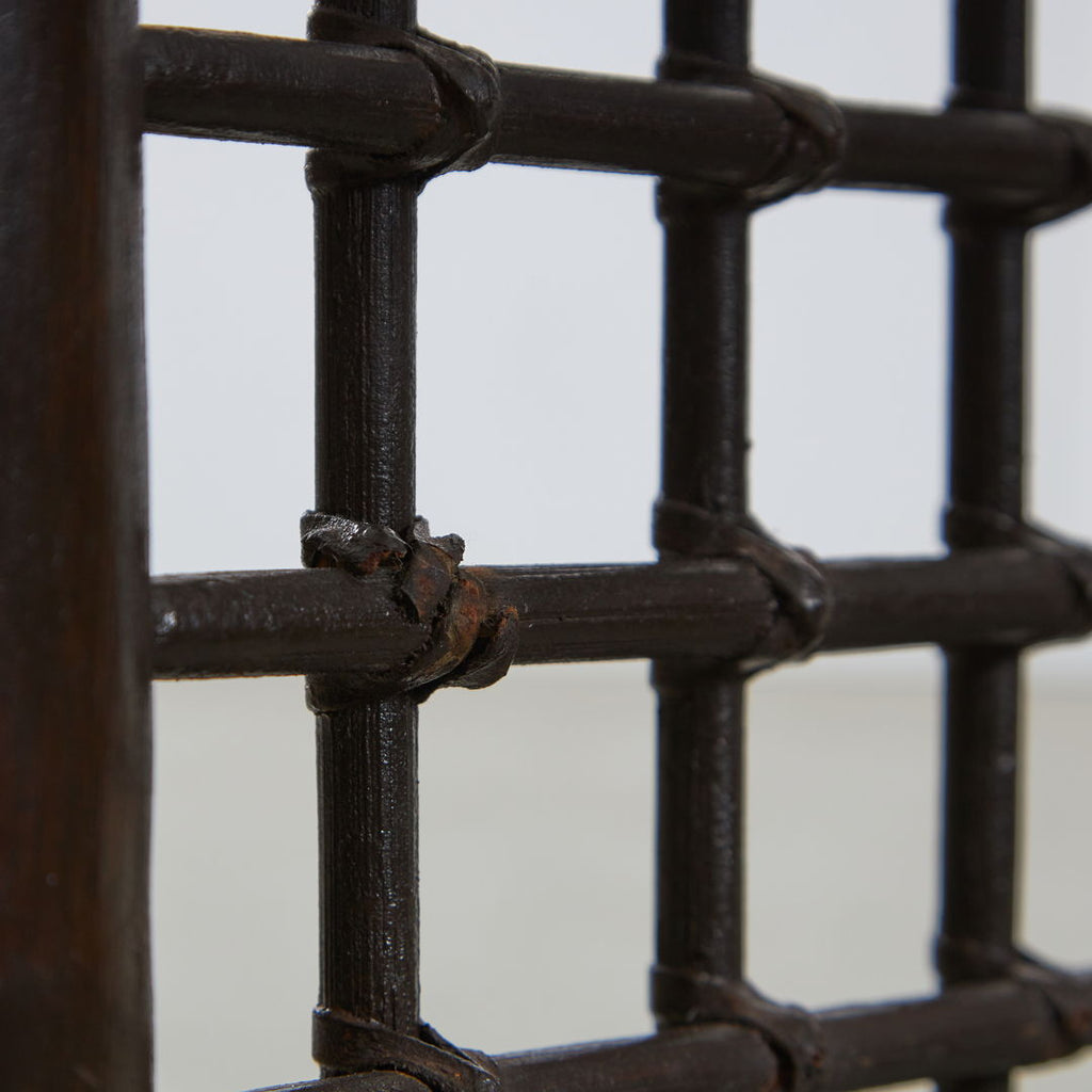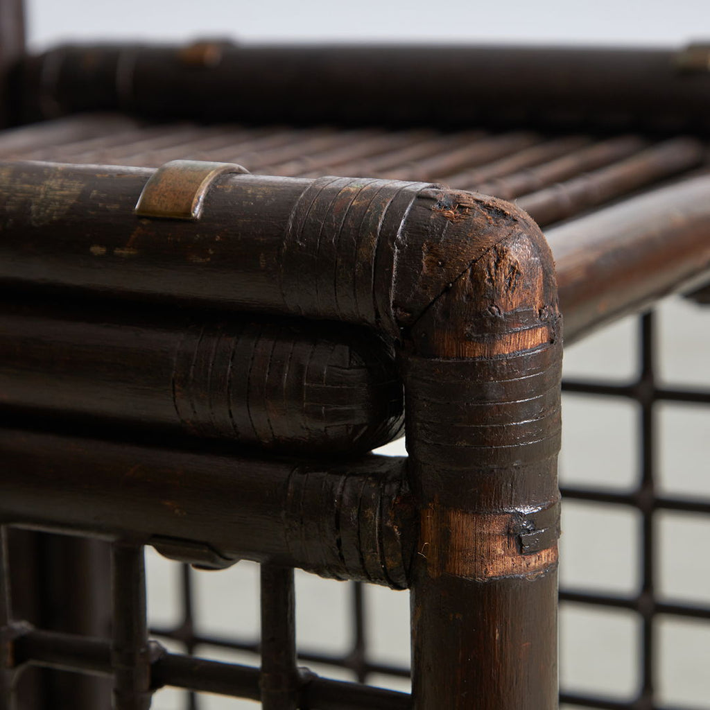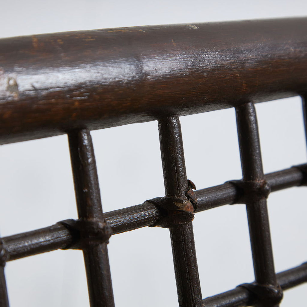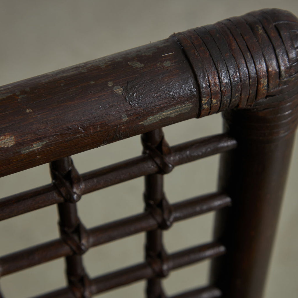 Afra e Tobia Scarpa 사각 격자 대나무 의자는 짙은 갈색-빨간색으로 우아한 구리 디테일이 있습니다. 1970년대 B&B Maxalto를 위해 Basilian I 시리즈로 디자인되었습니다. 의자는 완전한 기능을 유지하고 시각적으로 매력적입니다. 세월과 사용으로 인한 마모의 흔적이 발견될 수 있으며 일부 장식 연결부가 깨지거나 찢어질 수 있습니다. 그러나 이러한 결함이 의자 고유의 아름다움, 안정성 및 견고성을 손상시키지는 않습니다.