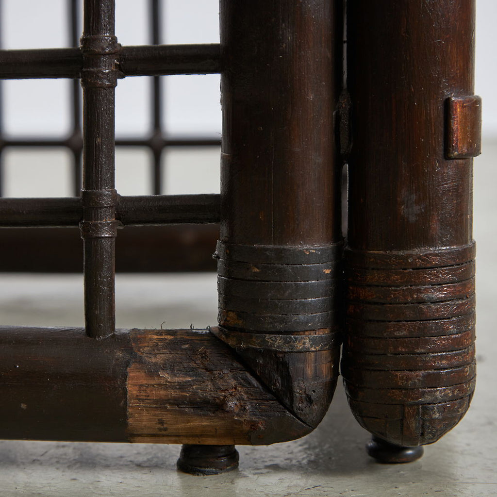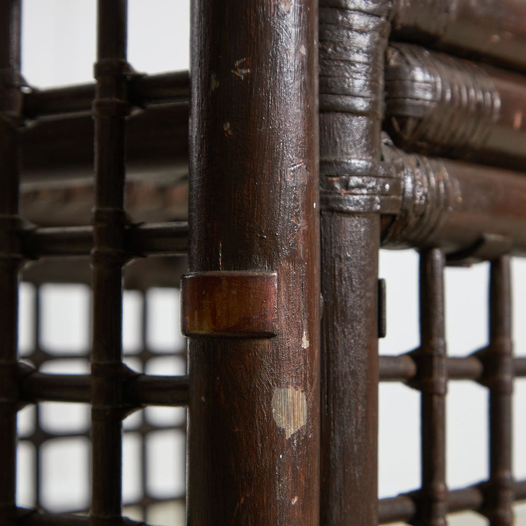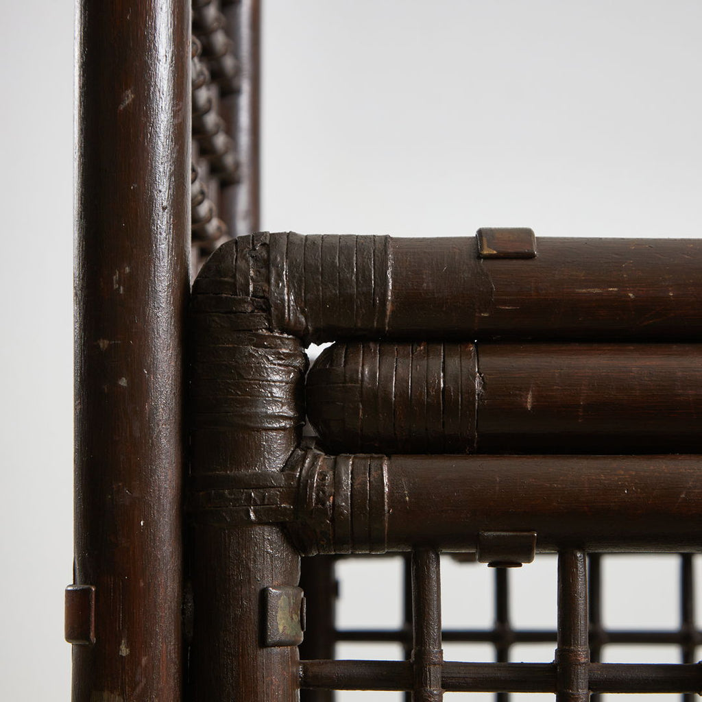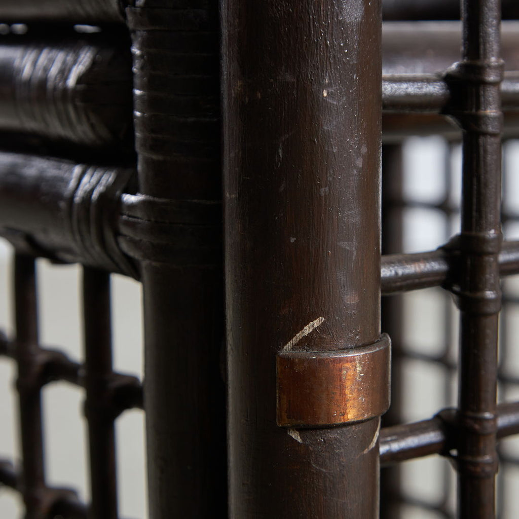 Afra e Tobia Scarpa square lattice bamboo chair in dark brown-red colour with elegant copper details. Designed in the Basilian I Series for B&B Maxalto in the 1970s. The chair remains fully functional and visually appealing. Signs of wear and tear due to age and usage can be spotted, with some decorative joints being chipped or torn, however, these flaws do not compromise the chair's unique beauty, stability and sturdiness.