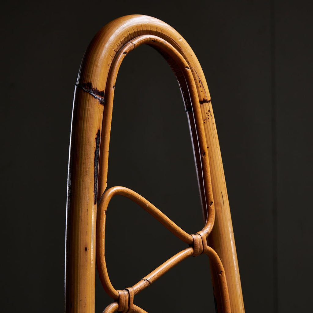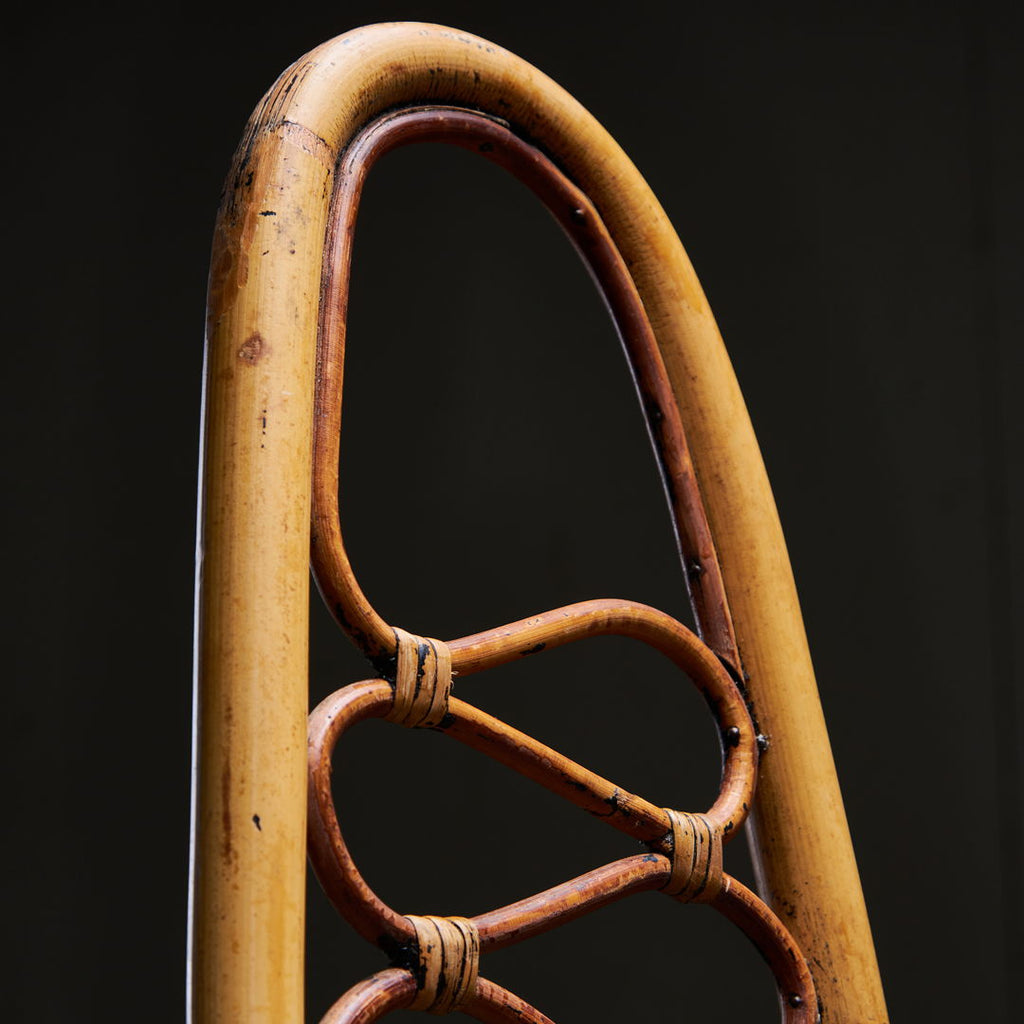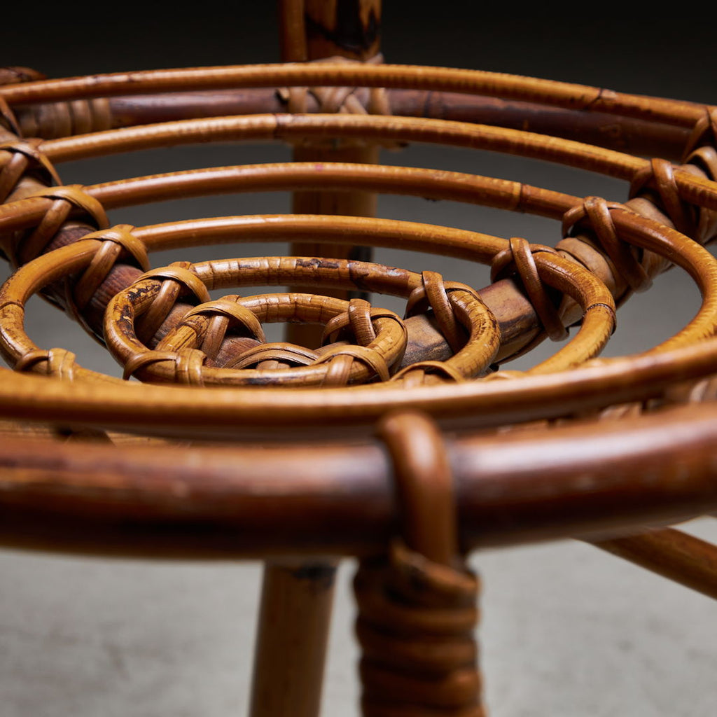 대나무 하이백 의자는 1960년 피에란토니오 보나치나(Pierantonio Bonacina)의 상징적인 대나무 의자를 기반으로 디자인되었습니다. 나선형 및 원형 디테일이 결합된 절묘한 장인정신. 이 상품은 약간의 사용 흔적이 있을 수 있는 좋은 빈티지 상태입니다.