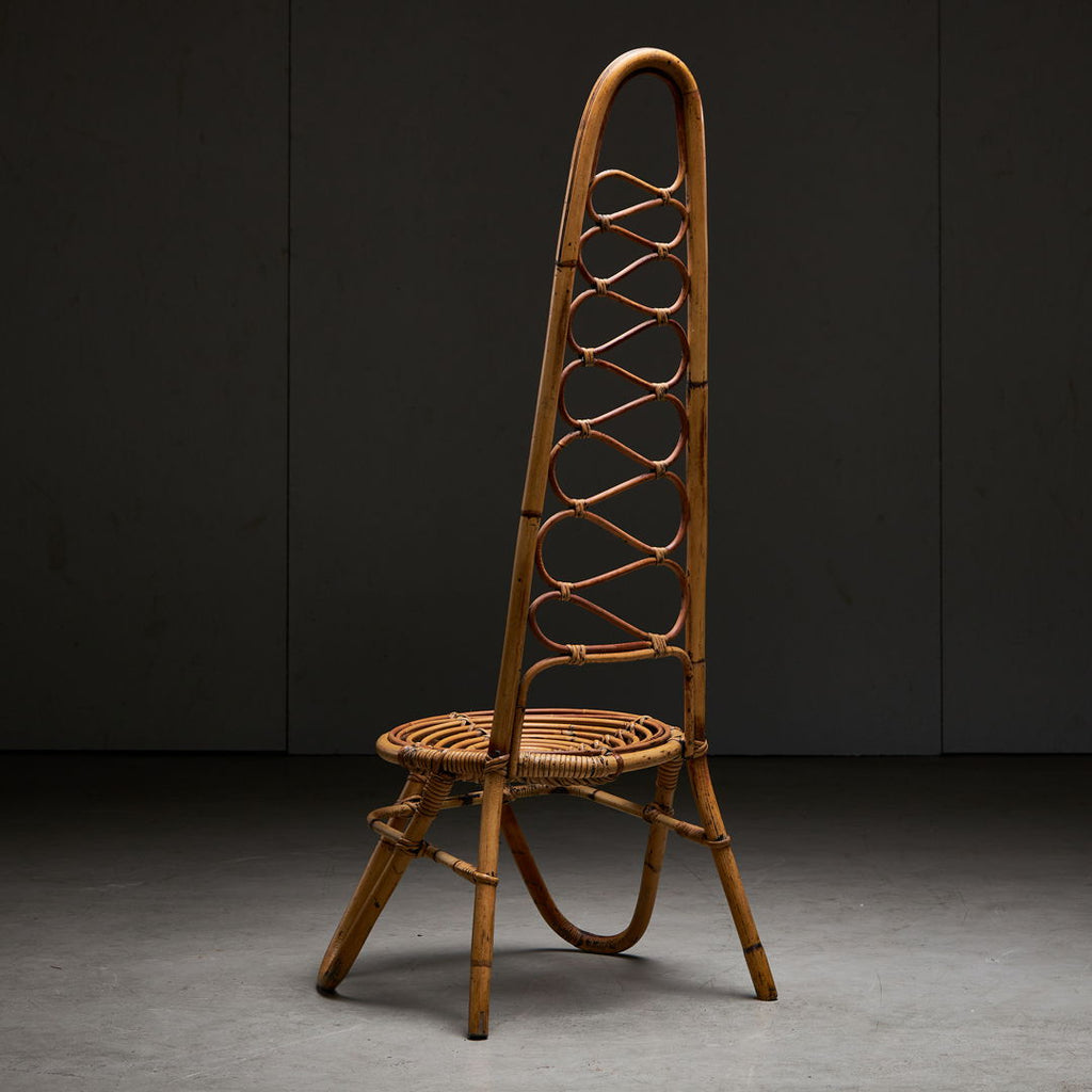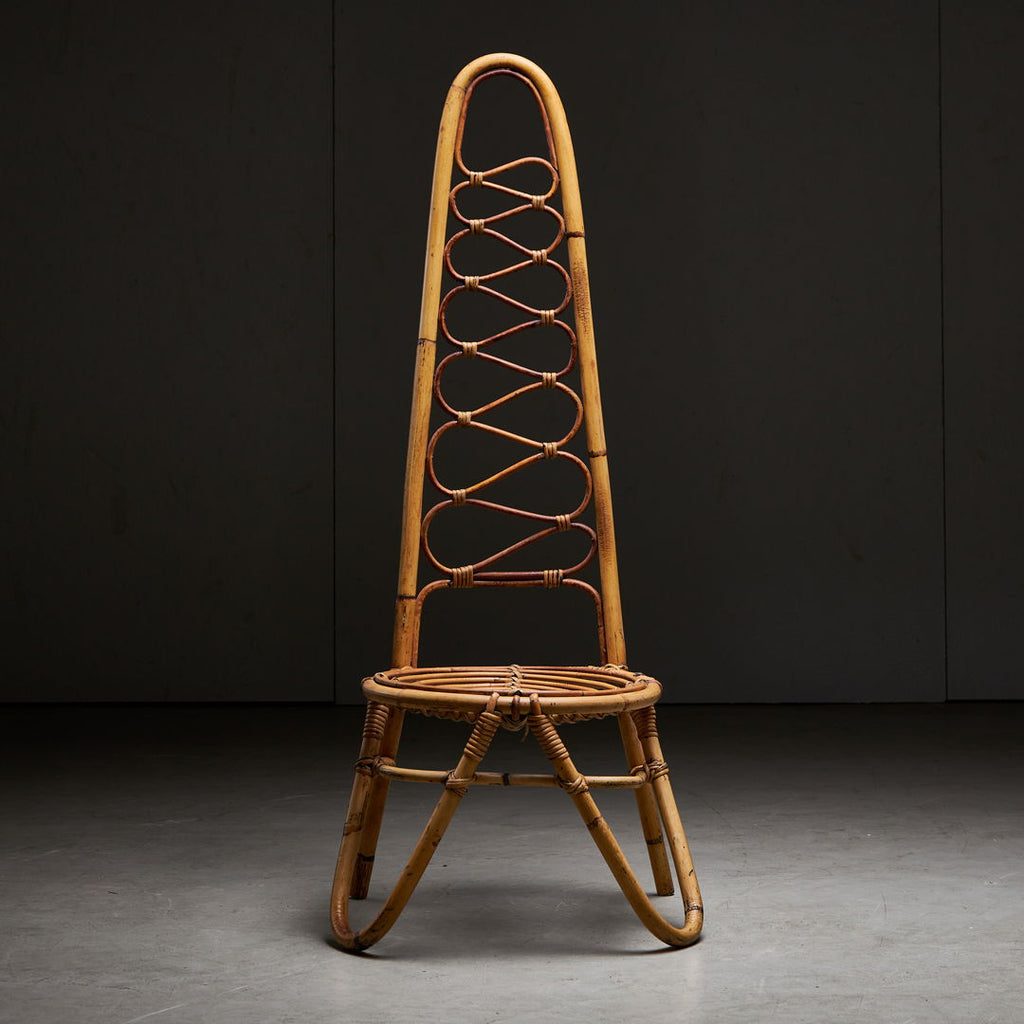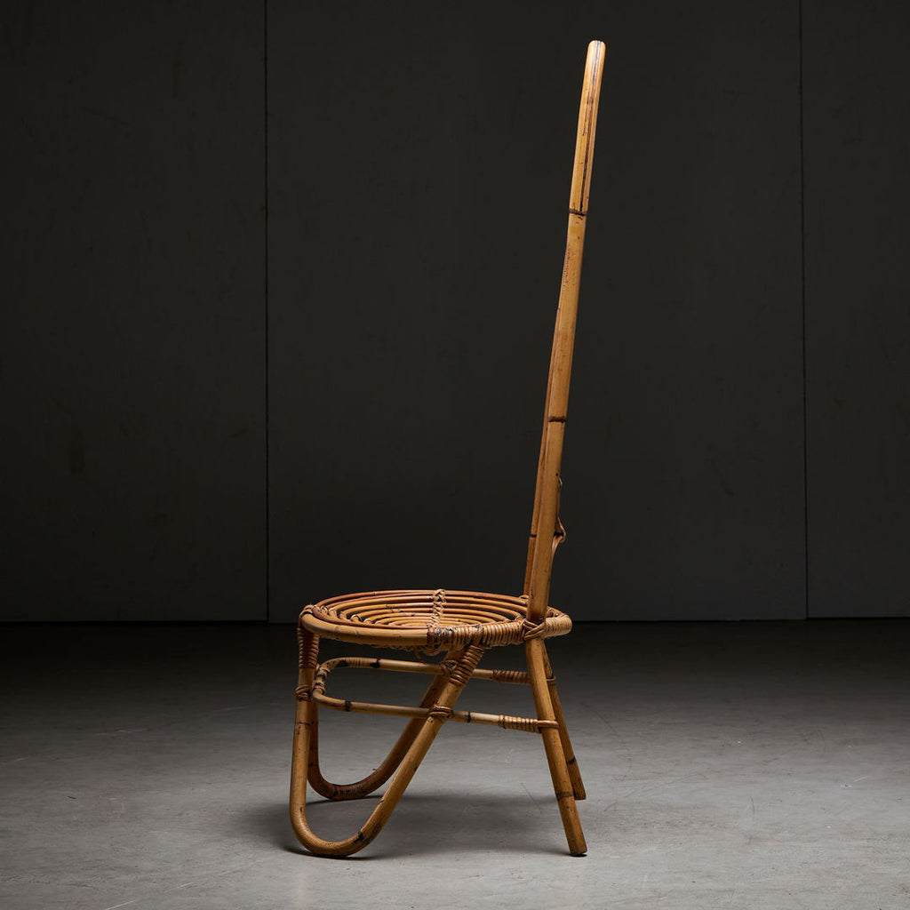 "피에란토니오 보나치나가 1960년 보나치나를 위해 디자인한 대나무 하이백 체어. 나선형과 라운드 디테일이 어우러진 절묘한 장인정신. 하자는 없지만 약간의 사용감이 있을 수 있는 상품입니다."
