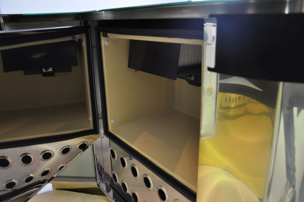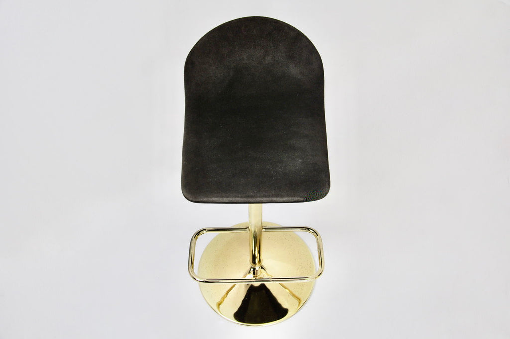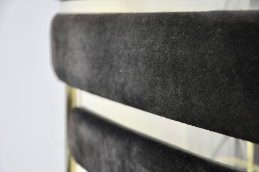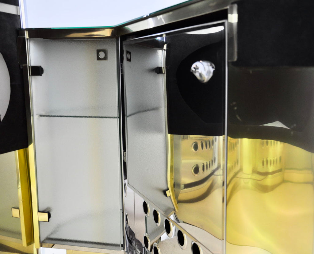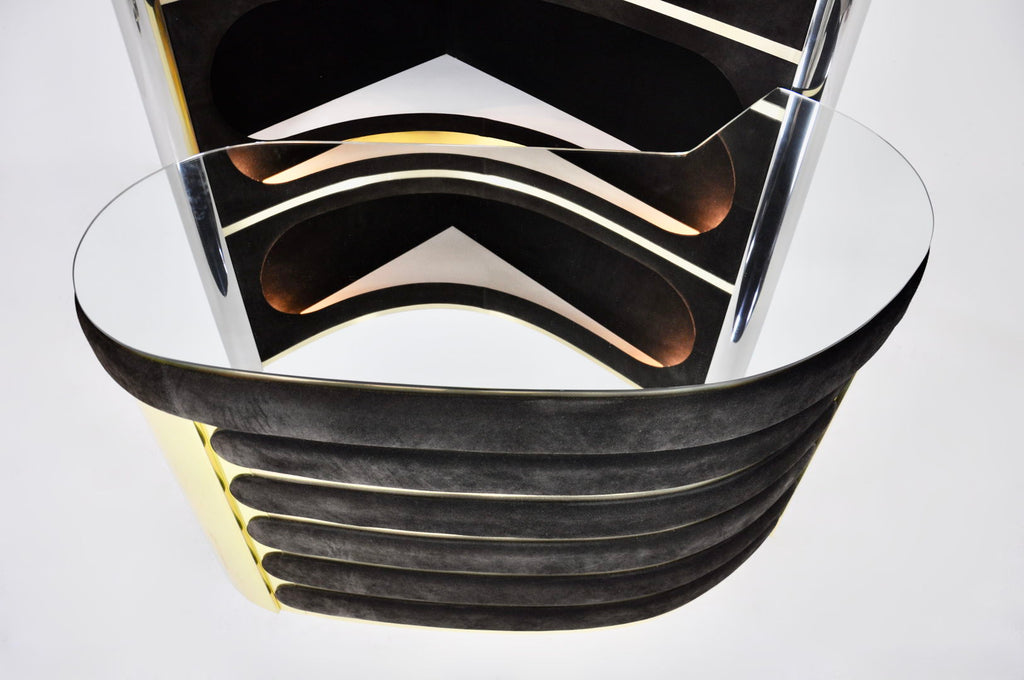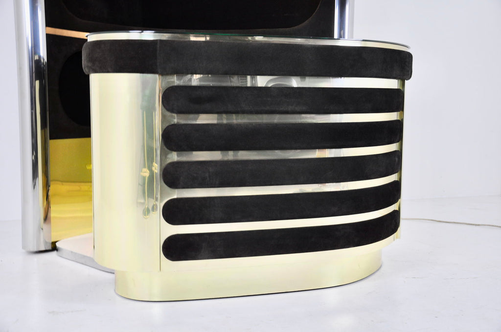 The set includes a cabinet with 3 illuminated shelves in black suede, chromed metal and brass, one of the sides at the back is mirrored glass. It also includes a suede and brass countertop with a mirrored top, a fridge and a glass cabinet with a shelf. The floor is carpeted. 2 stools in suede and brass.
