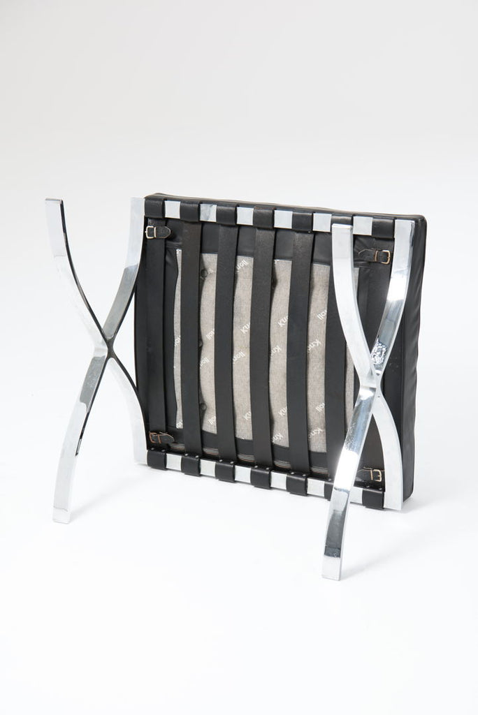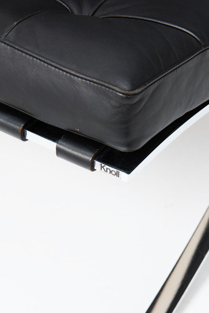 An iconic ‘Barcelona’ Chair in black leather, with foot stool. Designed by Mies Van der Rohe for the 1929 Barcelona International Exposition. The chair is produced by Knoll International in late 70's. The frames are made of chrome plated steel with the leather straps fixed by rivets. The cushions have the original leather upholstery showing signs of use but with a beautiful patina which comes with the age. We have 2 sets available. (Price is per set) The chairs are in overall very good used condition as presented in pictures.