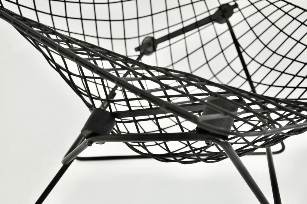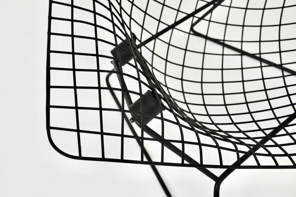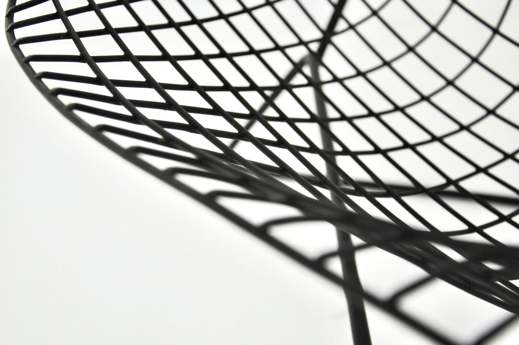 Harry Bertoia의 검은색 금속 의자. 모델: 새. 좌석 높이: 22cm. 의자의 시간과 사용 기간으로 인한 마모.