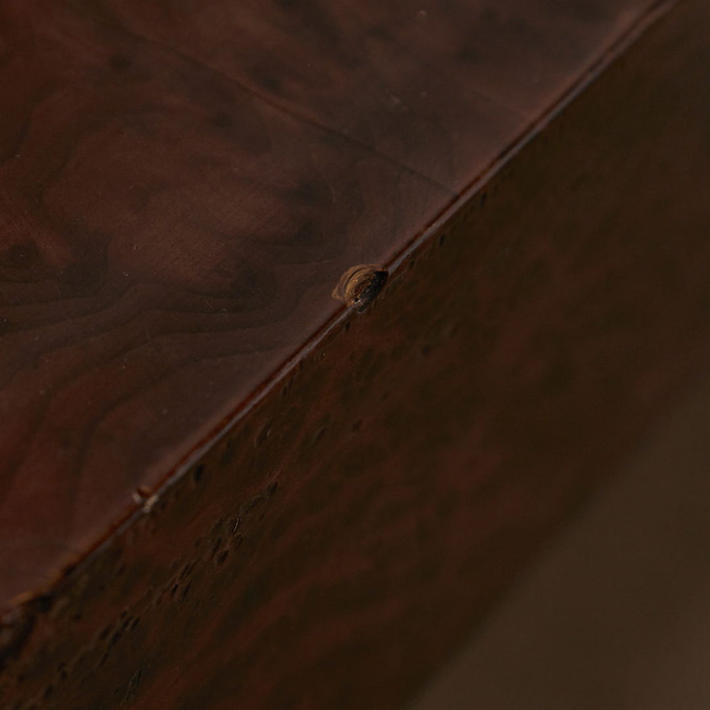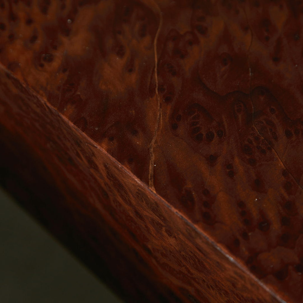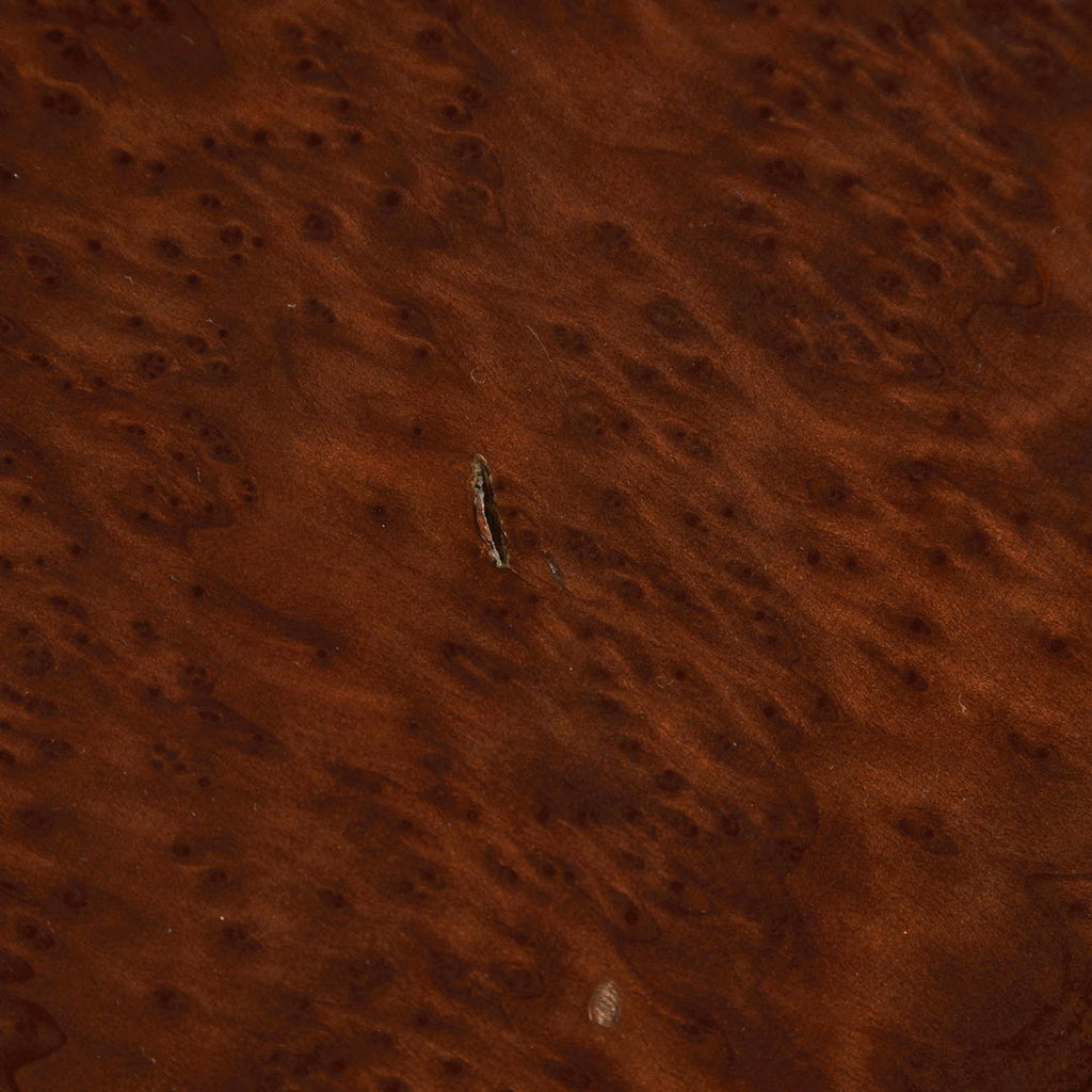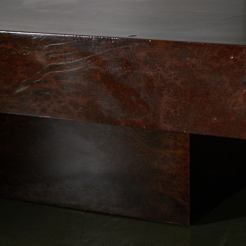 Long, low coffee table crafted from birdseye maple wood in a dark brown, veneer with a natural pattern. The varnished surface of the table has cracks in certain areas, as well as small surface scratches and minor signs of wear.