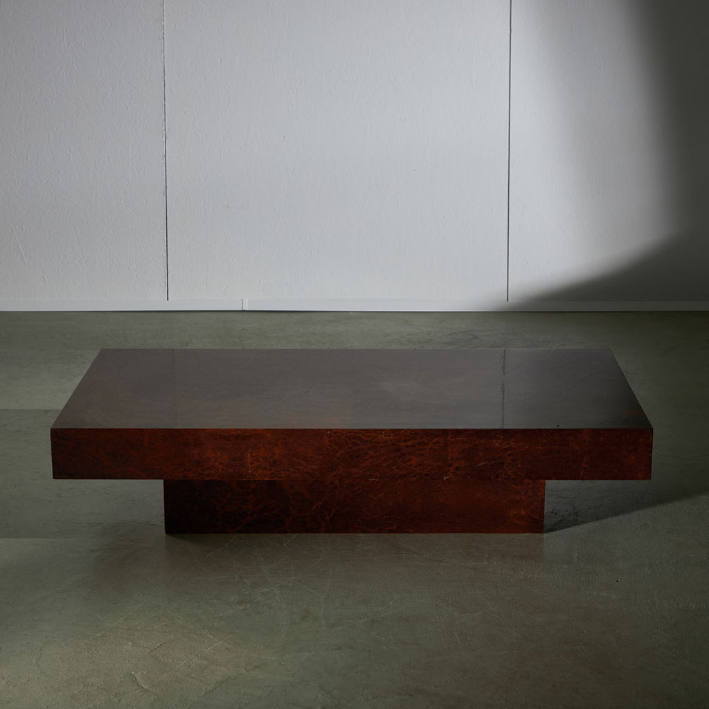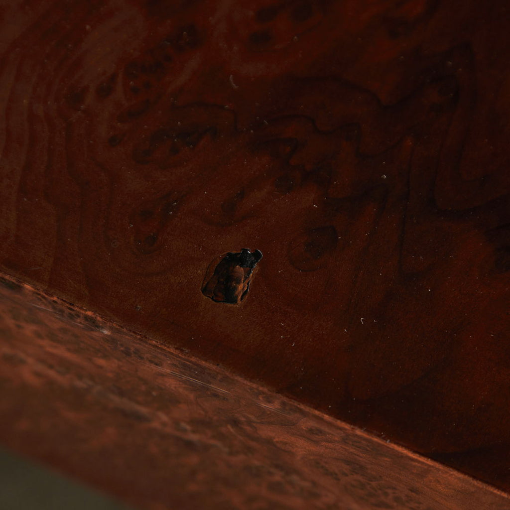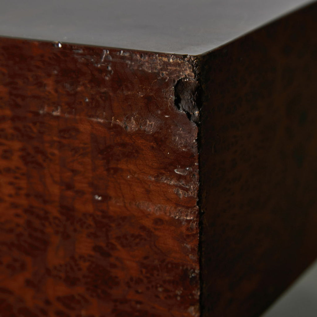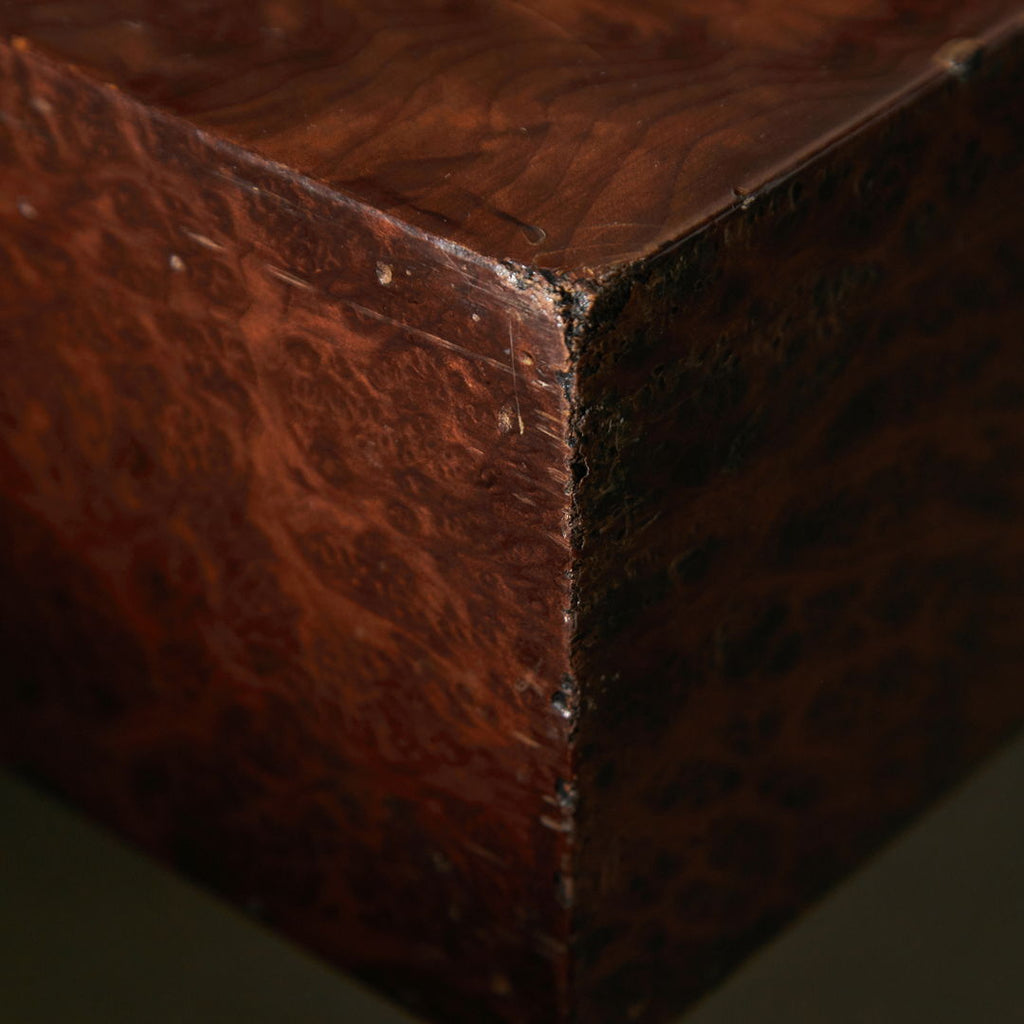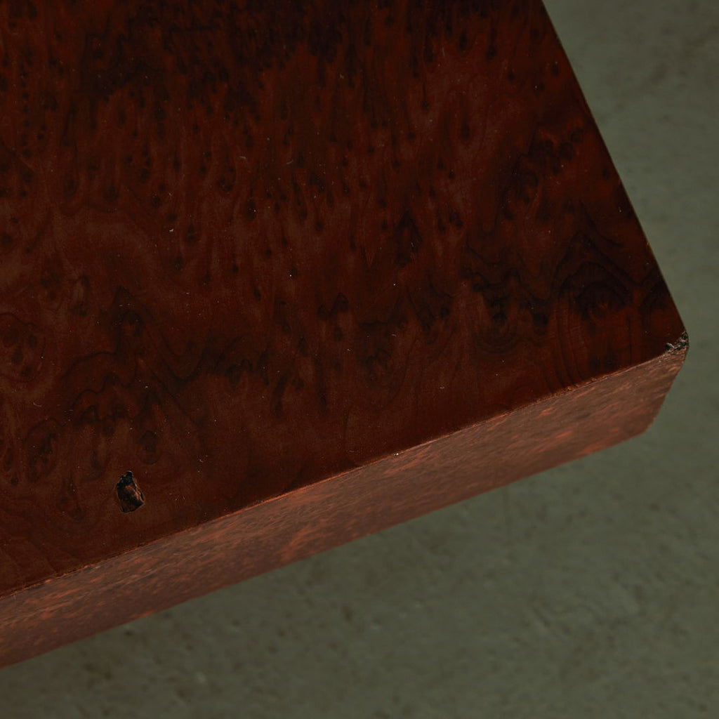 Long, low coffee table crafted from birdseye maple wood in a dark brown, veneer with a natural pattern. The varnished surface of the table has cracks in certain areas, as well as small surface scratches and minor signs of wear.