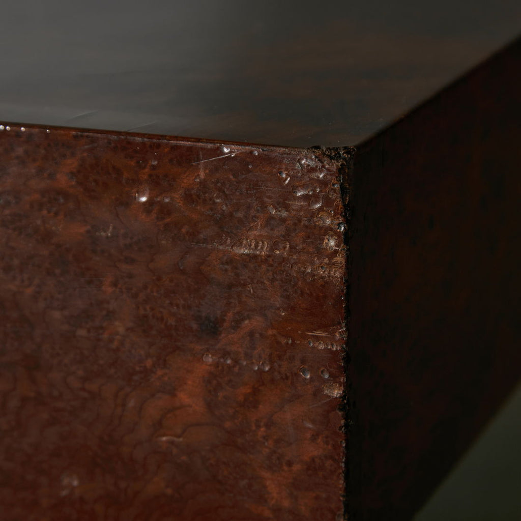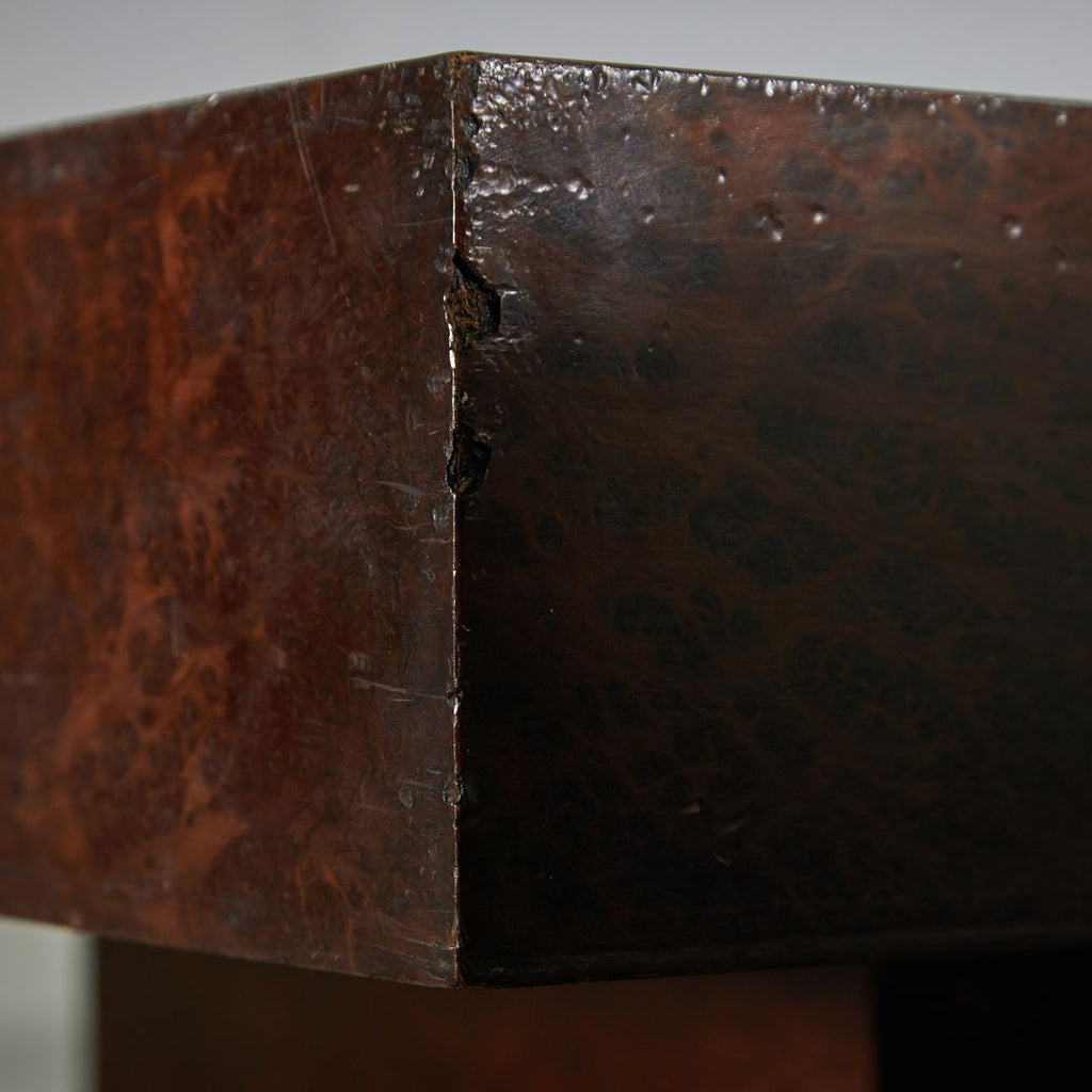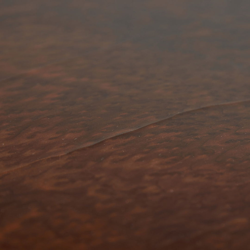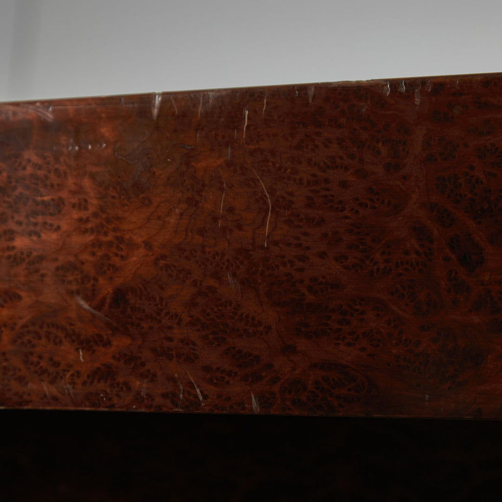 Long, low coffee table crafted from birdseye maple wood in a dark brown, veneer with a natural pattern. The varnished surface of the table has cracks in certain areas, as well as small surface scratches and minor signs of wear.