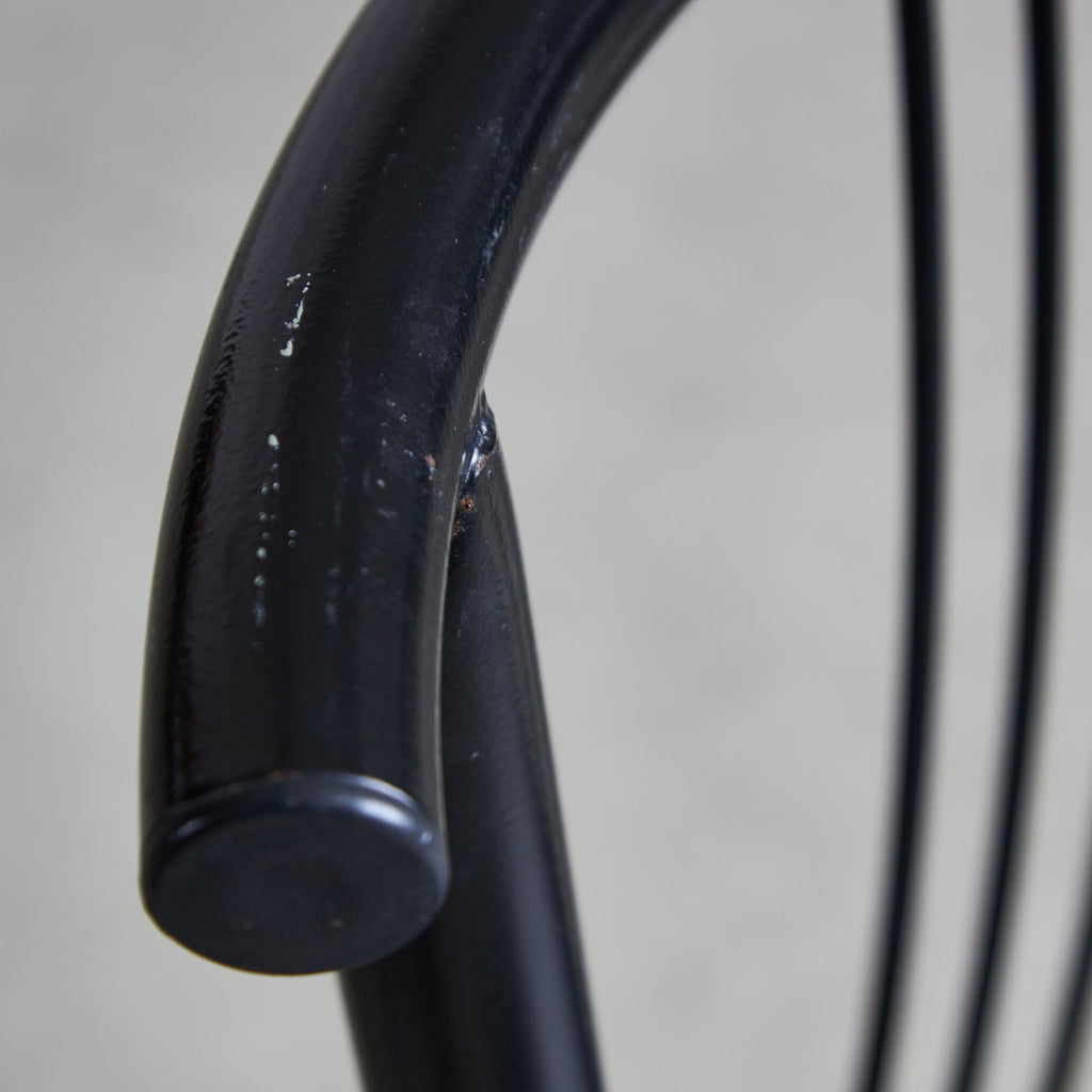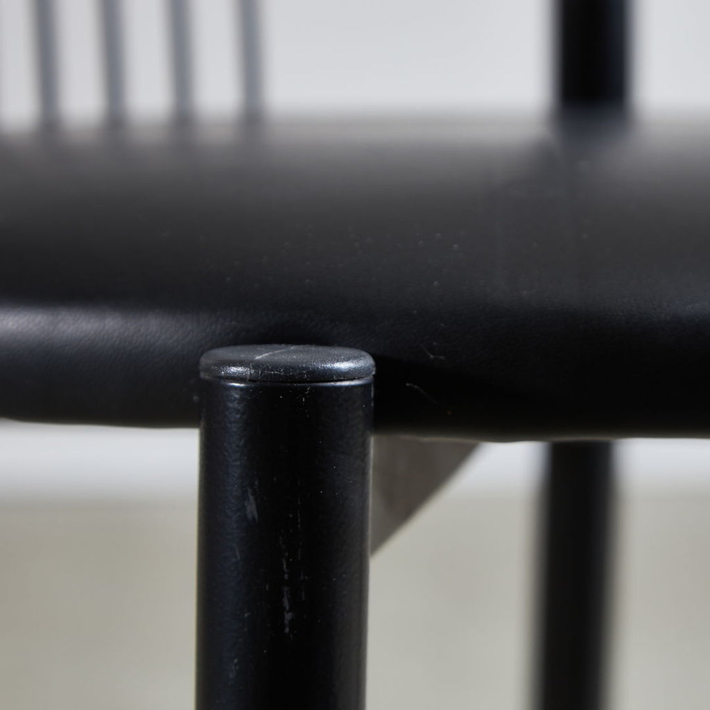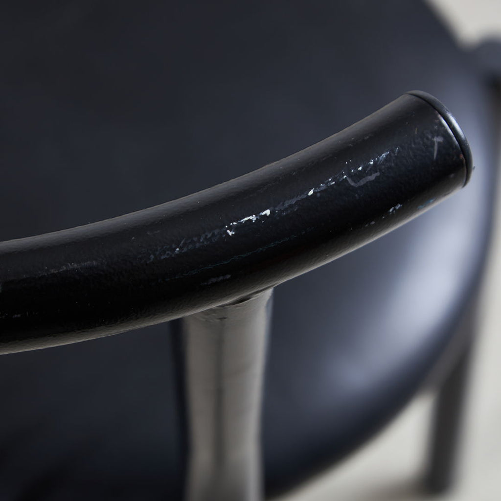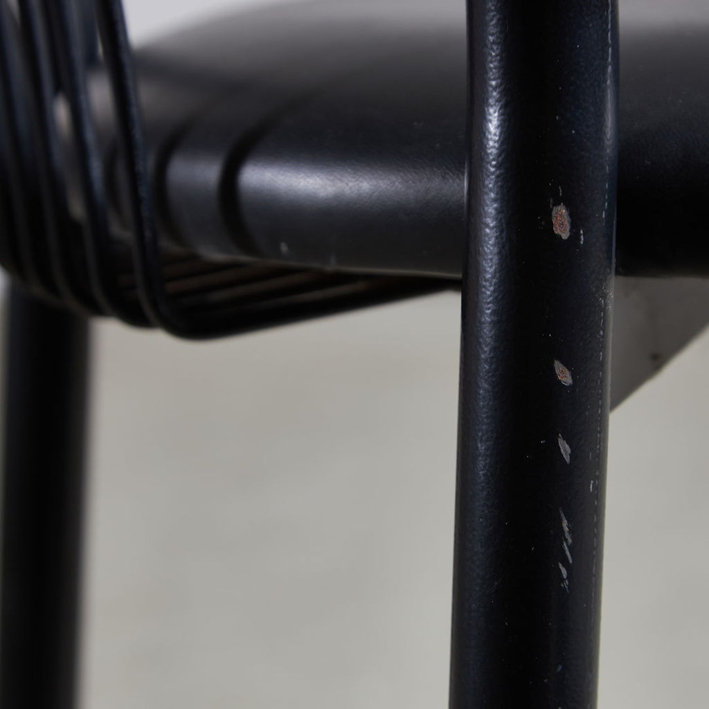 "우아한 형태와 섬세한 라인의 블랙 메탈 튜브 프레임, 80년대 이탈리아산 원형 합성가죽 시트. 등받이 중앙에 6개의 얇은 스틱이 있습니다. 스타일리시한 집에 완벽한 다이닝룸 의자입니다. 세트 4 약간의 긁힘과 사용감이 있지만 상태는 좋습니다." 4개 세트 가격