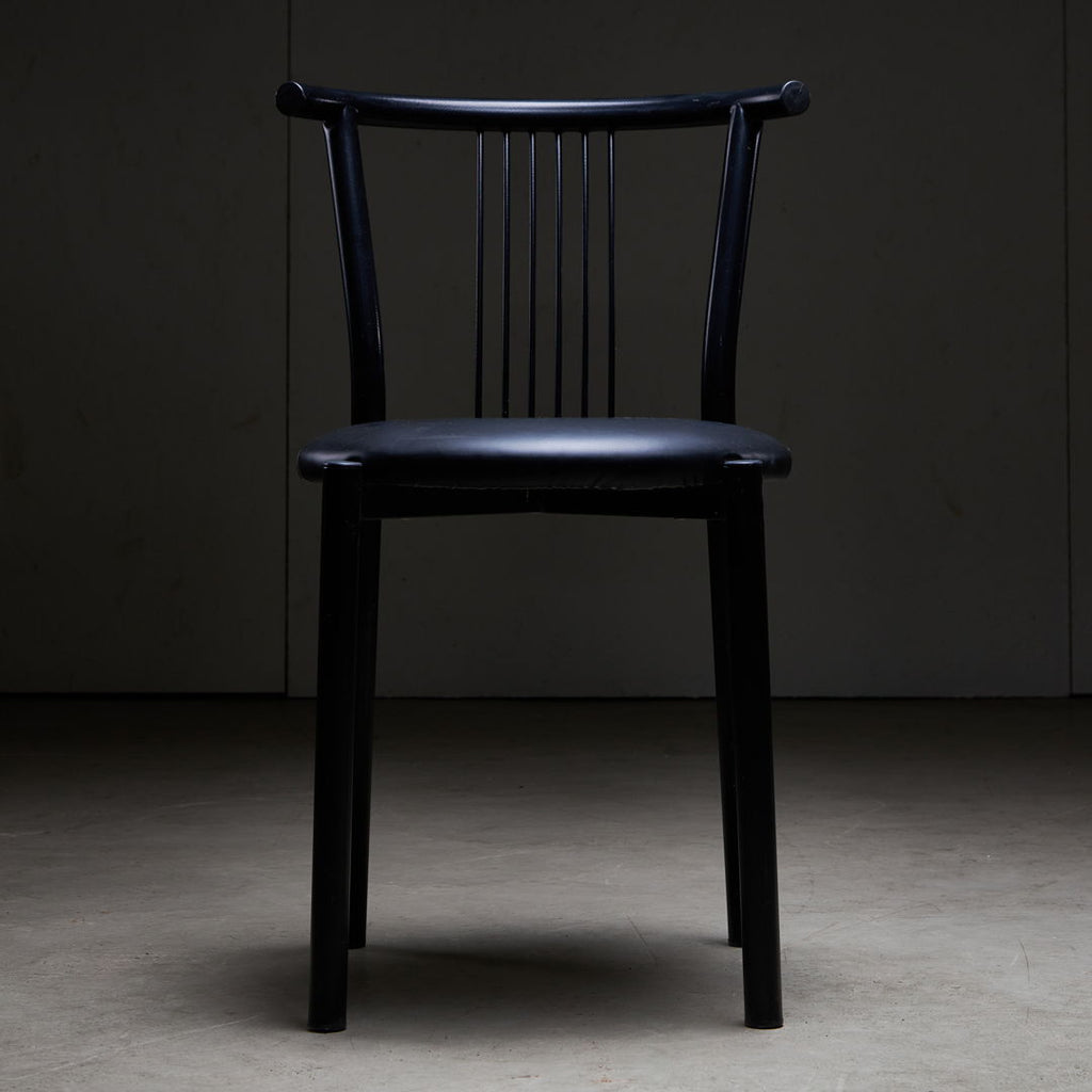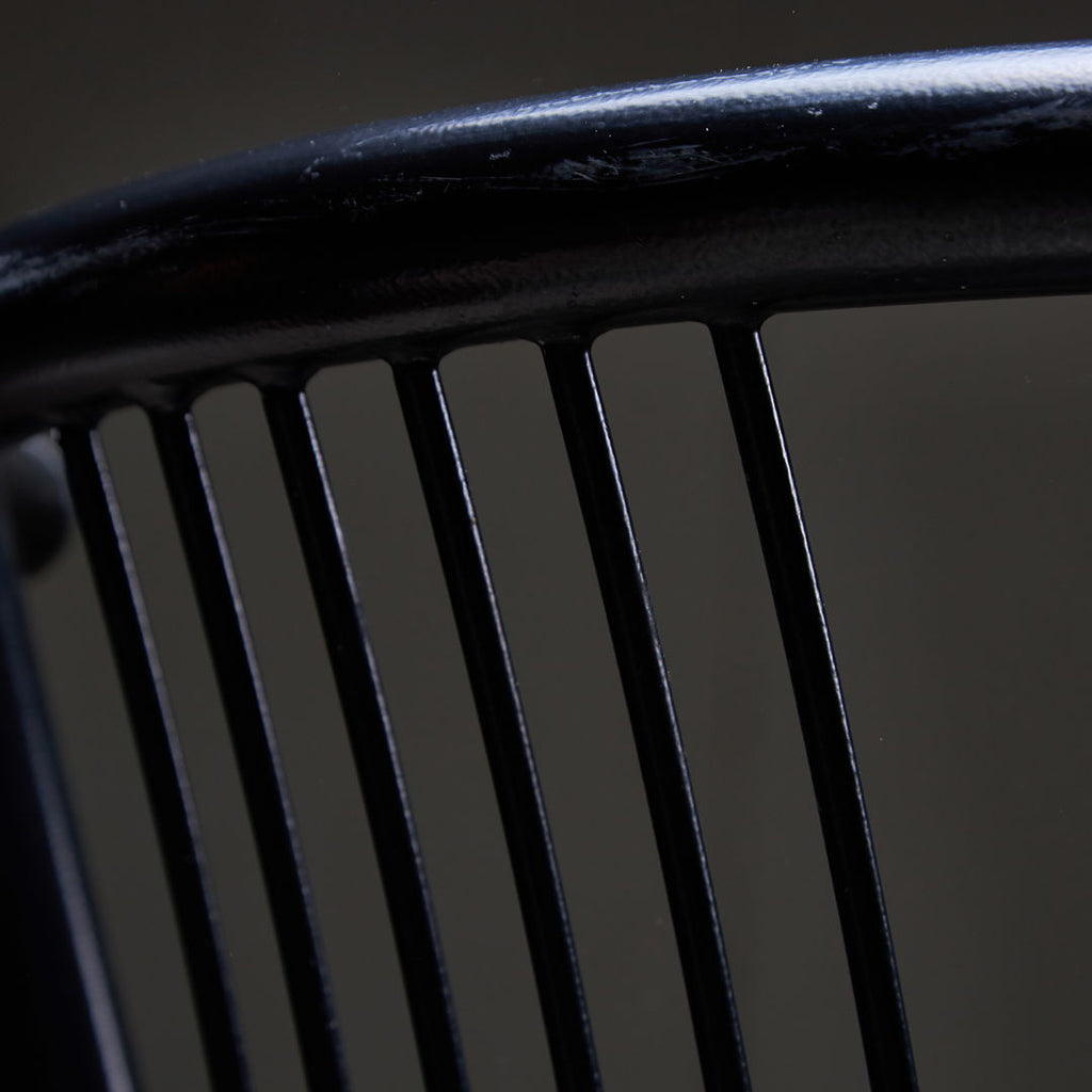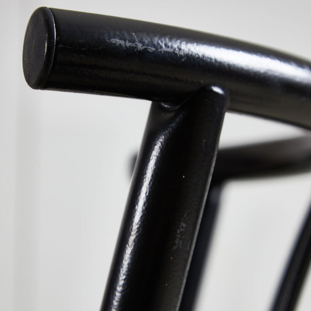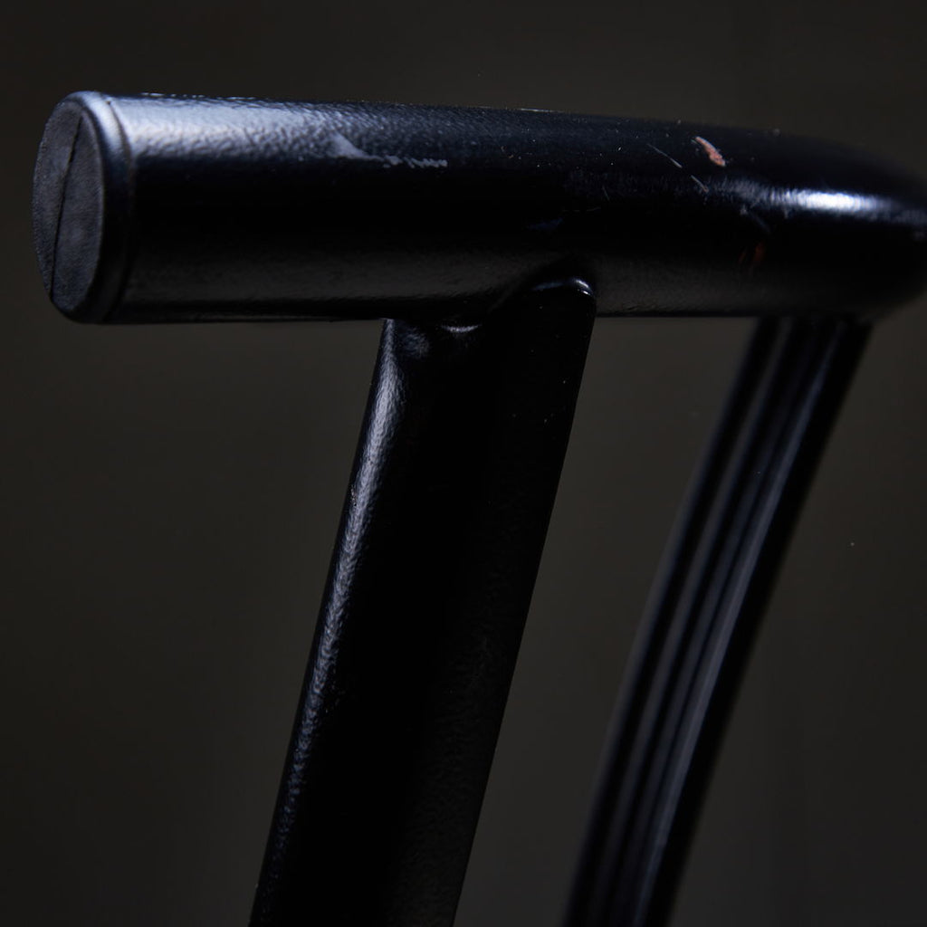 "우아한 형태와 섬세한 라인의 블랙 메탈 튜브 프레임, 80년대 이탈리아산 원형 합성가죽 시트. 등받이 중앙에 6개의 얇은 스틱이 있습니다. 스타일리시한 집에 완벽한 다이닝룸 의자입니다. 세트 4 약간의 긁힘과 사용감이 있지만 상태는 좋습니다." 4개 세트 가격