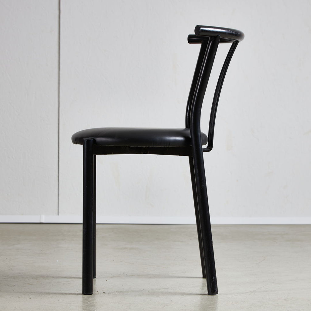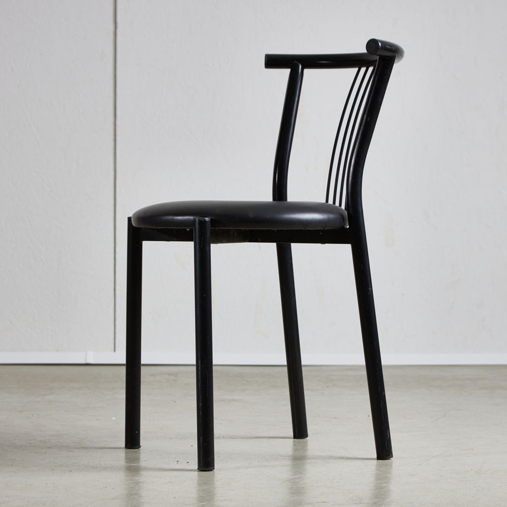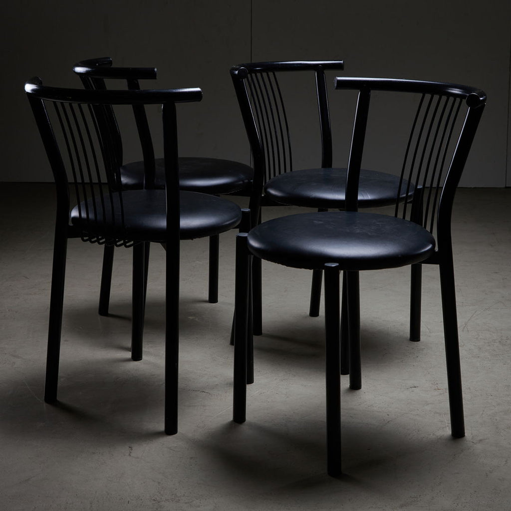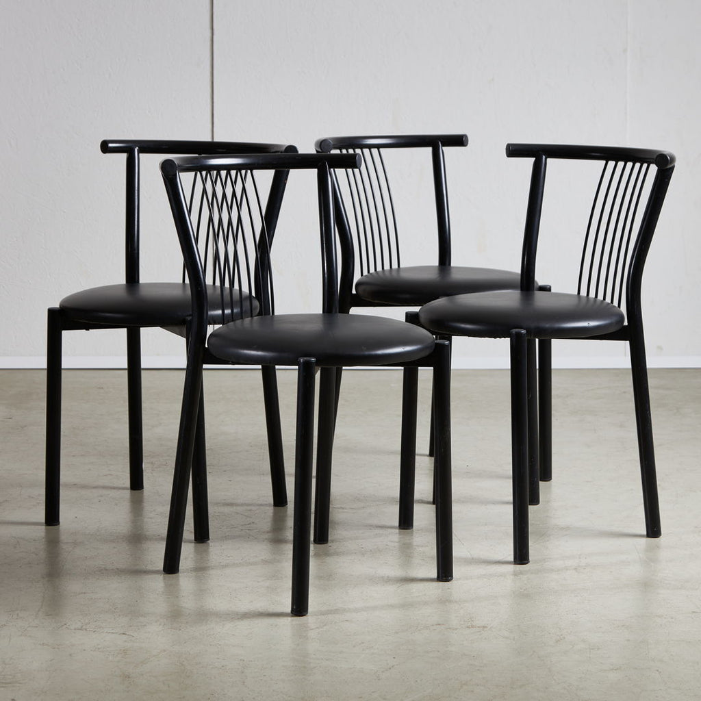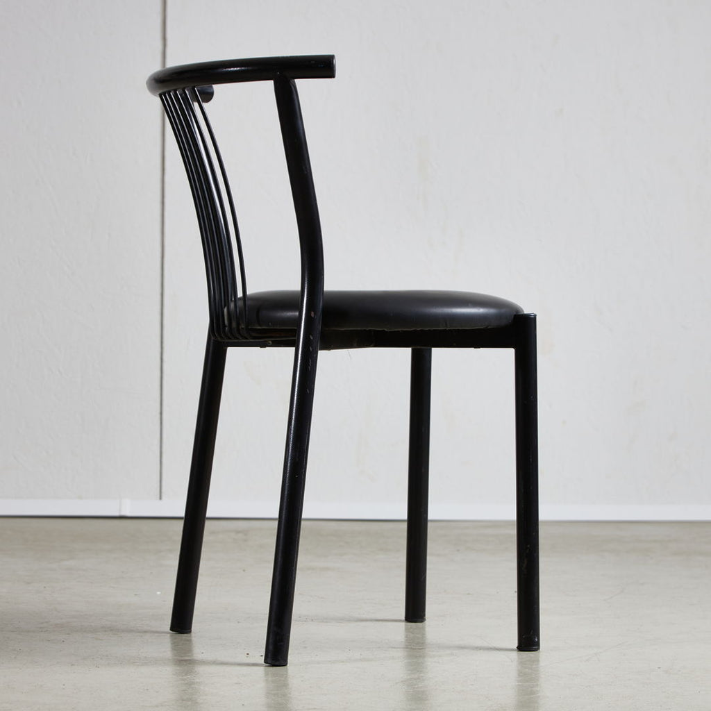 "Elegant shapes and fine lines of black metal tube frame, with round synthetic leather seats from the '80s Italy. There are six thin sticks in the center of the backrest. These dining room chairs are the perfect addition to a stylish home. Set of 4 in a good condition, with some scratches and signs of wear."