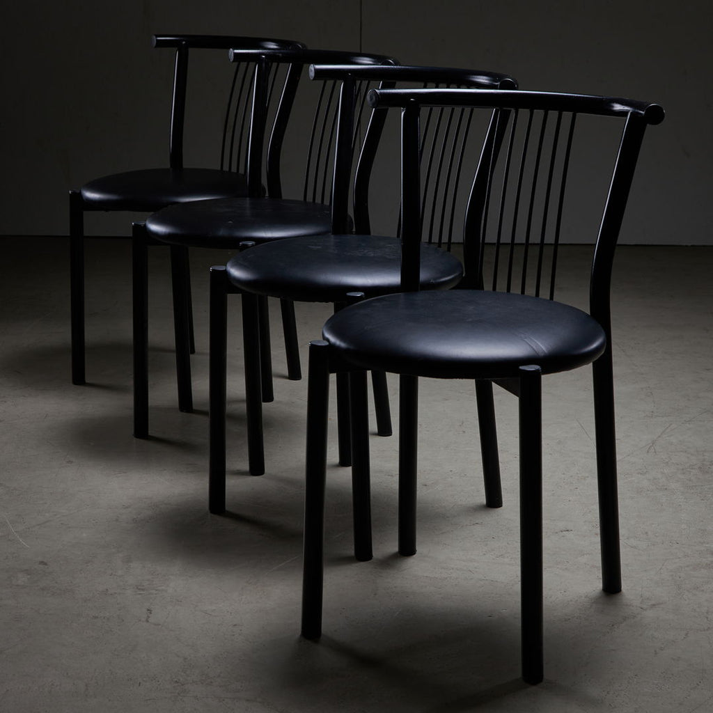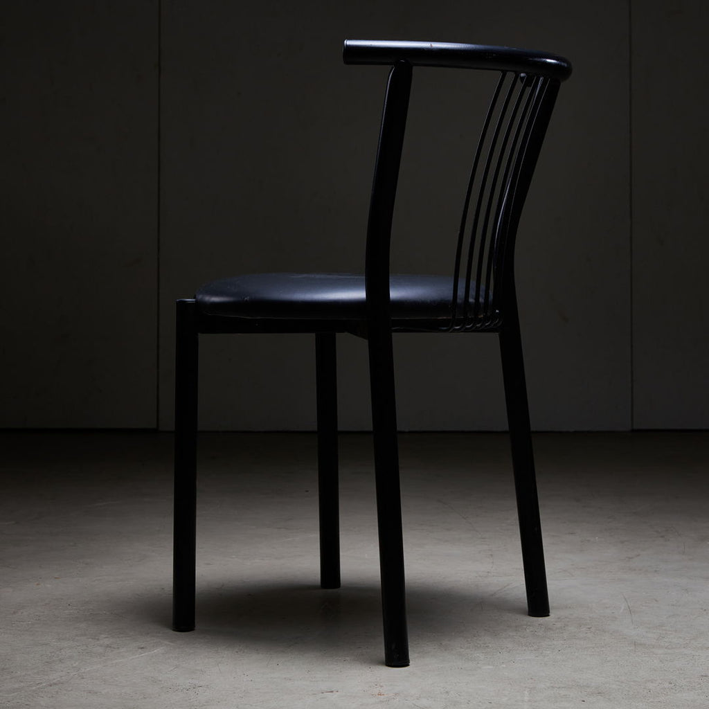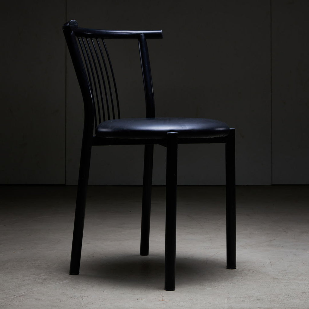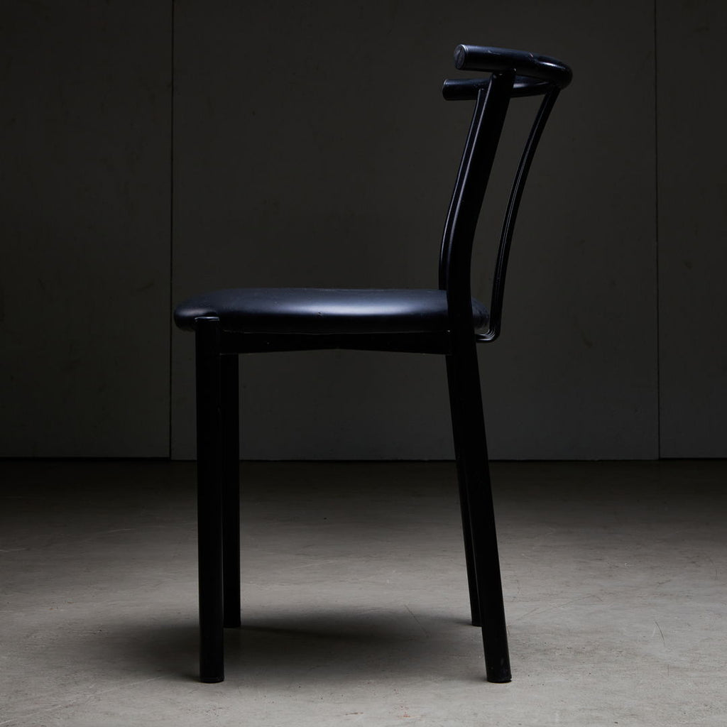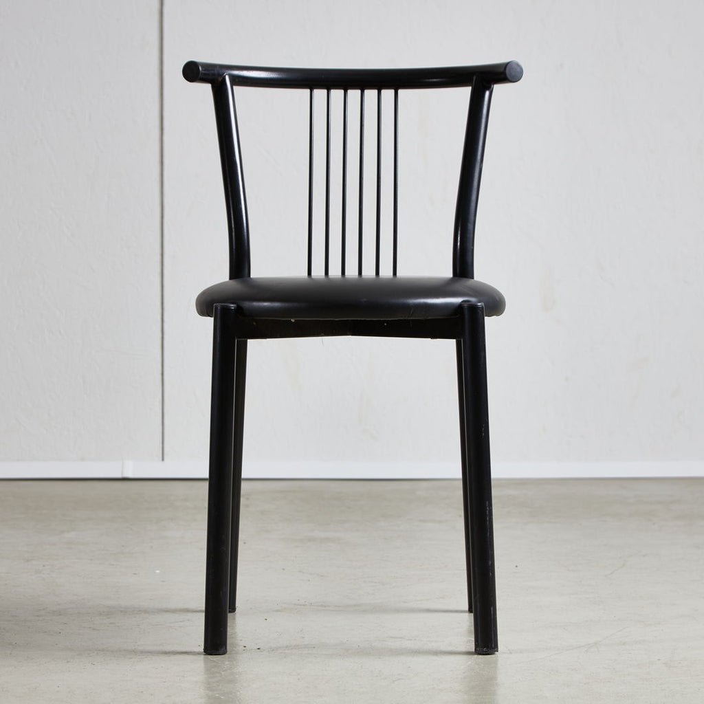 "Elegant shapes and fine lines of black metal tube frame, with round synthetic leather seats from the '80s Italy. There are six thin sticks in the center of the backrest. These dining room chairs are the perfect addition to a stylish home. Set of 4 in a good condition, with some scratches and signs of wear."