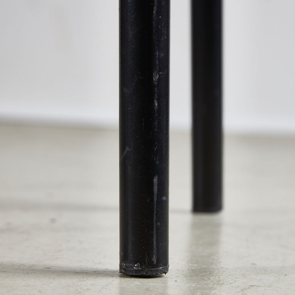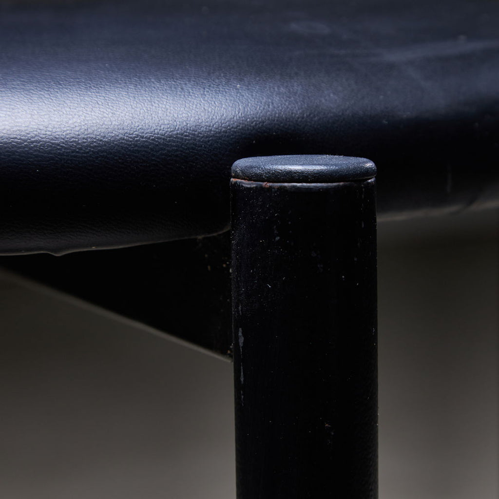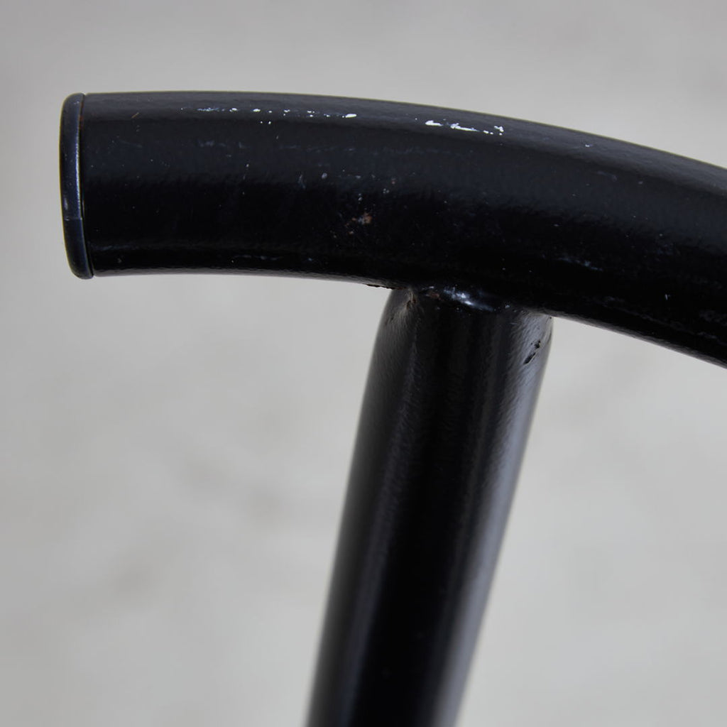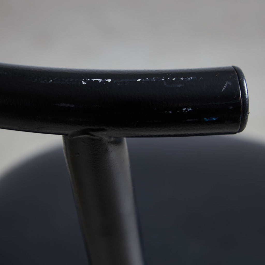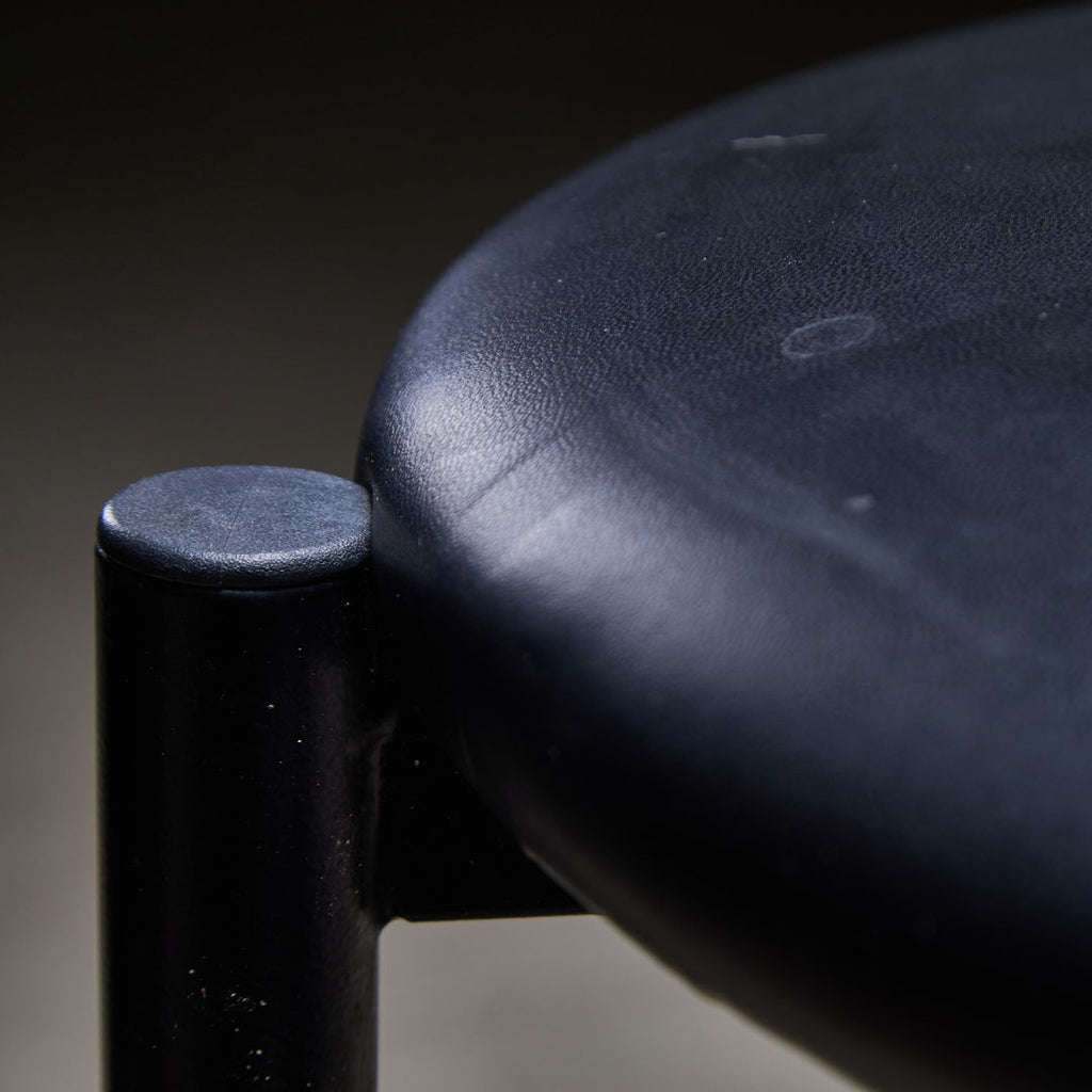 "Elegant shapes and fine lines of black metal tube frame, with round synthetic leather seats from the '80s Italy. There are six thin sticks in the center of the backrest. These dining room chairs are the perfect addition to a stylish home. Set of 4 in a good condition, with some scratches and signs of wear."