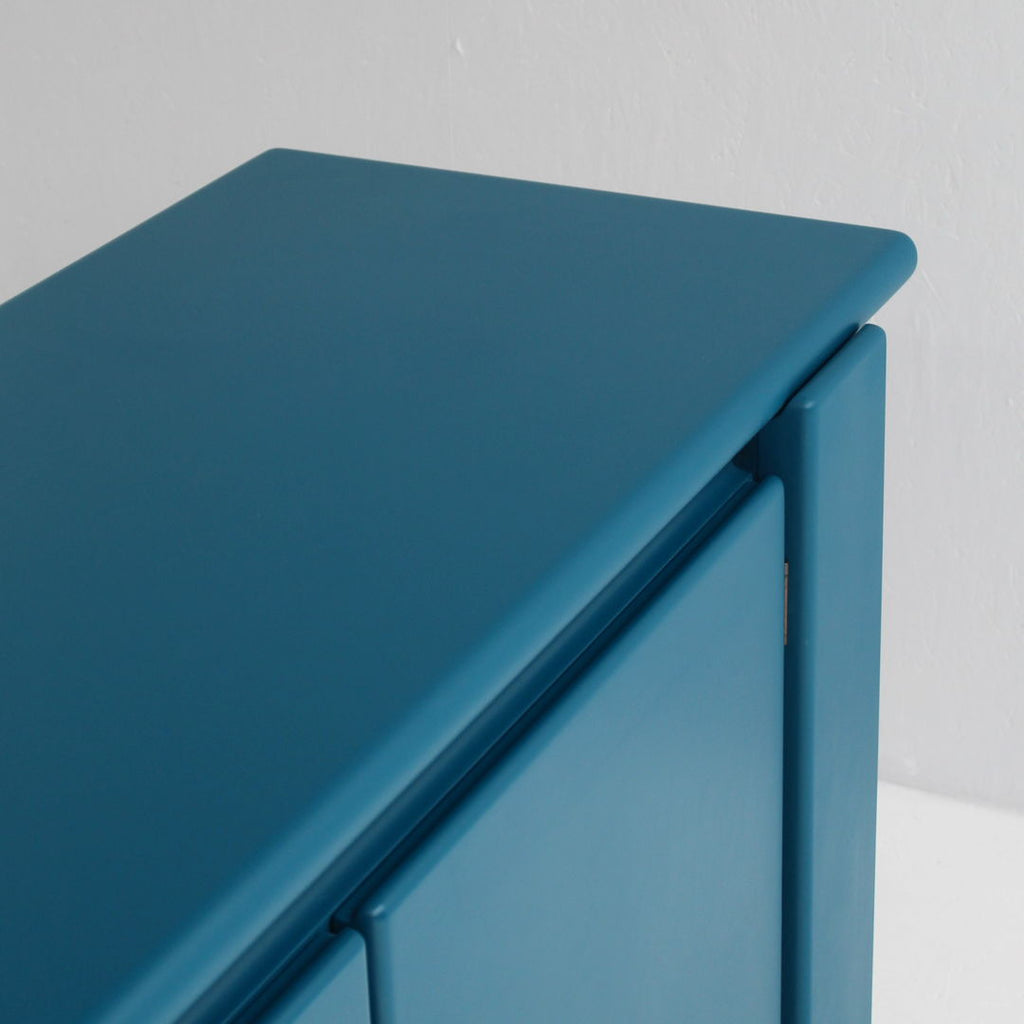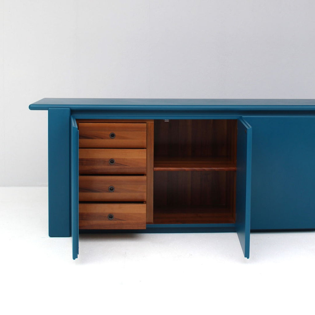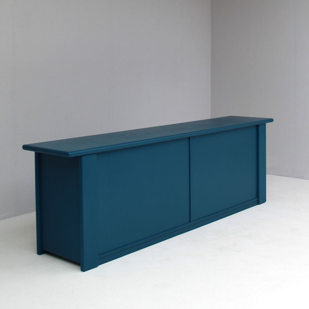 월넛 원목으로 만든 아름다운 파란색 찬장입니다. 문 하나에는 서랍이 있습니다. 크기 H79 x D52 x L248cm