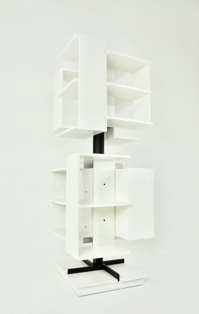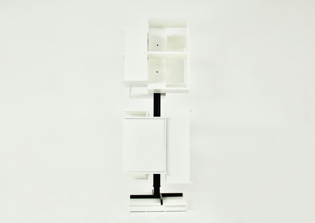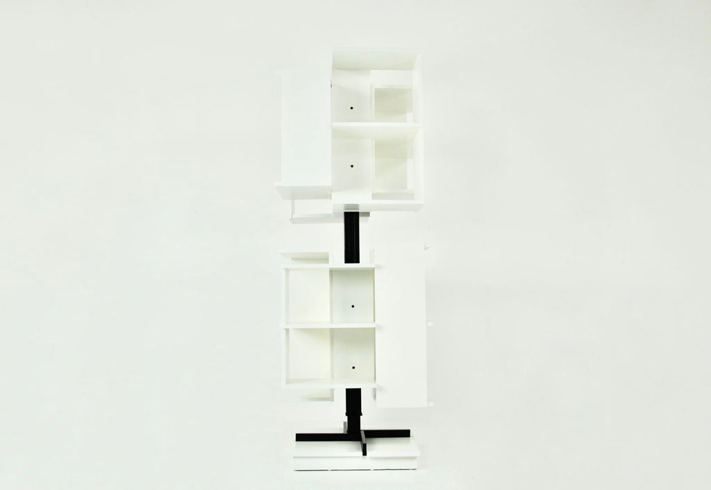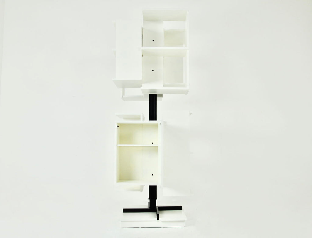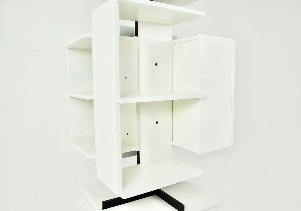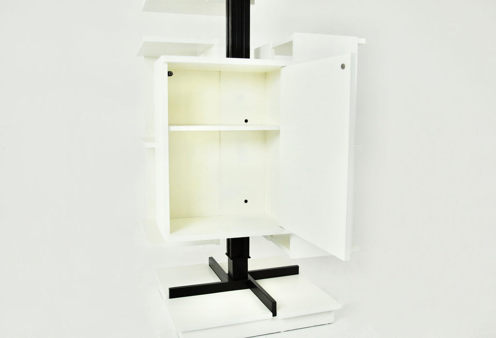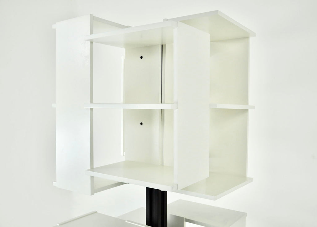 White wood and metal bookcase designed by Claudio Salocchi in the 1960s. Model: Centro. Can be turned on itself. Wear due to time and age.