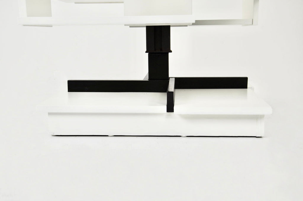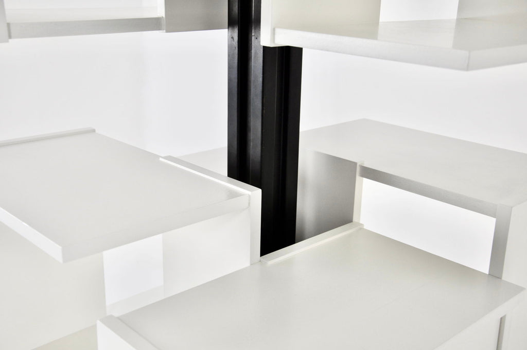 1960년대 Claudio Salocchi가 디자인한 흰색 목재와 금속 책장입니다. 모델: 센트로. 자체적으로 켜질 수 있습니다. 시간과 나이로 인한 마모.