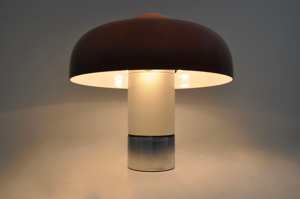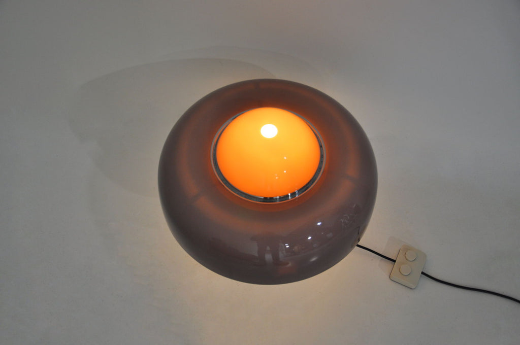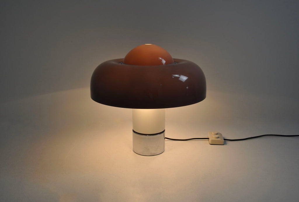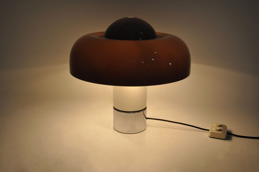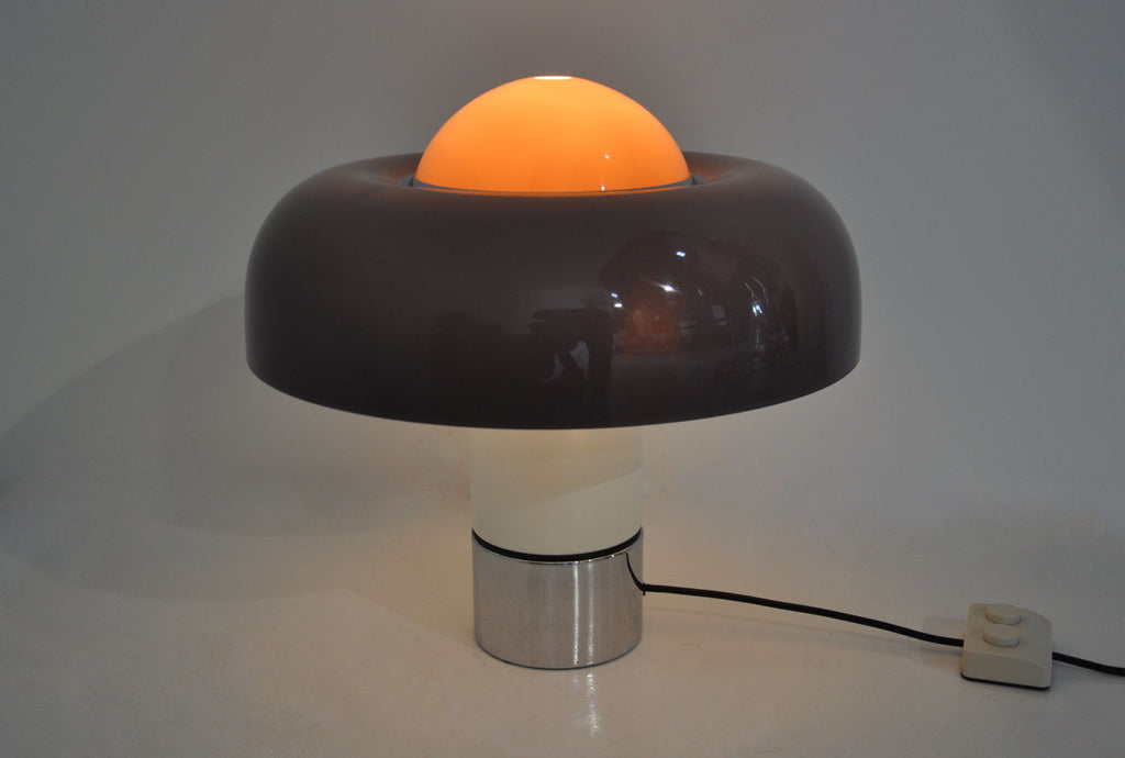 Luigi Massoni의 플라스틱과 금속 램프, 모델 Brumbury. 부분 또는 전체를 켜도록 선택하는 이중 스위치. 램프의 시간과 수명으로 인해 마모되었습니다.