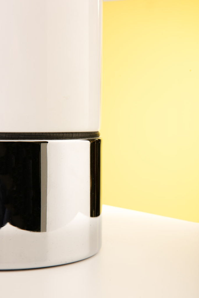 1972년 Luigi Massoni가 이탈리아 iGuzzini를 위해 제작한 'Brumbury' 테이블 램프는 흰색 아크릴 갓으로 보완된 매끈한 크롬 도금 및 흰색 래커 처리된 금속 베이스를 자랑합니다. 4개의 E14 소켓(하단 전등갓 아래 3개, 상단 전등갓 아래 1개)을 수용하며 각 섹션을 독립적으로 조명할 수 있습니다. 램프는 여전히 흠잡을 데 없는 상태를 유지하고 있습니다. 본연의 빈티지 매력을 간직한 이 작품은 독특한 성격과 역사를 간직하고 있습니다.
