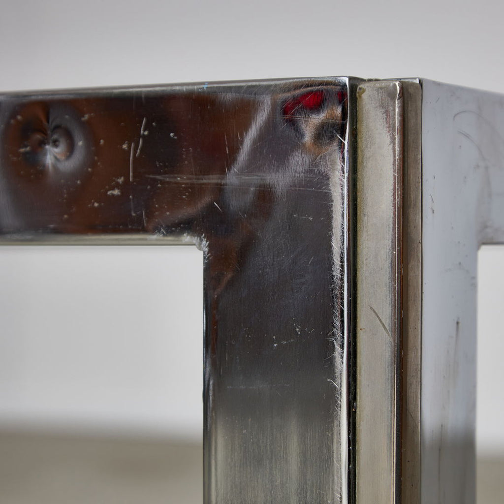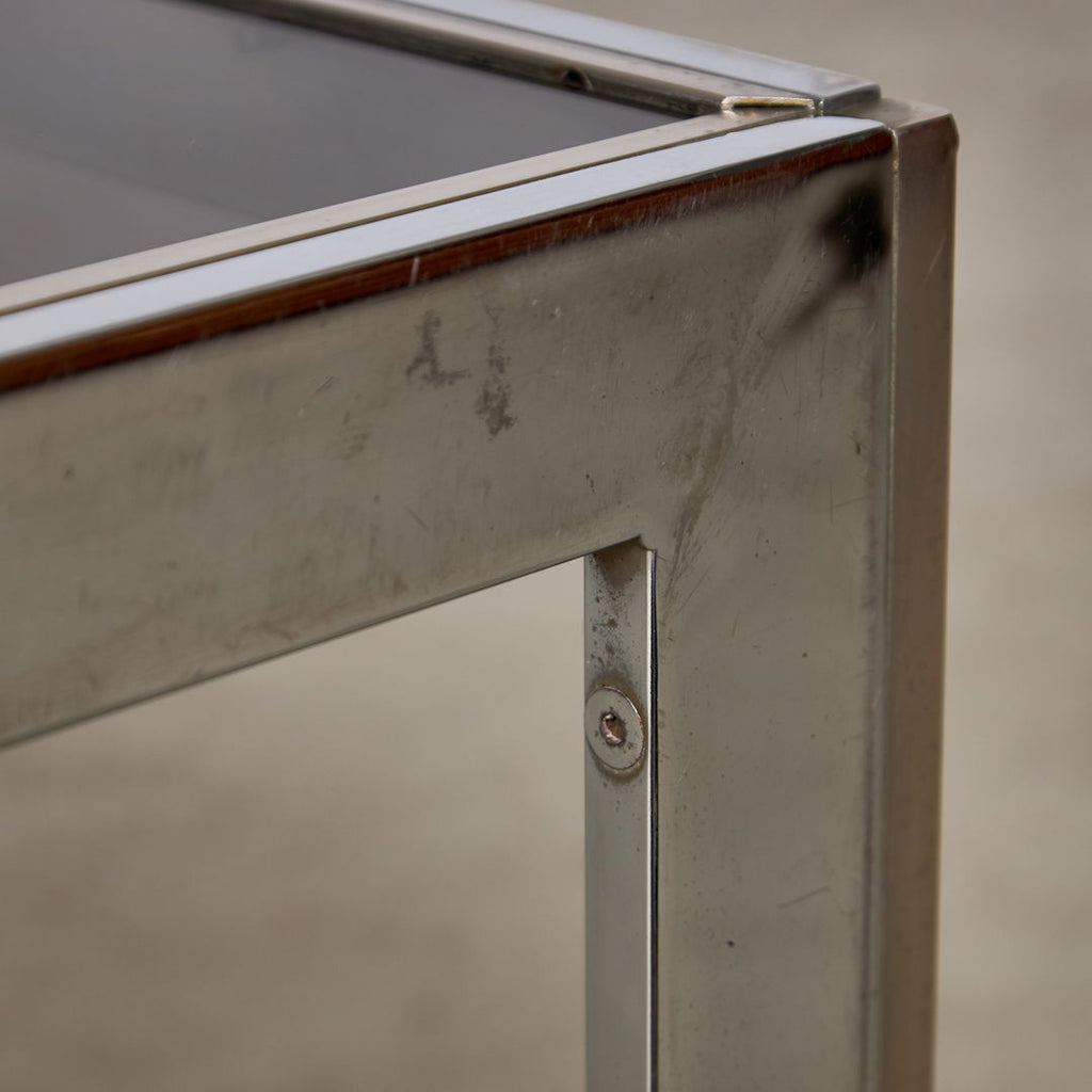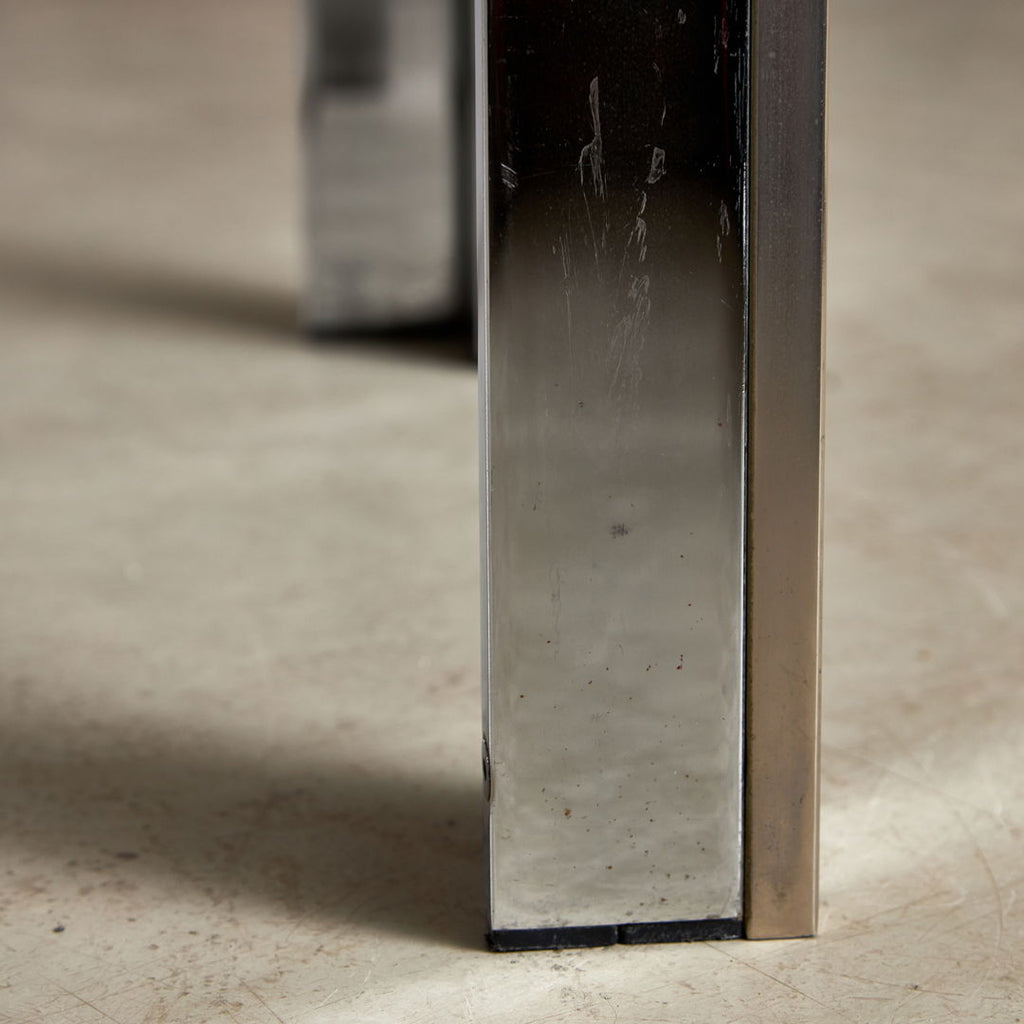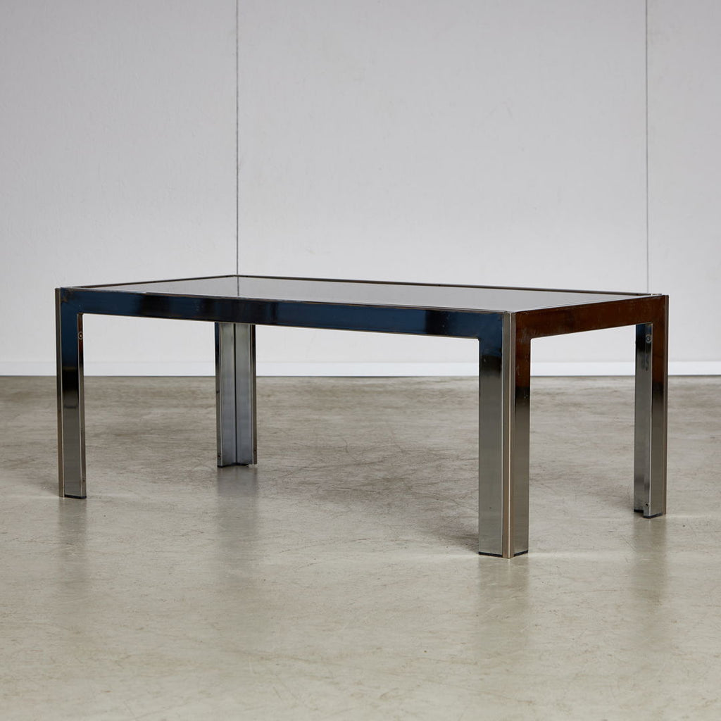 This 1970s coffee table features a bold and futuristic design with chrome and smoked glass materials. Reflecting the innovative and boundary-pushing spirit of its era, this piece blends effortlessly with a range of interior styles, from vintage to modern and minimalist. On one of the legs, only half of the black rubber protector is present, the chrome and the glass plate are scratched in places. The chrome has a minor dent on one side.
