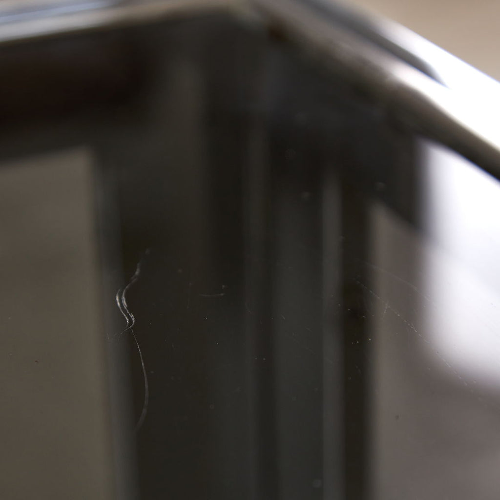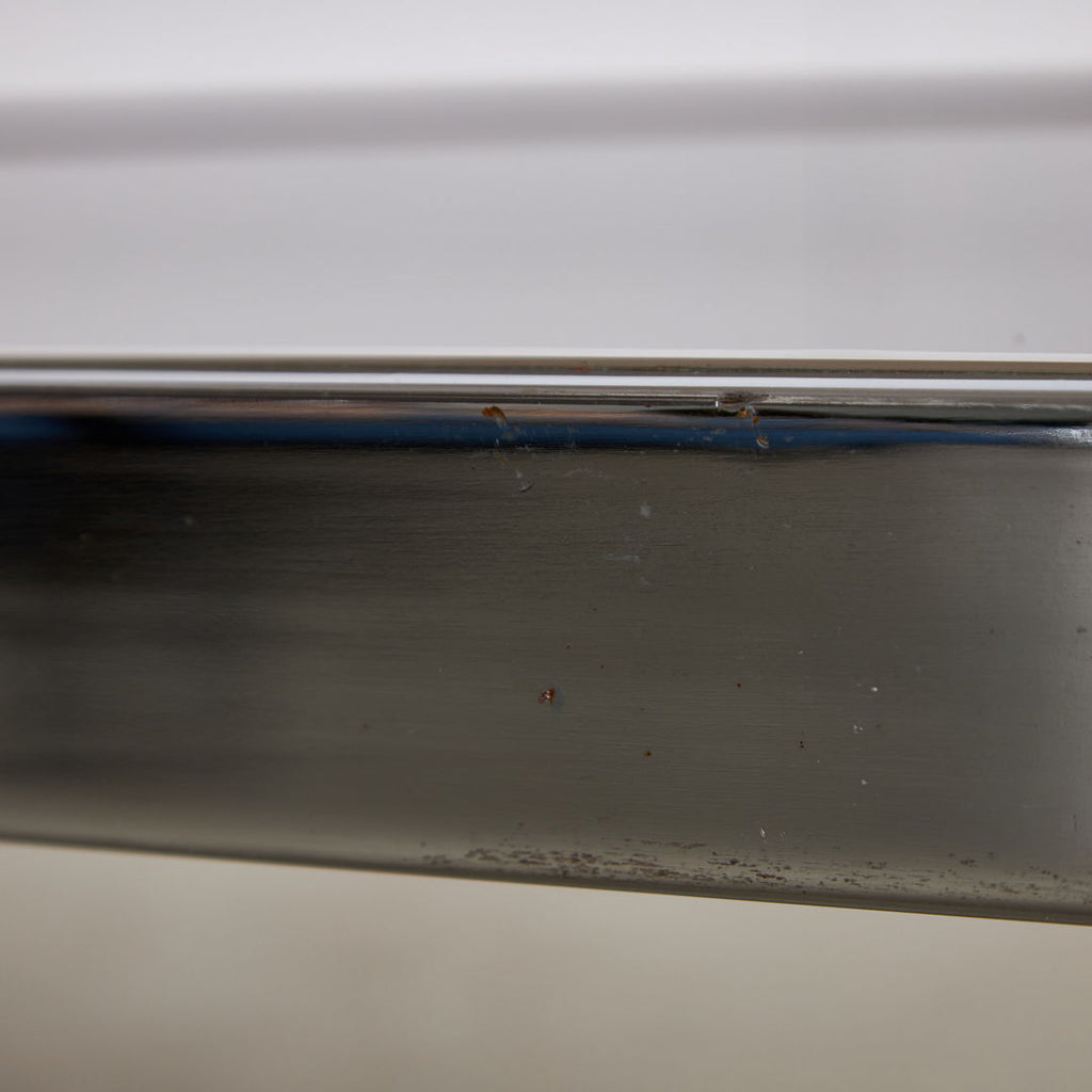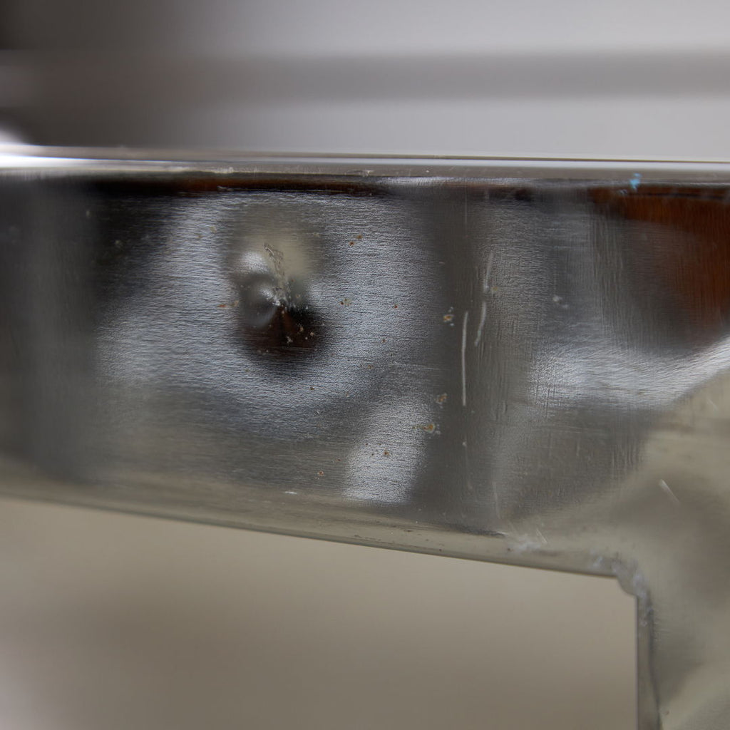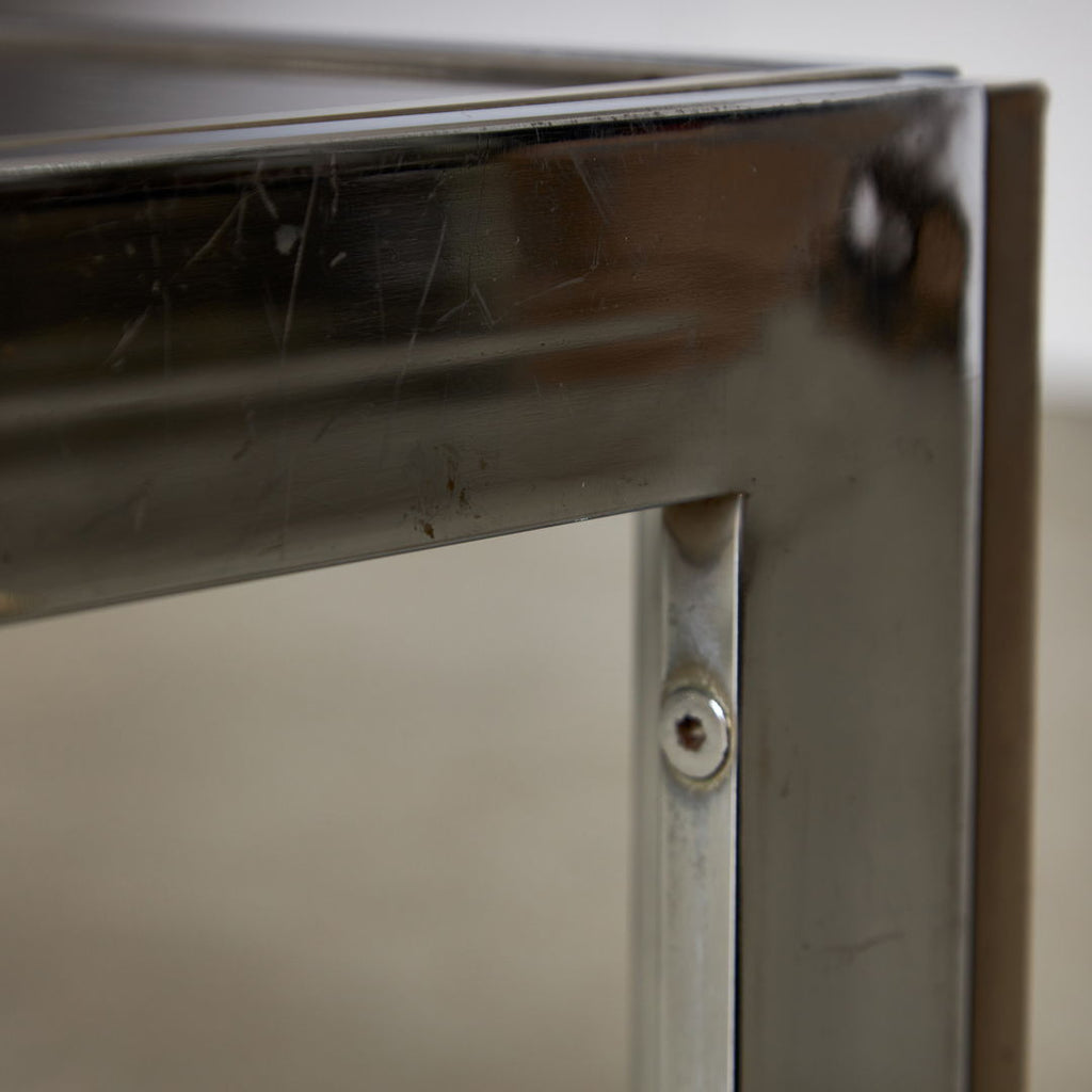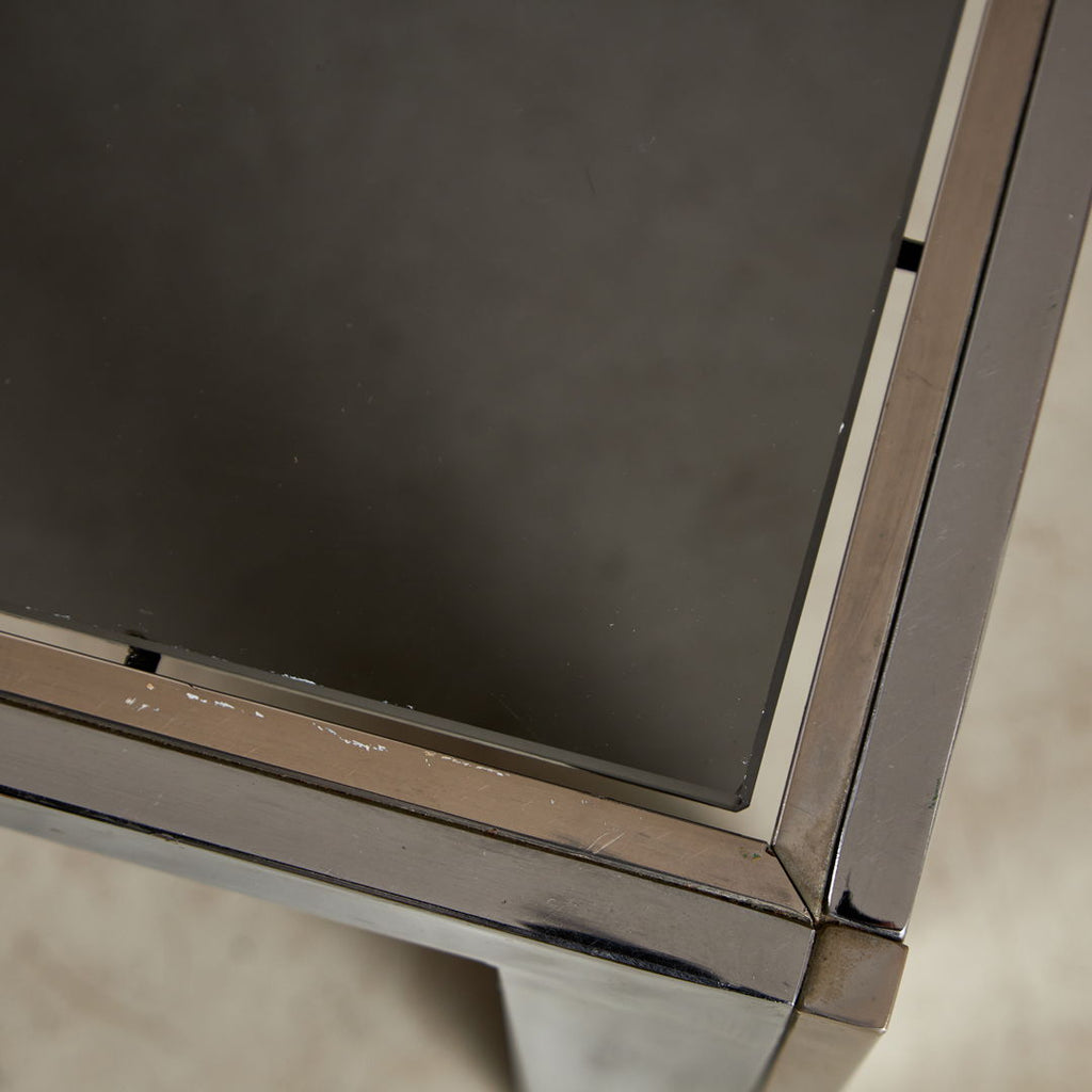 This 1970s coffee table features a bold and futuristic design with chrome and smoked glass materials. Reflecting the innovative and boundary-pushing spirit of its era, this piece blends effortlessly with a range of interior styles, from vintage to modern and minimalist. On one of the legs, only half of the black rubber protector is present, the chrome and the glass plate are scratched in places. The chrome has a minor dent on one side.