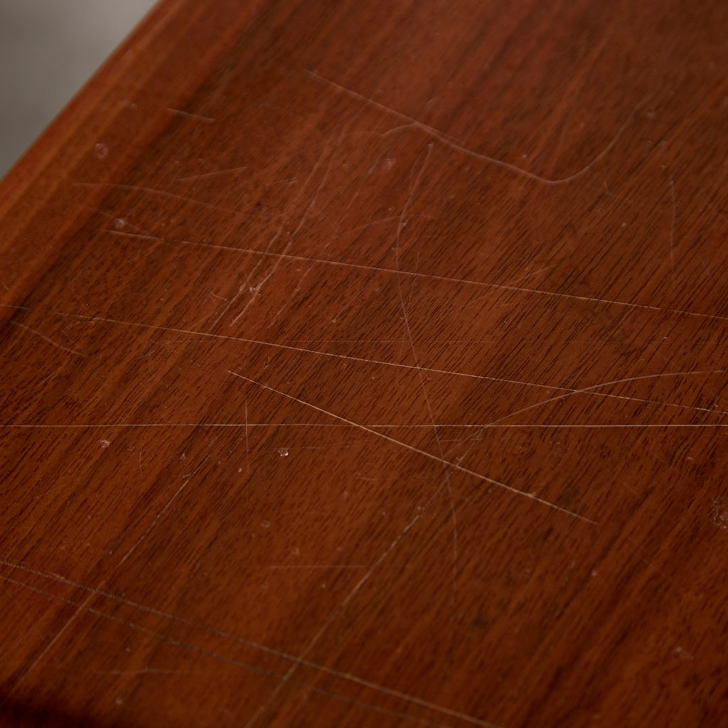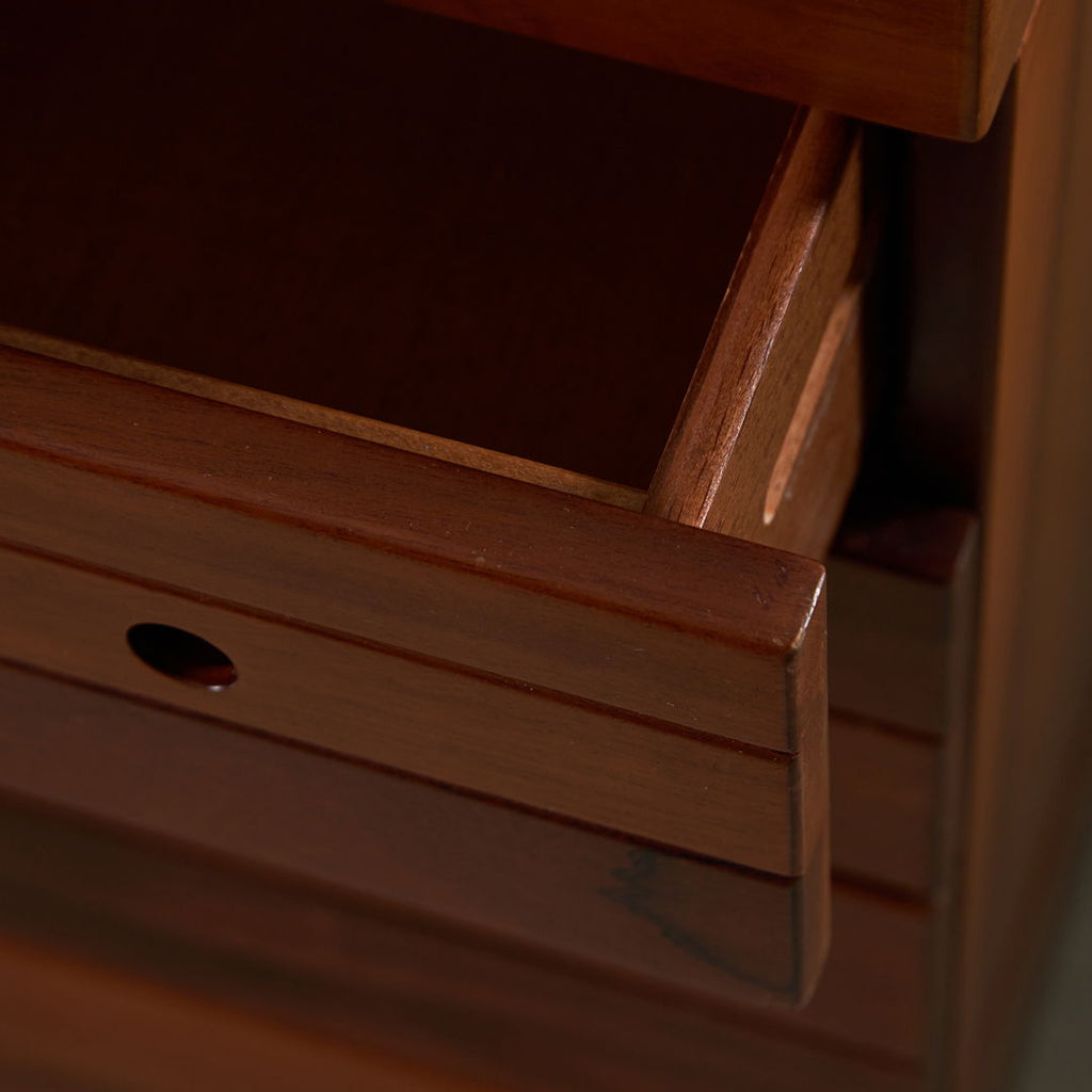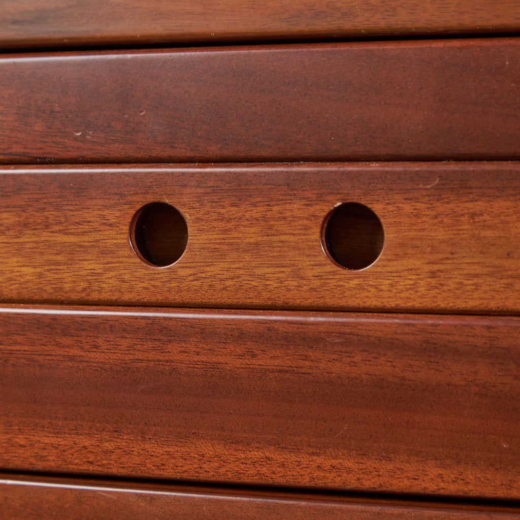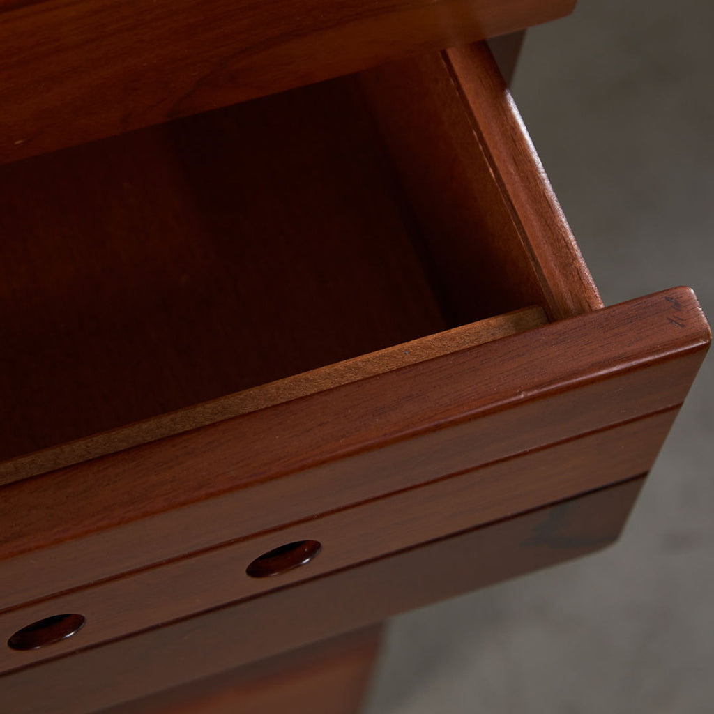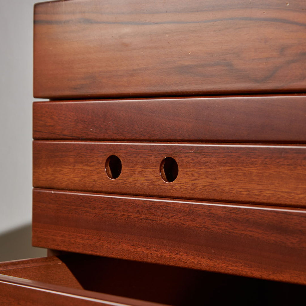 "서랍에 이중 원형 손잡이가 새겨진 6단 호두 찬장. 내구성이 뛰어나고 스마트하고 우아한 수납 솔루션을 제공합니다. 1970년대에 디자인되어 오늘날에도 어떤 인테리어 스타일에도 잘 어울립니다. 결함 없이 상태가 매우 좋습니다. 하지만 약간의 표면 긁힘."