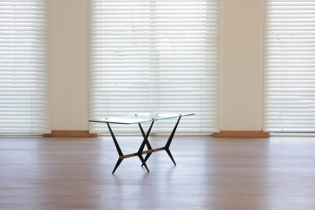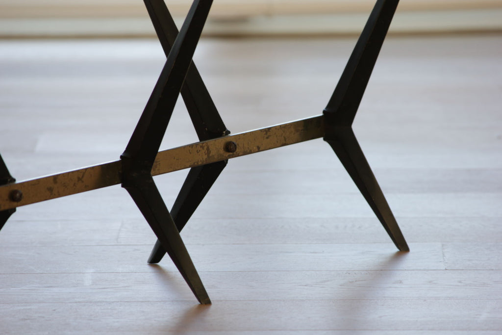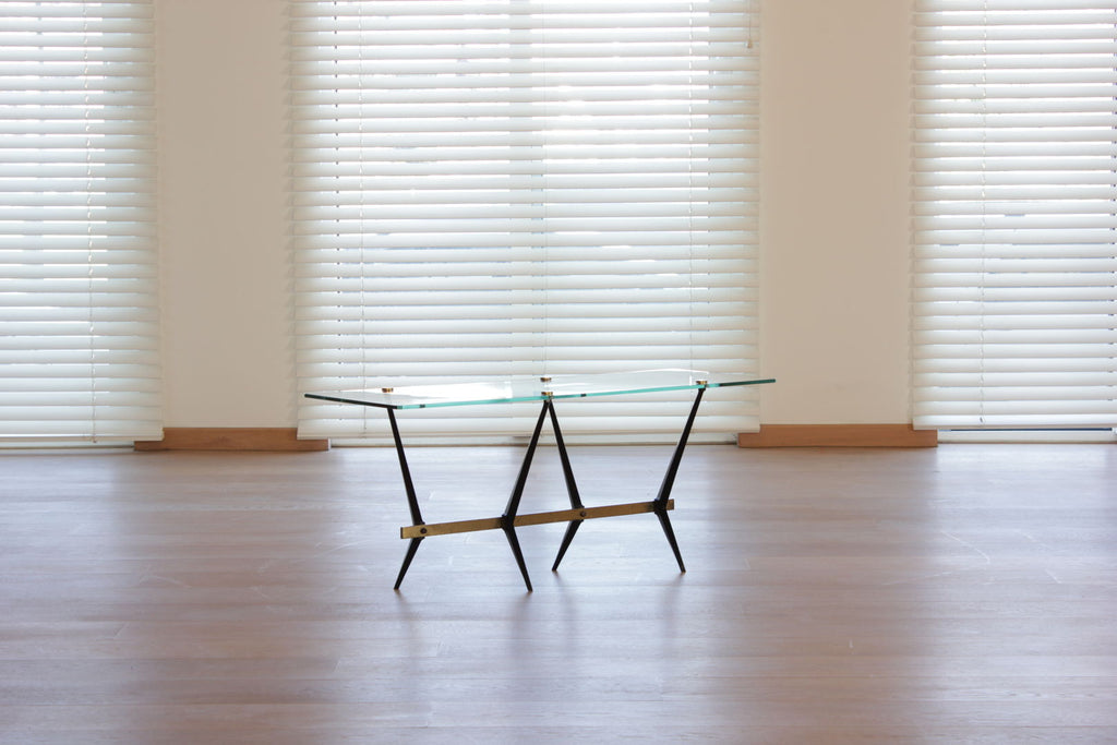 Frangi Milano 1950년대 이탈리아를 위한 Angelo Ostuni의 커피 테이블 유리, 래커 처리된 금속 및 황동 높이 42cm, 폭 96cm, 깊이 36cm