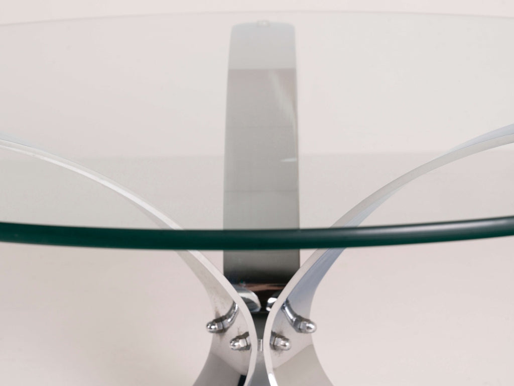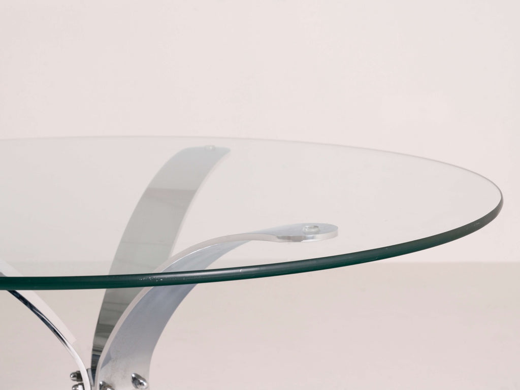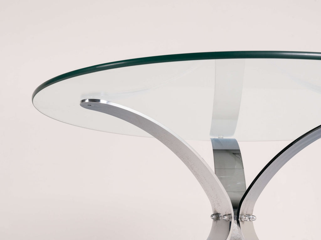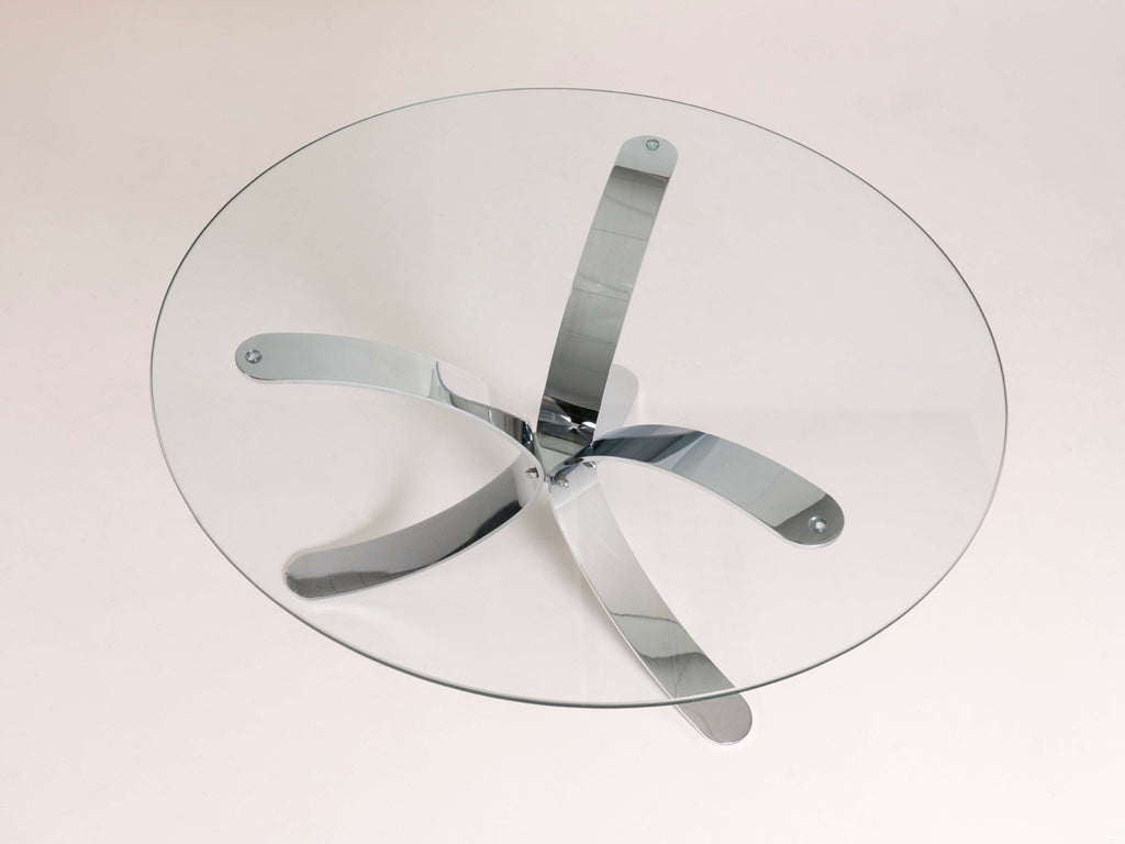 이 커피 테이블에는 유리 상단을 지지하는 3개 포인트 크롬 베이스가 있습니다.