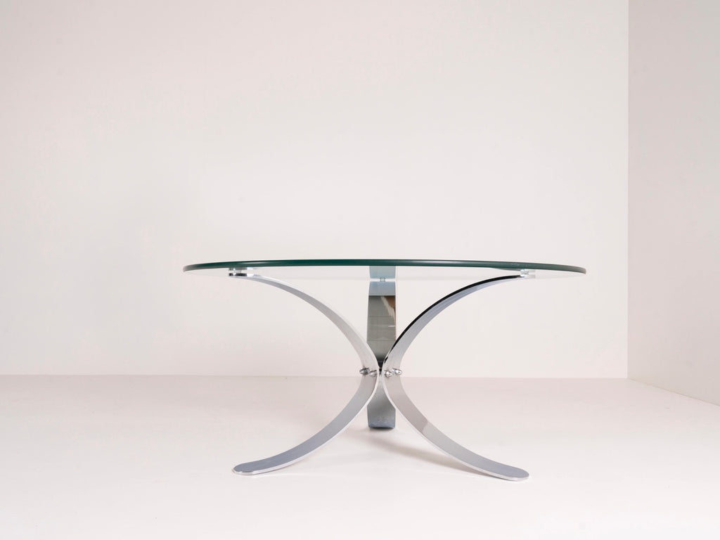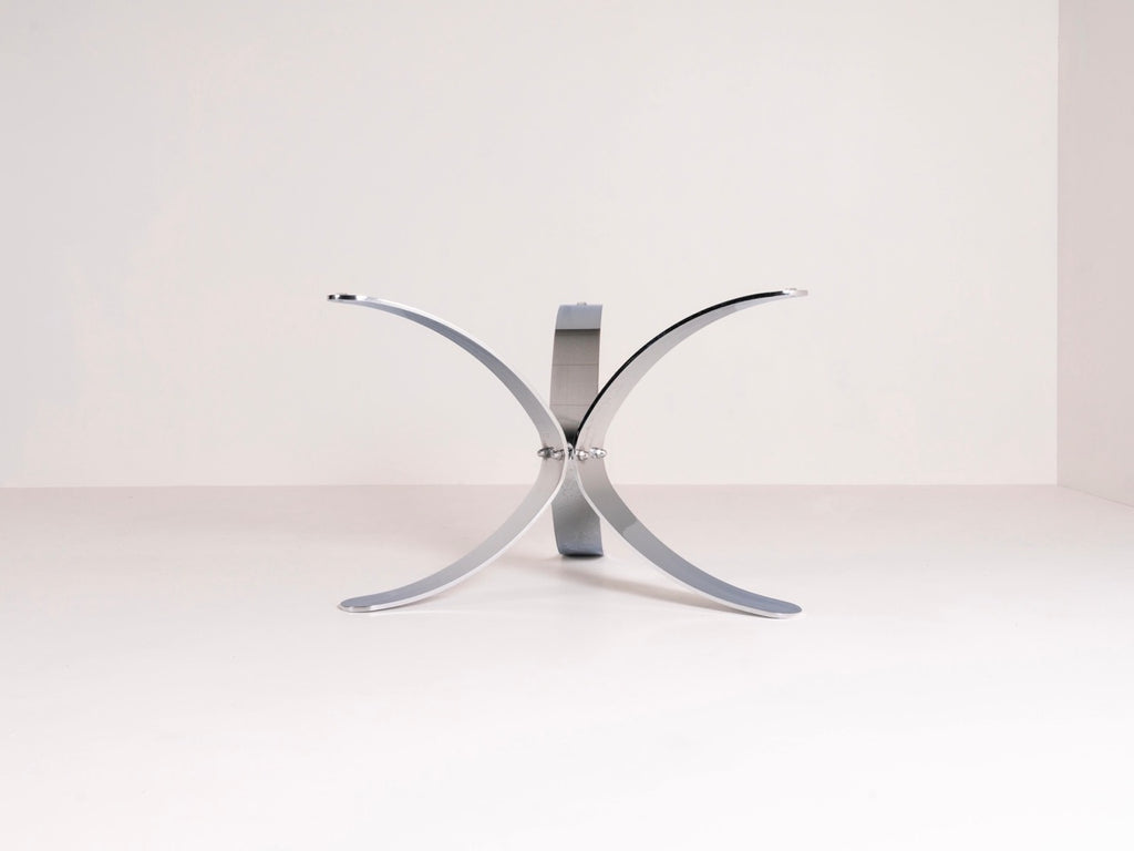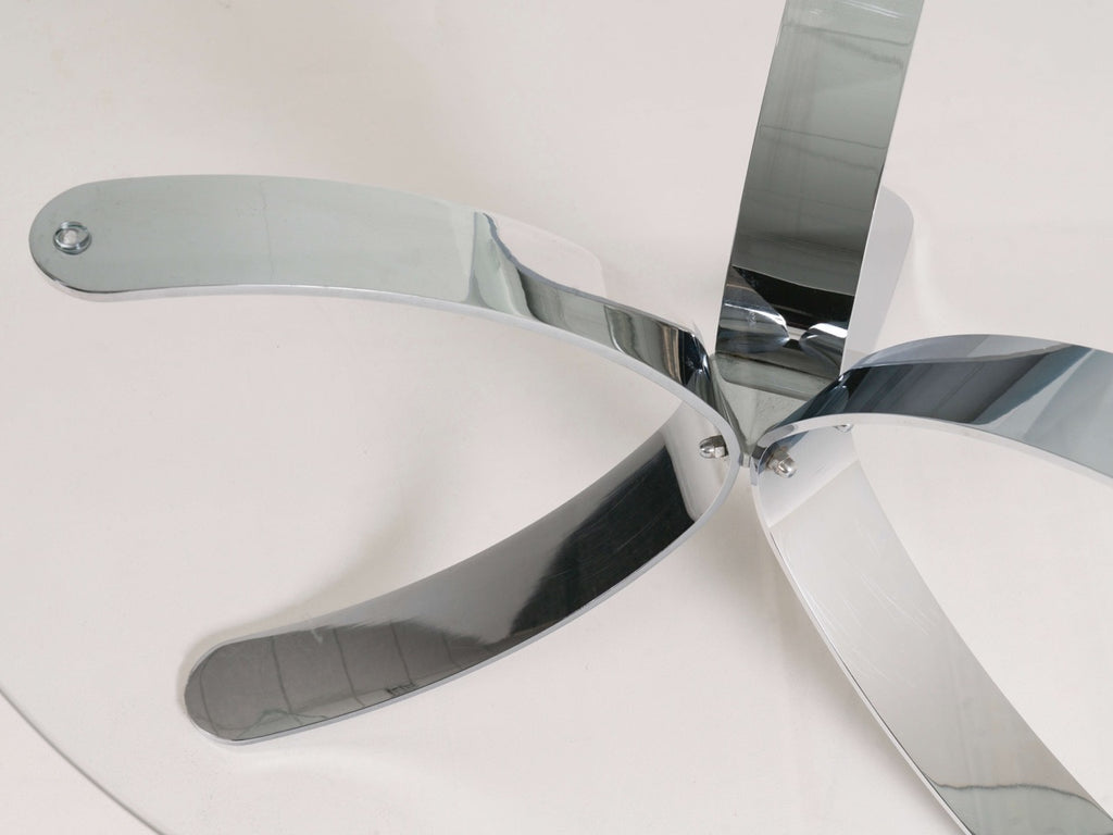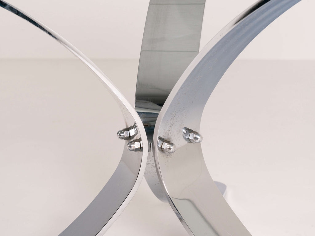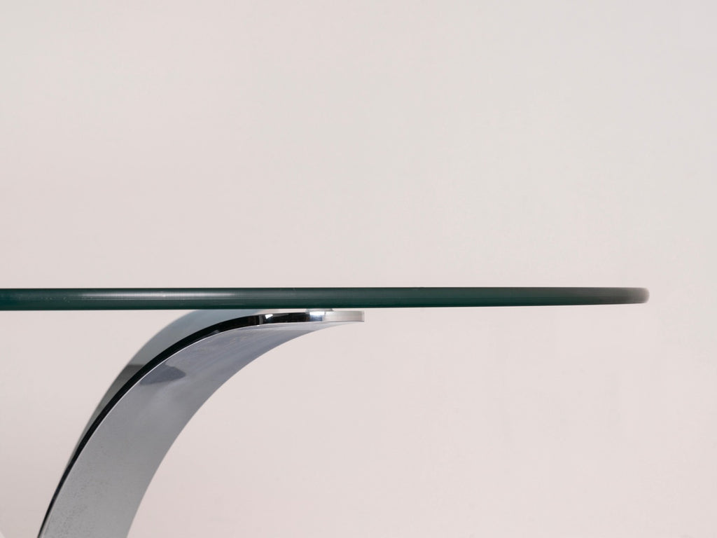 이 커피 테이블에는 유리 상단을 지지하는 3개 포인트 크롬 베이스가 있습니다.