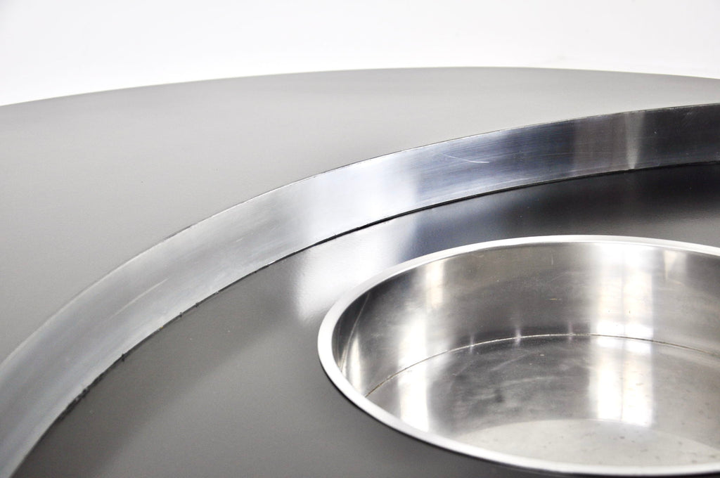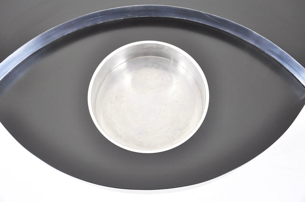 검은색 목재와 금속 소재의 커피 테이블과 얼음통이 통합되어 있습니다. 커피 테이블이 저절로 켜집니다. 윌리 리조(Willy Rizzo)가 디자인했습니다. 커피 테이블의 노후화로 인한 마모.
