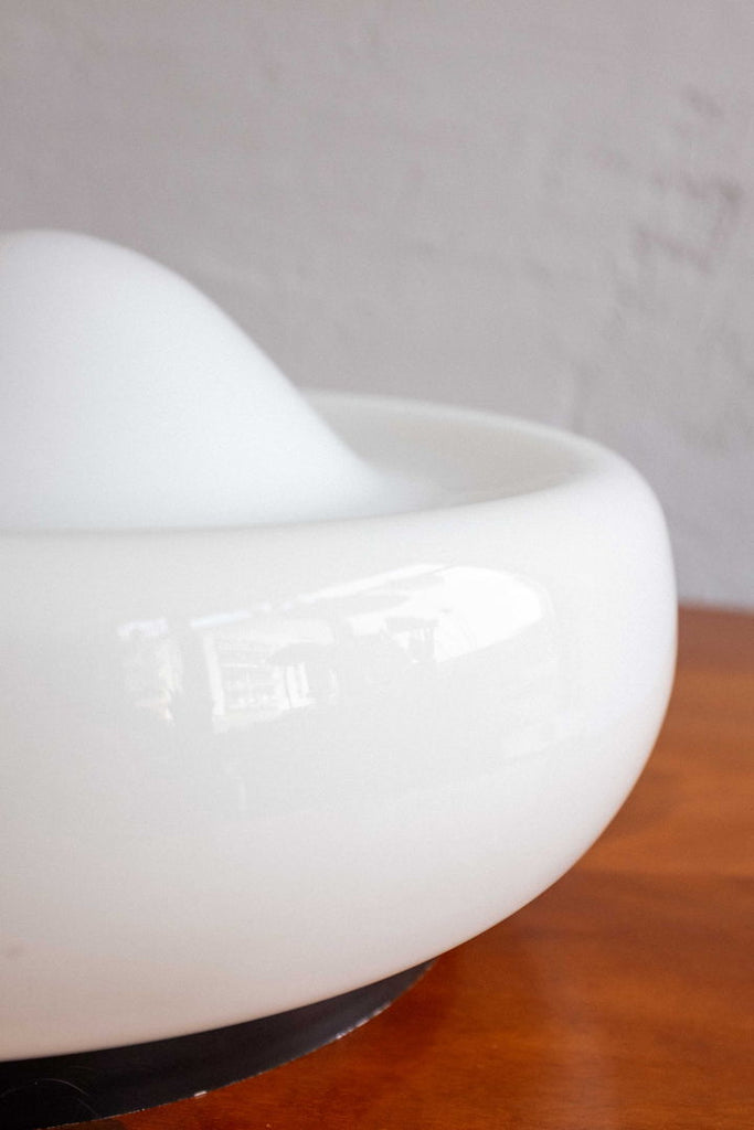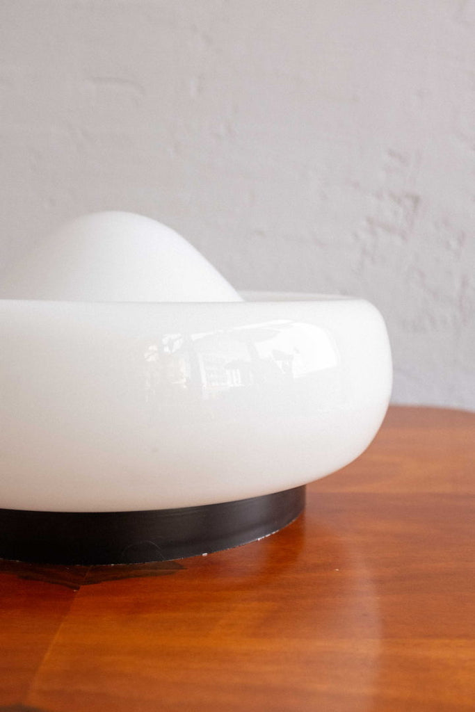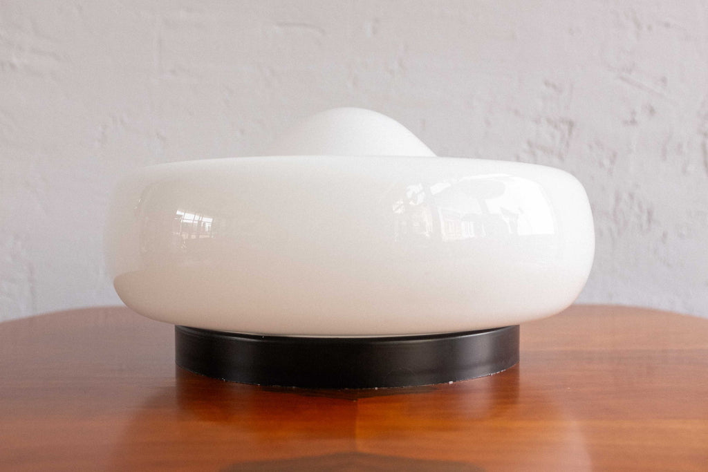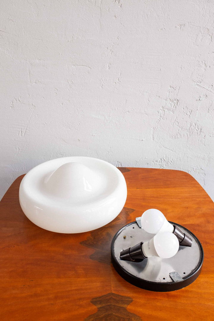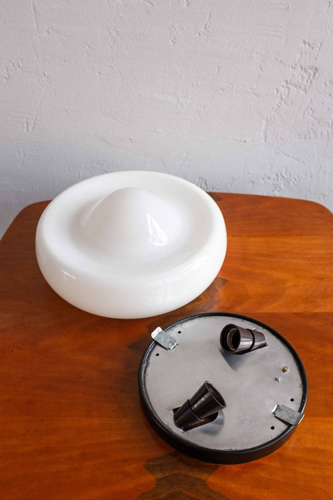 Czechoslovak wall lamp made by Osvětlovací Sklo in Valašské Meziříčí in the 80s. Milk glass lampshade on a black painted metal base. Small chip in the middle of the glass, visible only in a very close look. Completely restored and rewired, takes two E27 light bulbs.