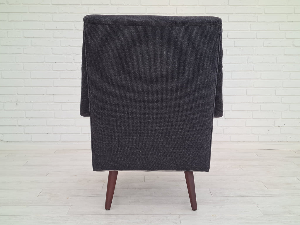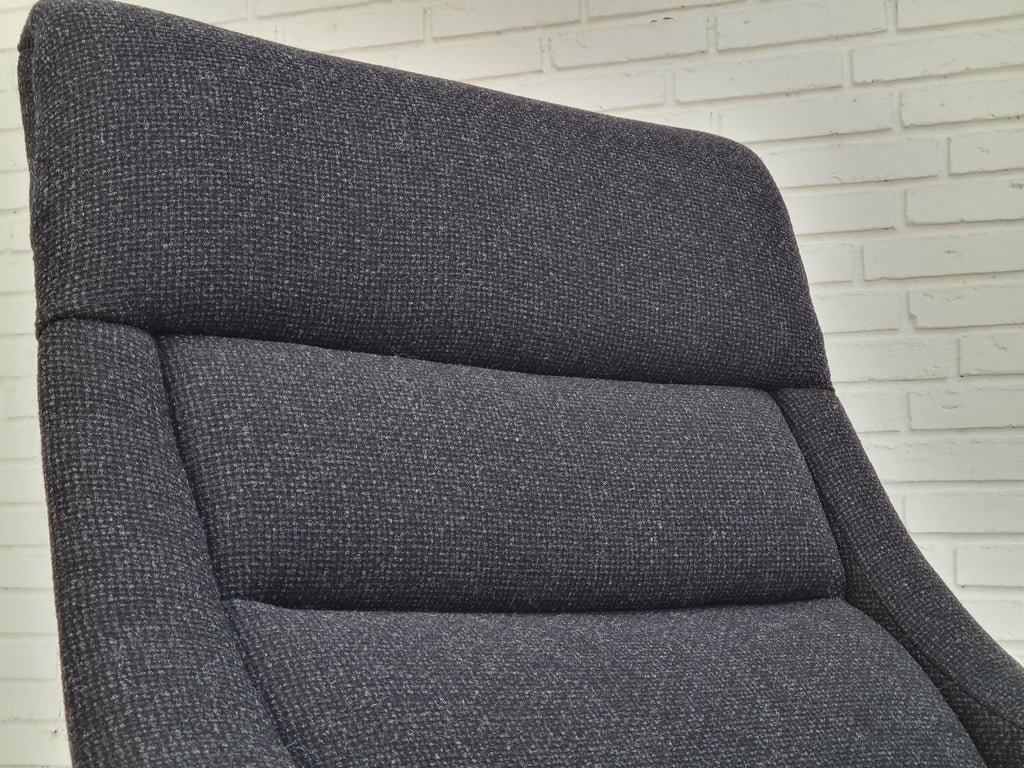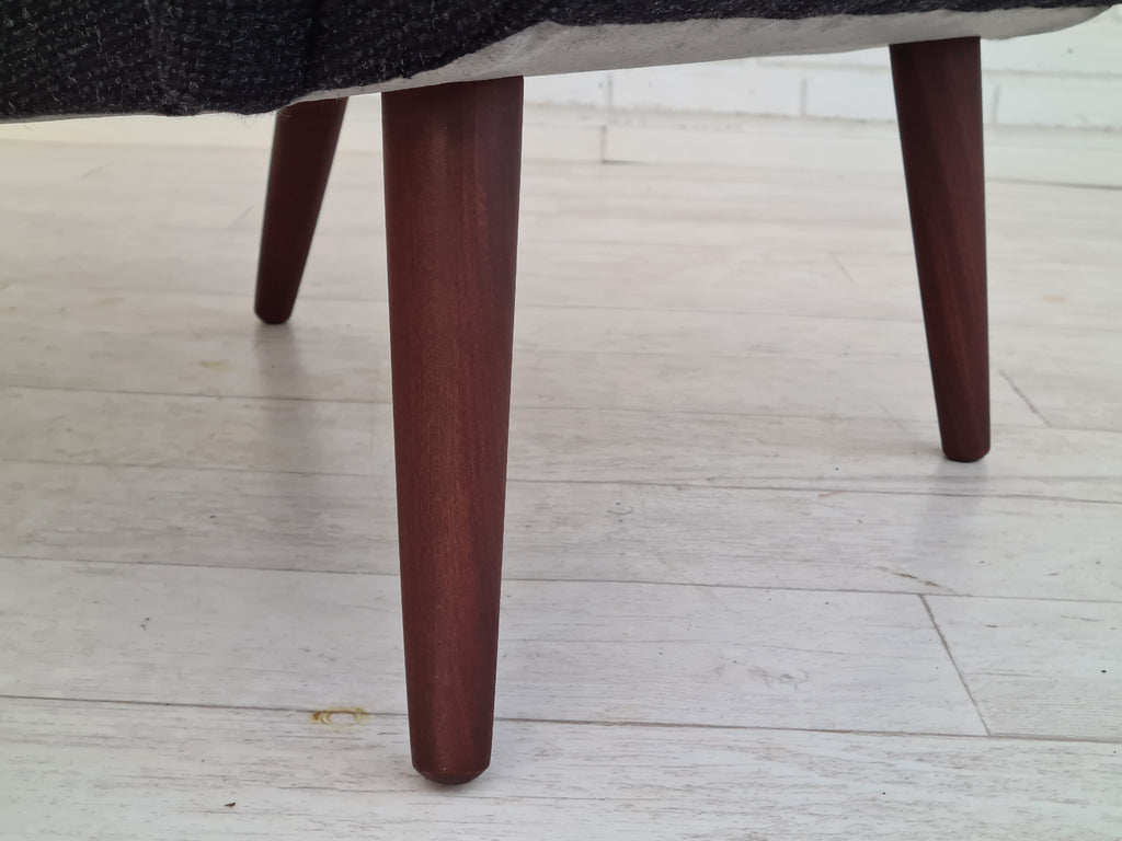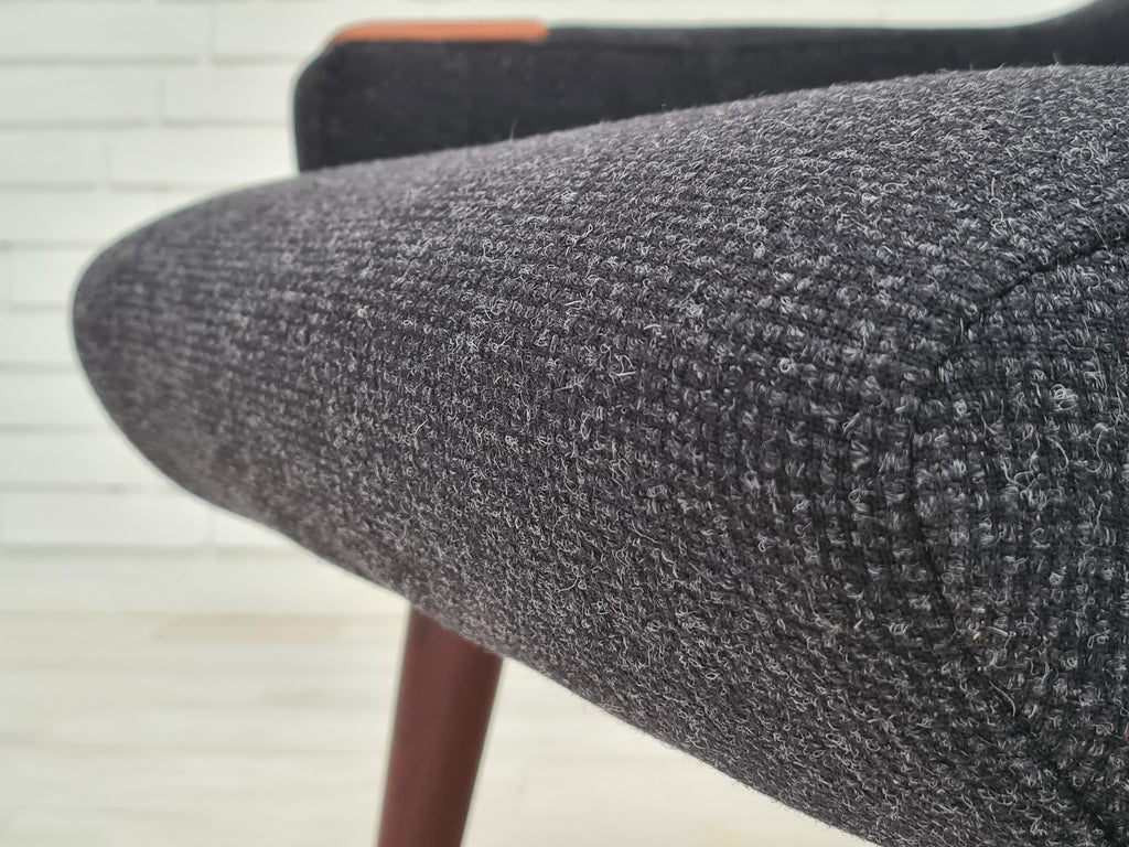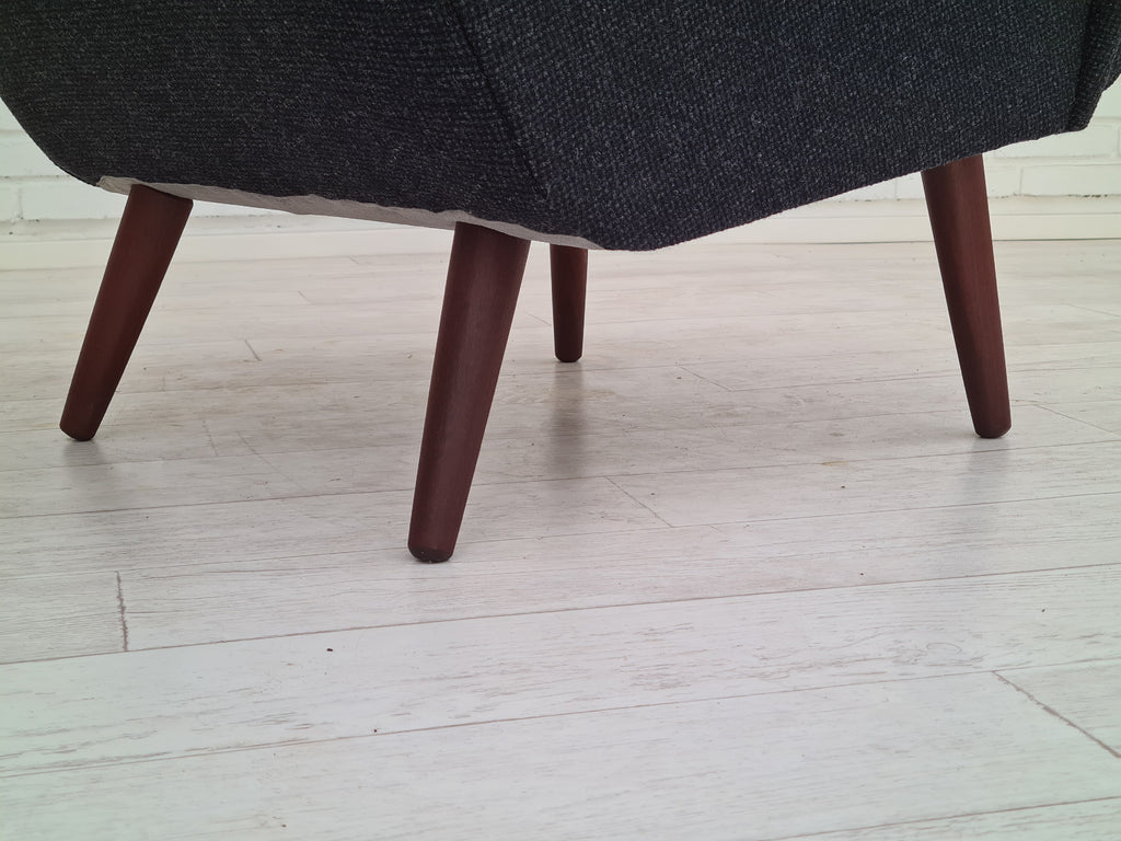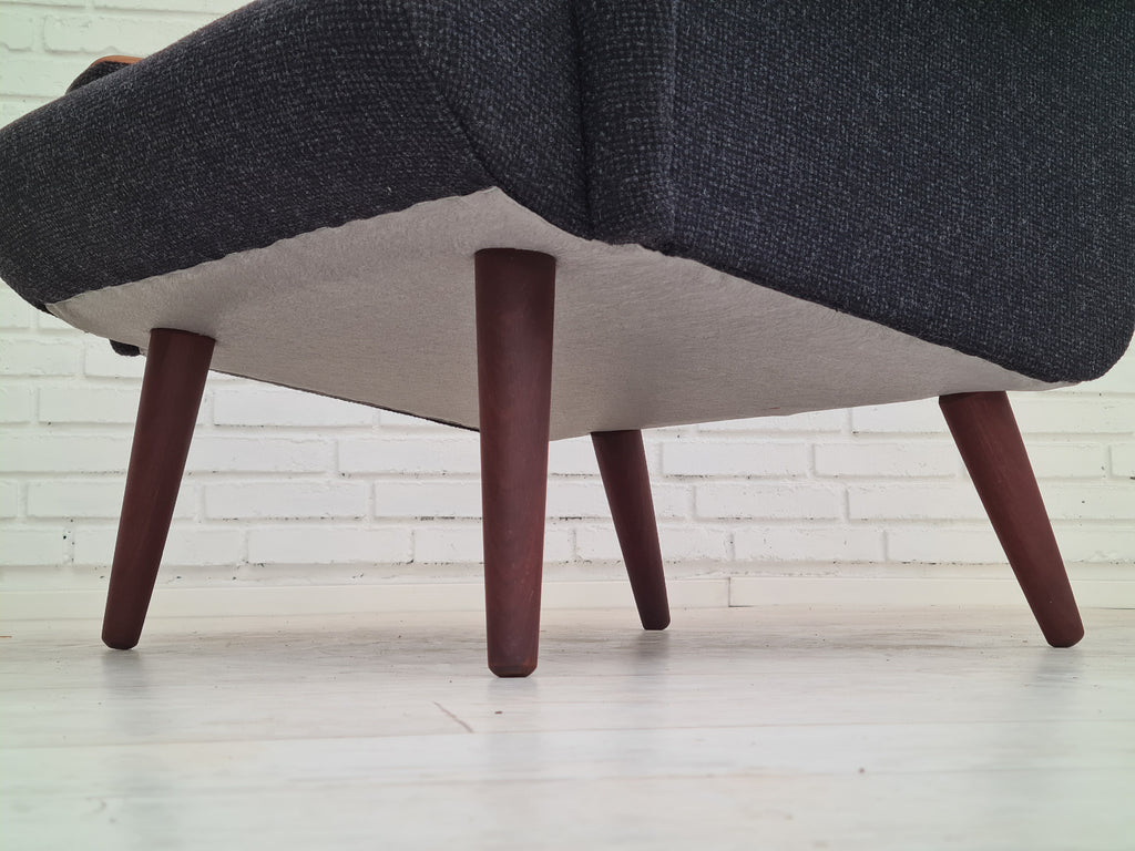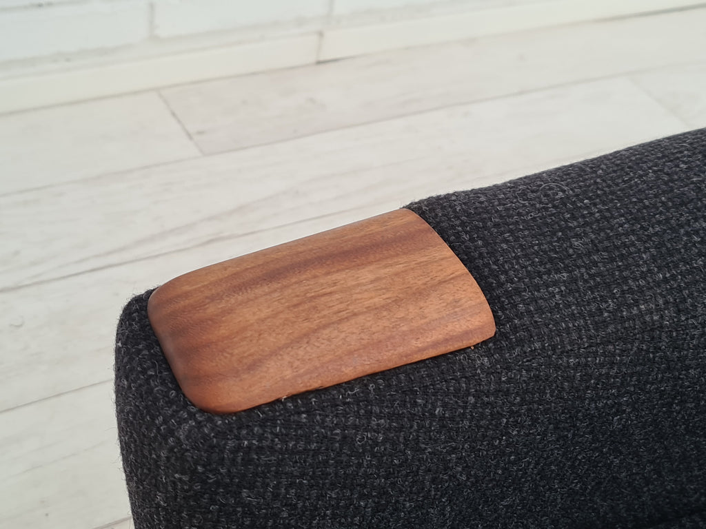 고급 차콜 그레이 가구 양모 원단으로 리노베이션을 마쳤습니다. 티크 다리와 손톱. 시트의 원래 스프링은 유지됩니다. 1970년경에 덴마크 가구 제조업체에서 제조했습니다.