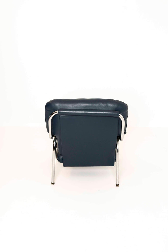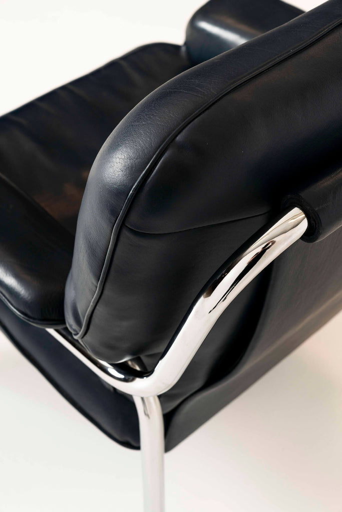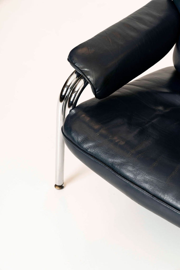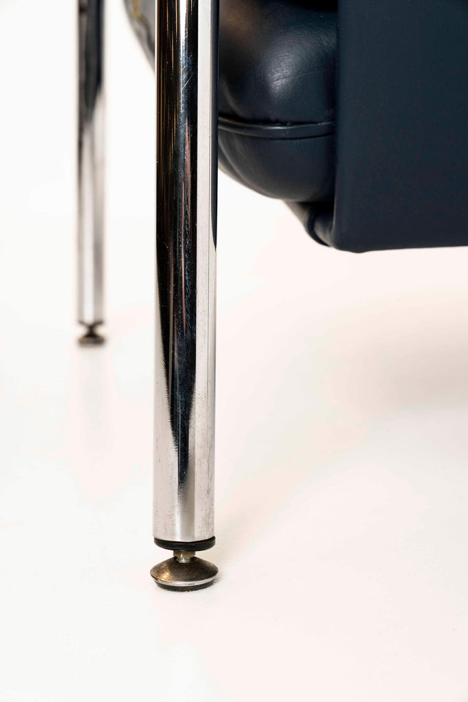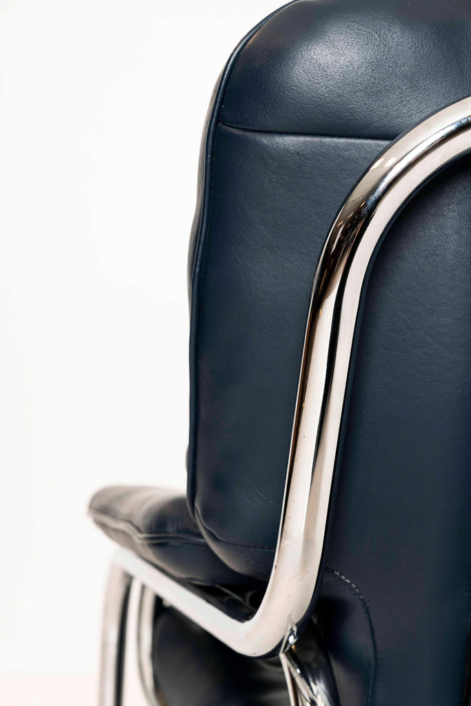 매우 편안한 체어이며, 팔걸이뿐만 아니라 크롬 베이스와 두꺼운 짙은 파란색 가죽 시트가 있습니다. 발은 바닥에 맞게 조절할 수 있습니다. 세월에 따른 약간의 사용감이 있지만 전체적으로 상태가 좋습니다.