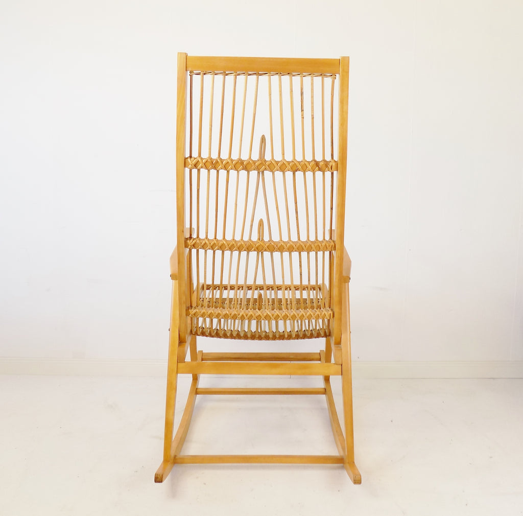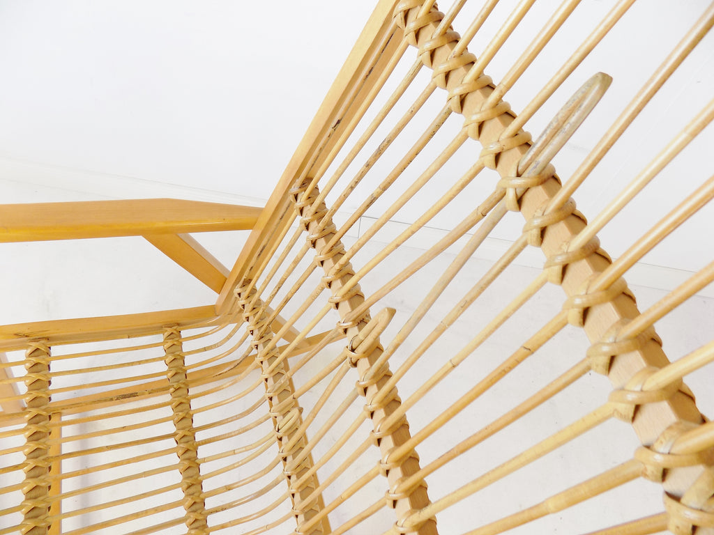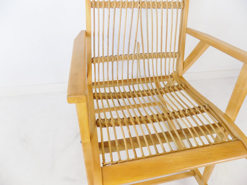 가벼운 너도밤나무로 만든 프레임과 고리버들로 만든 시트와 등받이는 최소한의 마모 흔적만 보입니다. 요청 시 원래의 녹색 시트 커버를 제공할 수 있습니다.