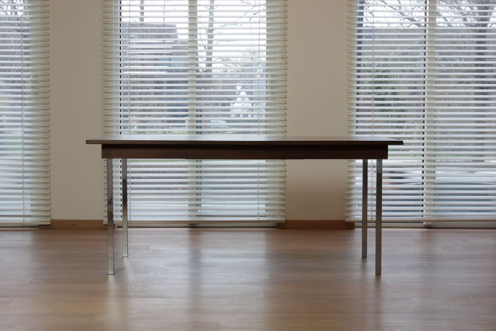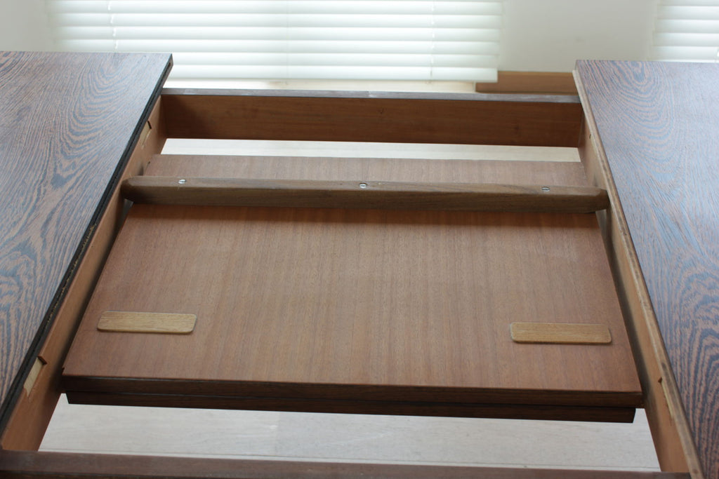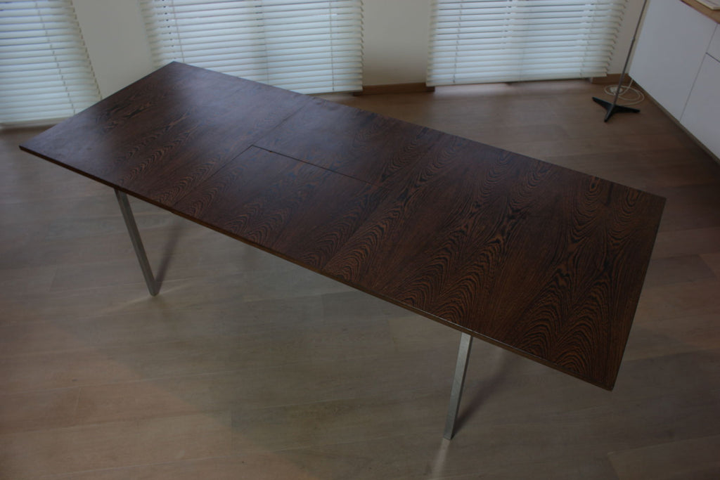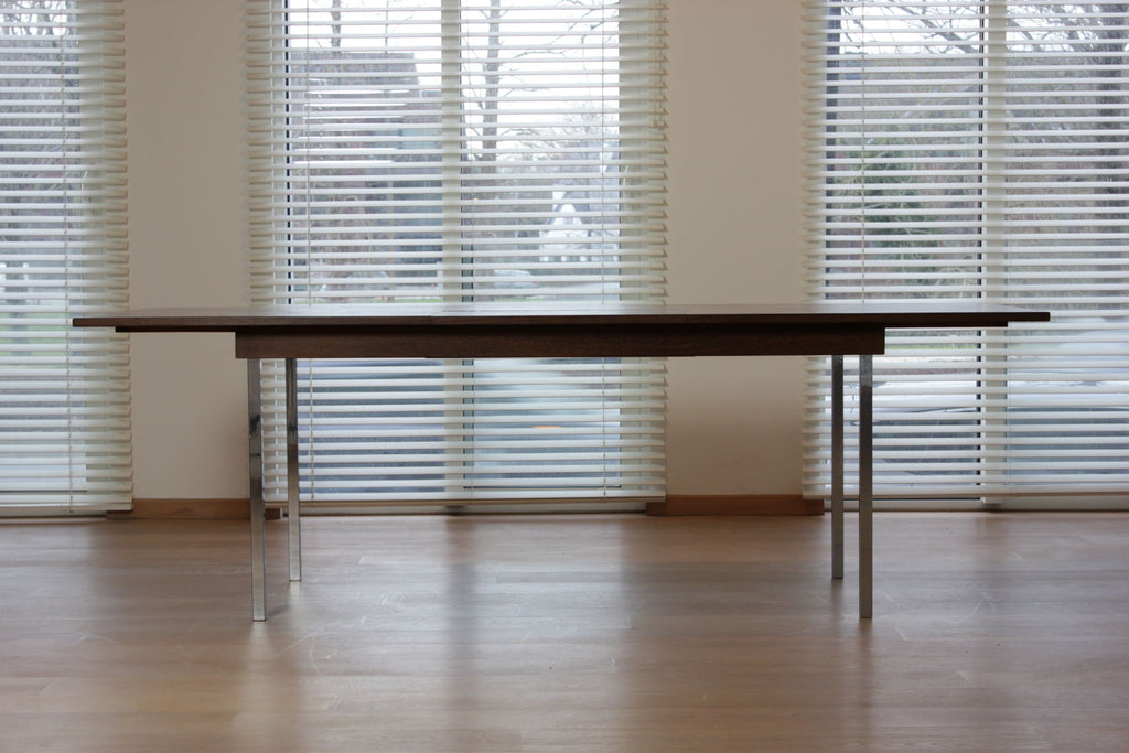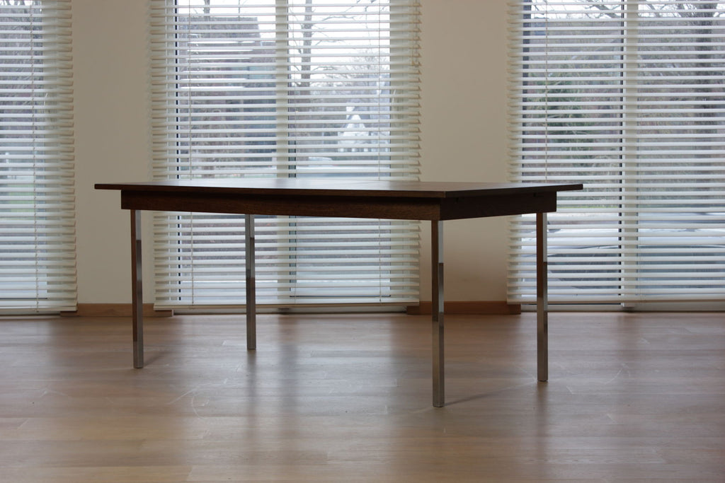 Alfred Hendrickx의 Belform 1960년대 식탁 Wenge와 크롬 너비 232cm/172cm, 깊이 90cm, 높이 76cm Alfred Hendrickx(b.1931, Mechelen)는 1950년대와 1960년대 역동적인 시대에 저명한 디자이너로 등장했습니다. 디자인 세계에 대한 그의 영향력 있는 공헌으로 기념된 Hendrickx는 지울 수 없는 흔적을 남겼고, 그에게 전후 유럽에서 가장 중요한 디자이너 중 한 사람이라는 칭호를 안겨주었습니다. Hendrickx는 Expo '58에서 선보인 Belform과의 작업으로 널리 인정을 받았습니다. Willy Van Der Meeren, Jos De Mey, Lucien Engels와 같은 유명한 동시대 디자이너들과 함께 그는 그 시대의 뛰어난 디자이너 중 한 명으로 두각을 나타냈습니다. 가구 디자인에 대한 그의 초기 진출은 그의 할아버지 Eugéne van Fleteren이 설립한 Van Fleteren 회사에서 시작되었습니다. Hendrickx의 경력은 De Coene Frères에서 시작되었으며, 그곳에서 현대적이고 기능적인 가구를 제작한 후 Belform으로 옮겼습니다. 그가 큰 성공을 거둔 것은 벨폼(Belform)에서였으며, 이국적인 숲으로 광범위한 호평을 받은 가구 컬렉션을 만들었습니다. 1950년대와 1960년대에 Hendrickx는 자신의 창의력을 벨기에 Bovenkamp에 빌려 티크재와 마호가니로 수많은 작품을 디자인했습니다. 그의 시그니처 스타일은 우아한 단순함, 디테일에 대한 세심한 주의, 고품질 소재의 사용이 특징입니다. Hendrickx의 디자인은 벨기에, 네덜란드, 독일에서 폭 넓은 청중을 확보하여 유럽 디자인 현장에 대한 그의 영향력을 확고히 했습니다. Alfred Hendrickx의 유산은 그의 창조물의 시대를 초월한 매력을 통해 지속됩니다. 매끈한 라인과 모더니스트 미학으로 유명한 그의 가구는 시대를 초월해 레트로 디자인 수집가와 마니아들의 큰 사랑을 받고 있다. 오늘날 겐트 디자인 박물관에 눈에 띄게 전시된 Hendrickx의 작품은 벨기에 모더니스트 스타일의 상징적인 사례로 자리잡고 있으며 디자인 세계에 대한 그의 지속적인 영향을 입증하는 역할을 합니다. 2000년에 밀 데 쿠닝(Mil De Kooning)은 "현대 디자인 - 벨기에의 알프레드 헨드릭스와 50년대 가구"를 출판하여 Hendrickx의 공헌을 더욱 불멸화시켰습니다.