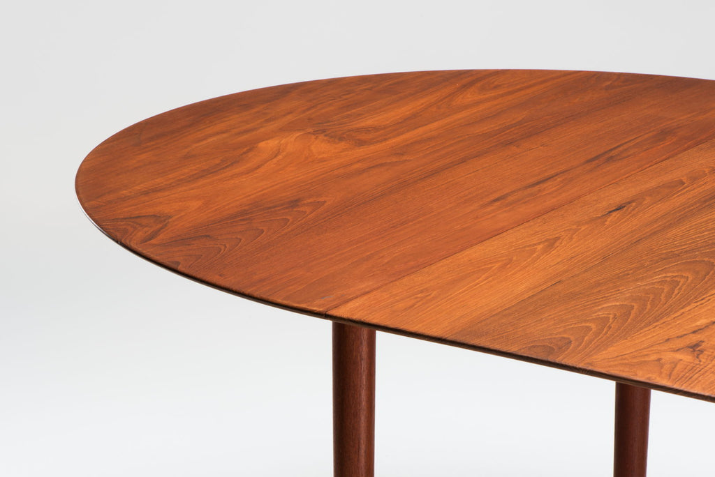 Model 316, an adjustable dining table by Peter Hvidt & Orla Mølgaard Nielsen. It was designed in 1955 for Søborg Møbelfabrik, Denmark. This beautiful dining table is executed in a solid teak top and can be extended with a matching leaf. The table is in extremely good condition. As well are the six matching dining chairs, model '316' which are available too. Extended width is 181cm.