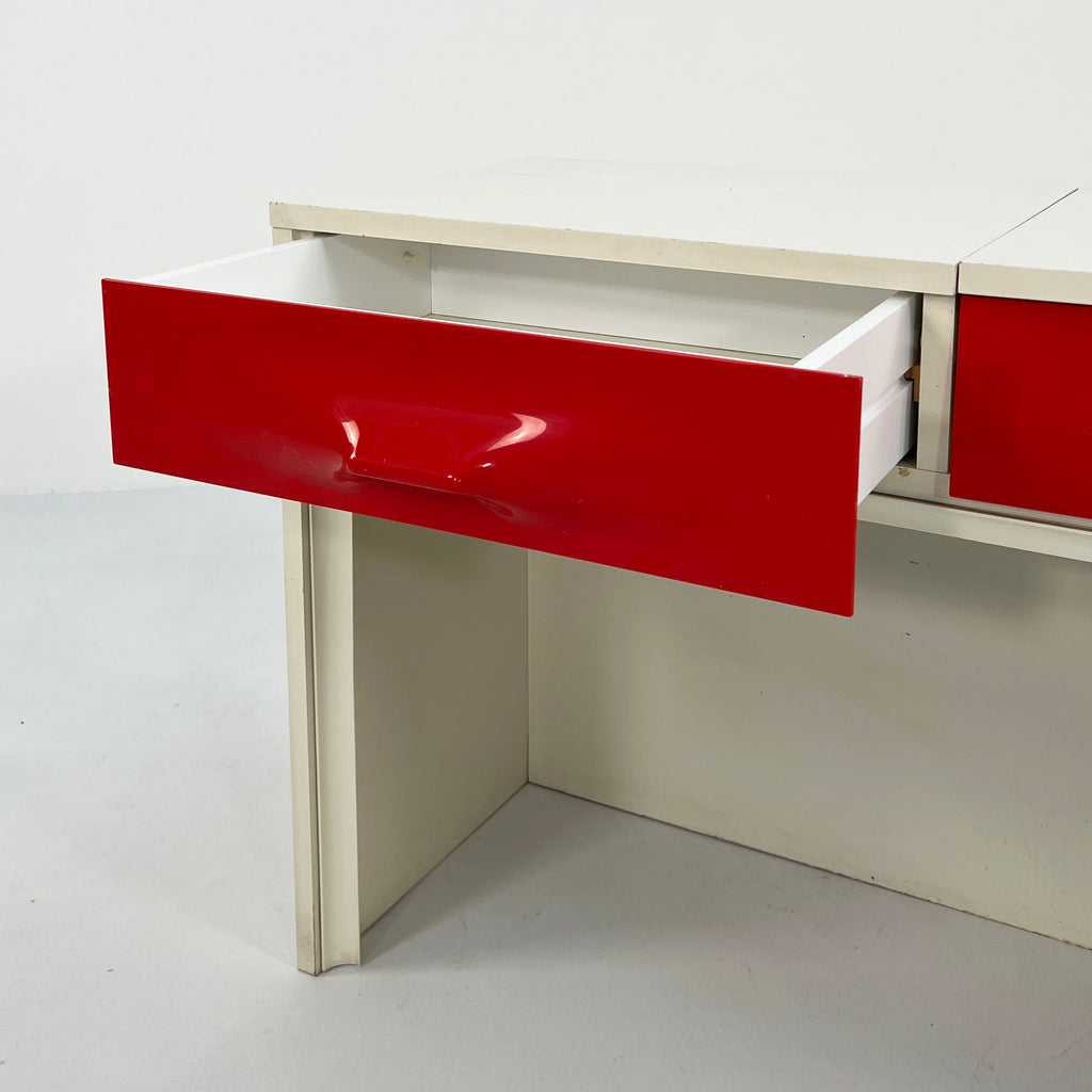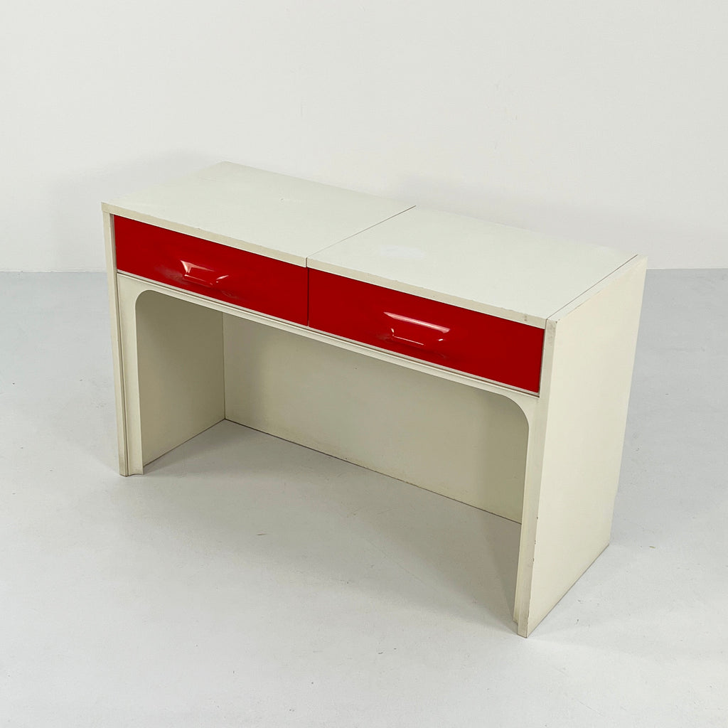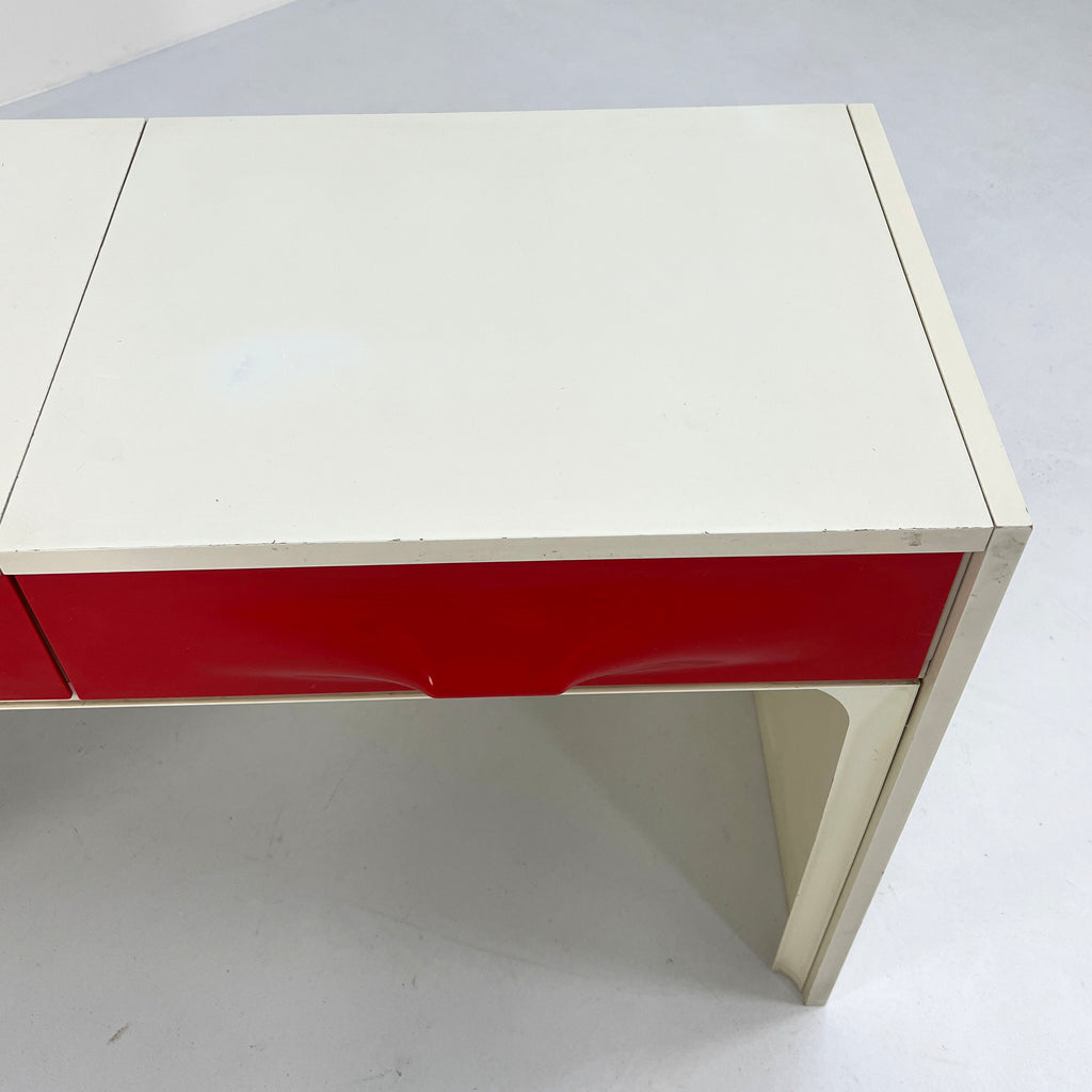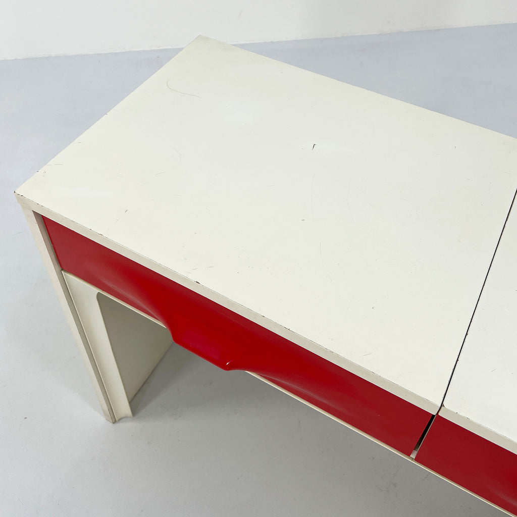 디자인 기간 - 60년대 - 폭 104 cm x 깊이 40 cm x 높이 65 cm 재료 - 라미네이트, ABS 플라스틱 색상 - 빨간색, 흰색 자체 요소에. 마찰 영역 주변과 테이블 보드의 라미네이트에 흠집과 흔적이 있습니다. 세부 사진을 참조하십시오.