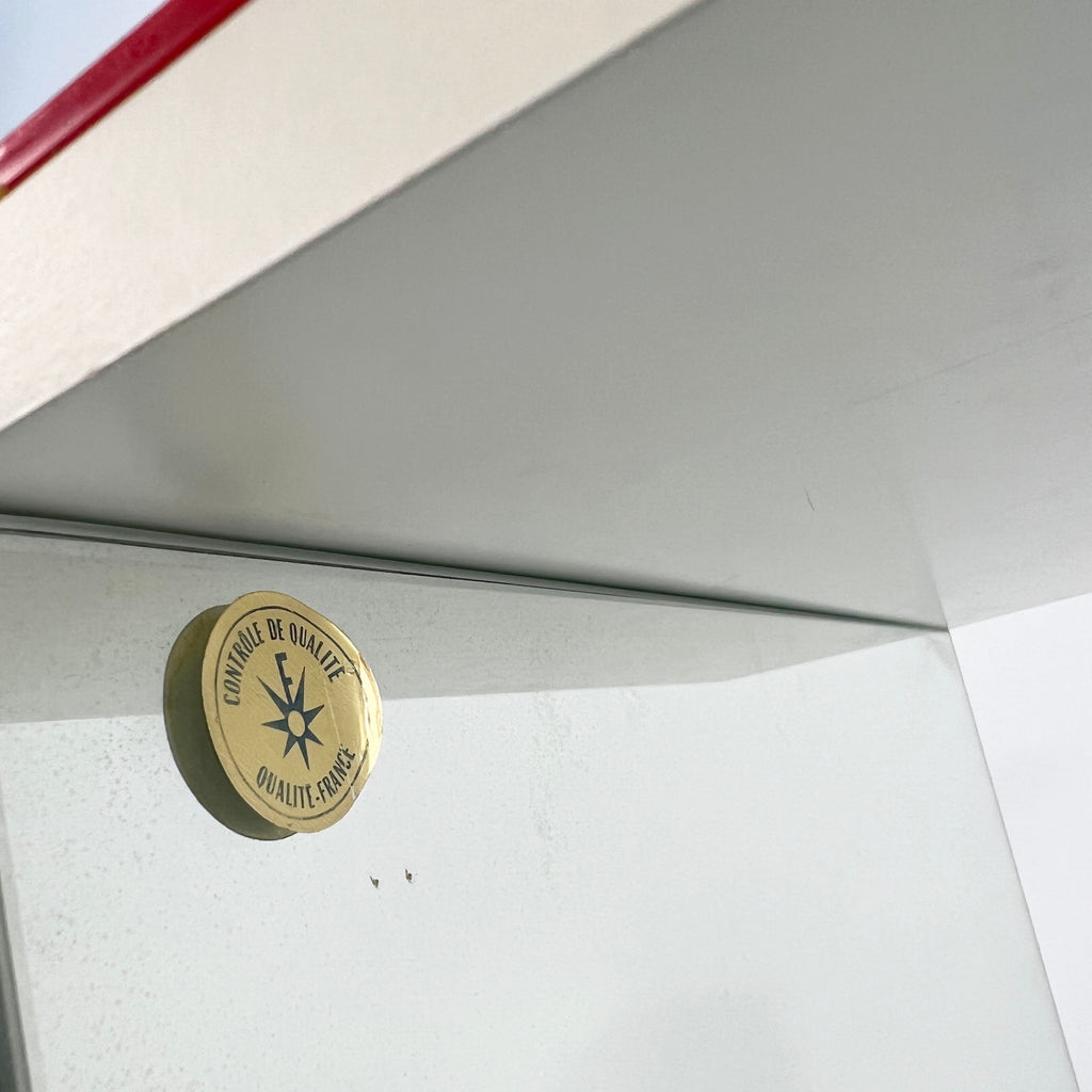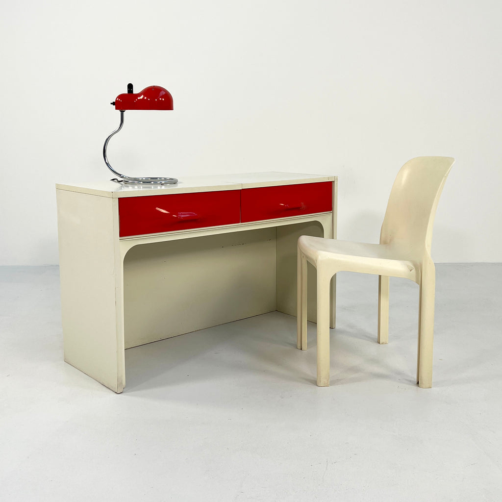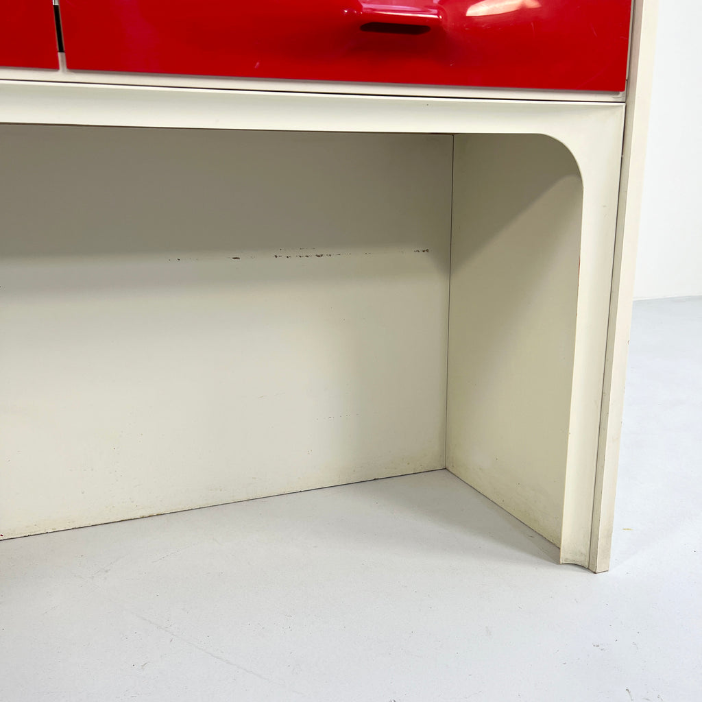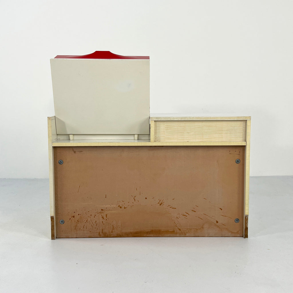 디자인 기간 - 60년대 - 폭 104 cm x 깊이 40 cm x 높이 65 cm 재료 - 라미네이트, ABS 플라스틱 색상 - 빨간색, 흰색 자체 요소에. 마찰 영역 주변과 테이블 보드의 라미네이트에 흠집과 흔적이 있습니다. 세부 사진을 참조하십시오.