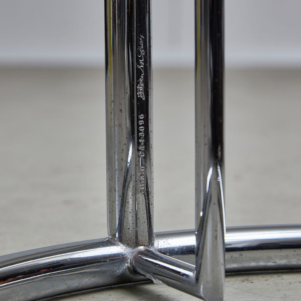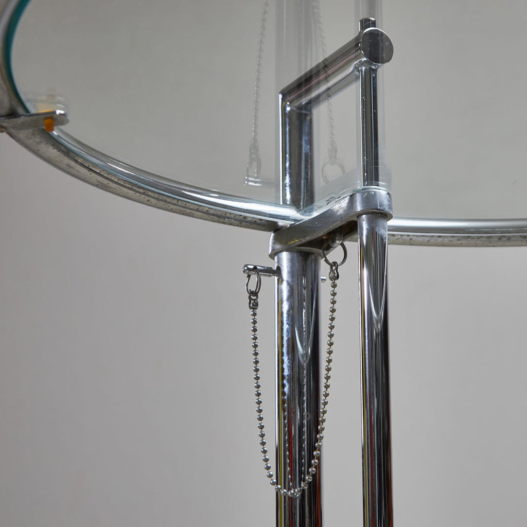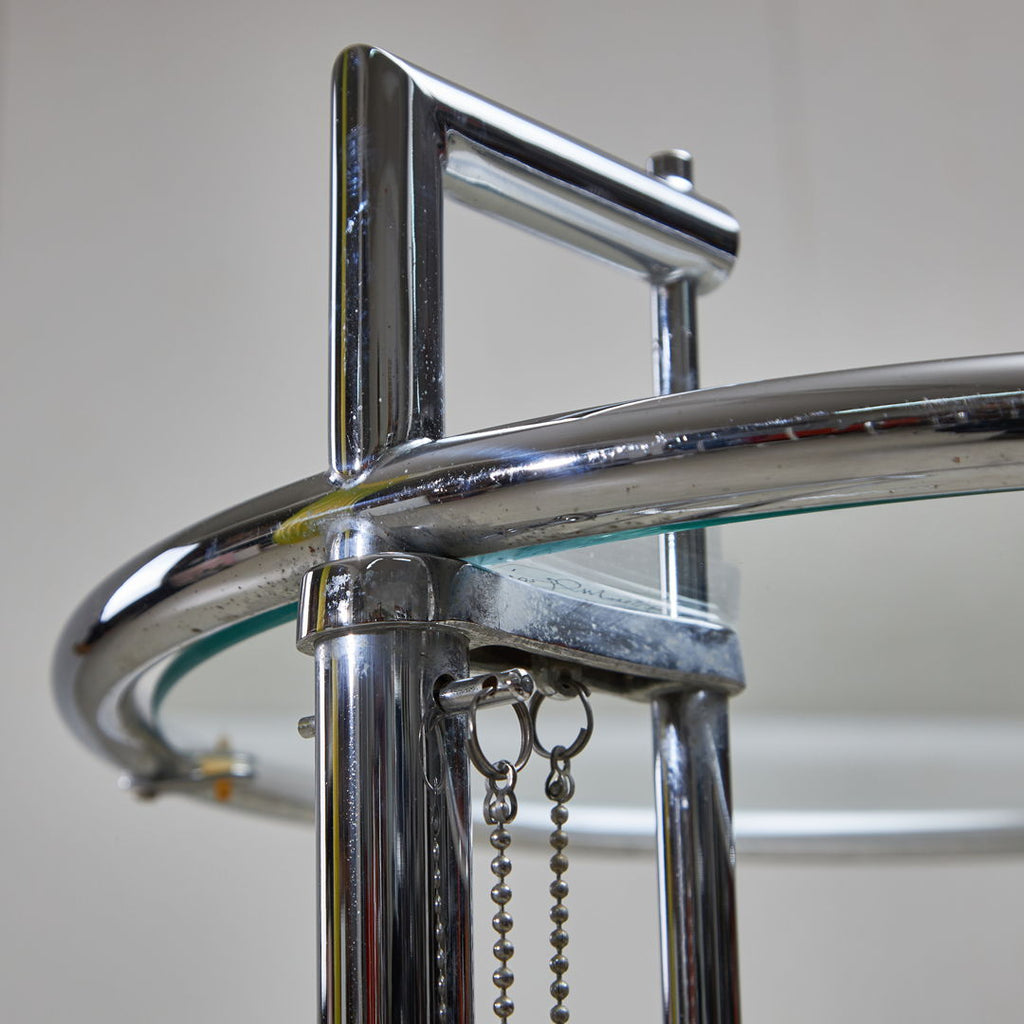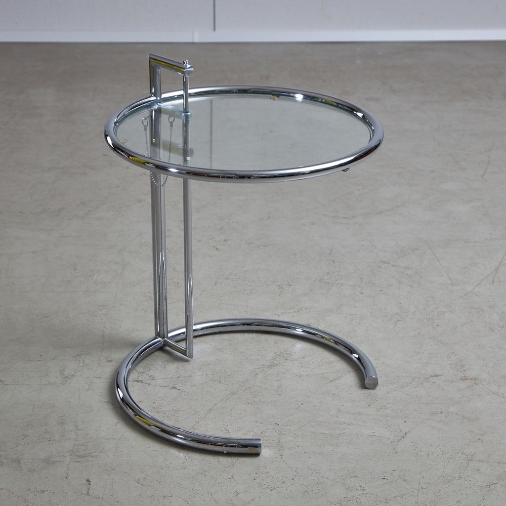 "Eileen Grey was one of the pioneers of the modern movement. The E-1027 adjustable table was designed in 1927, and is finally placed in the pantheon of the great 20th century furniture designs. Elegant shape, functional elements. The chrome-framed, circular, table has a glass top and is in a very nice condition, with small signs of abrasion and scratches consistent with age and use. "