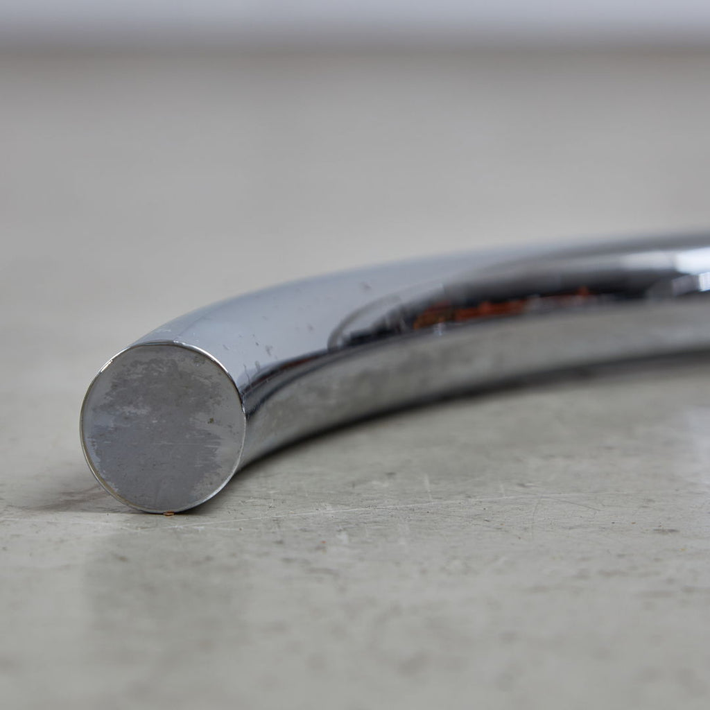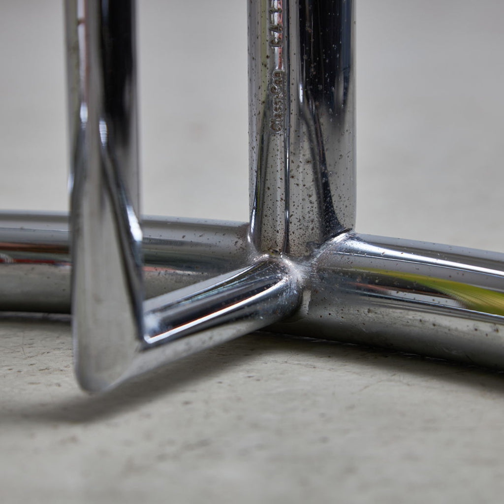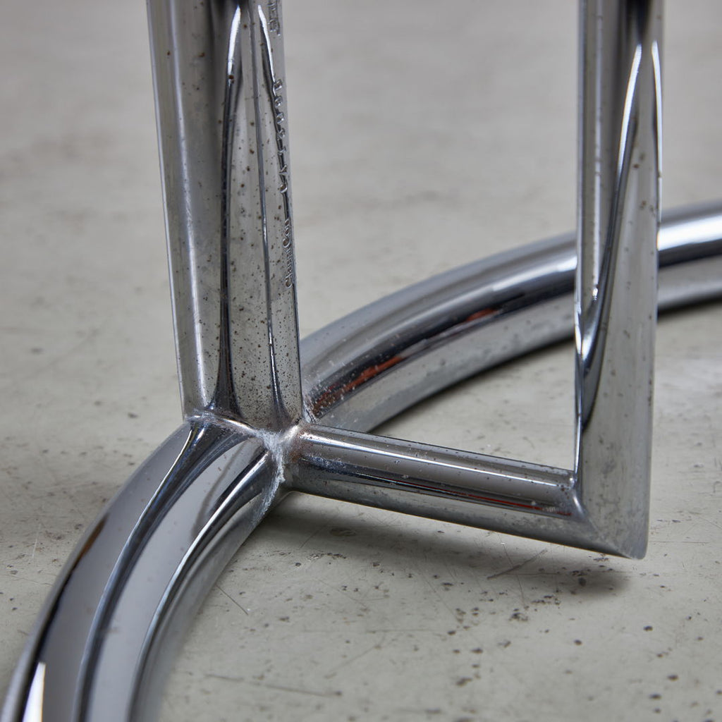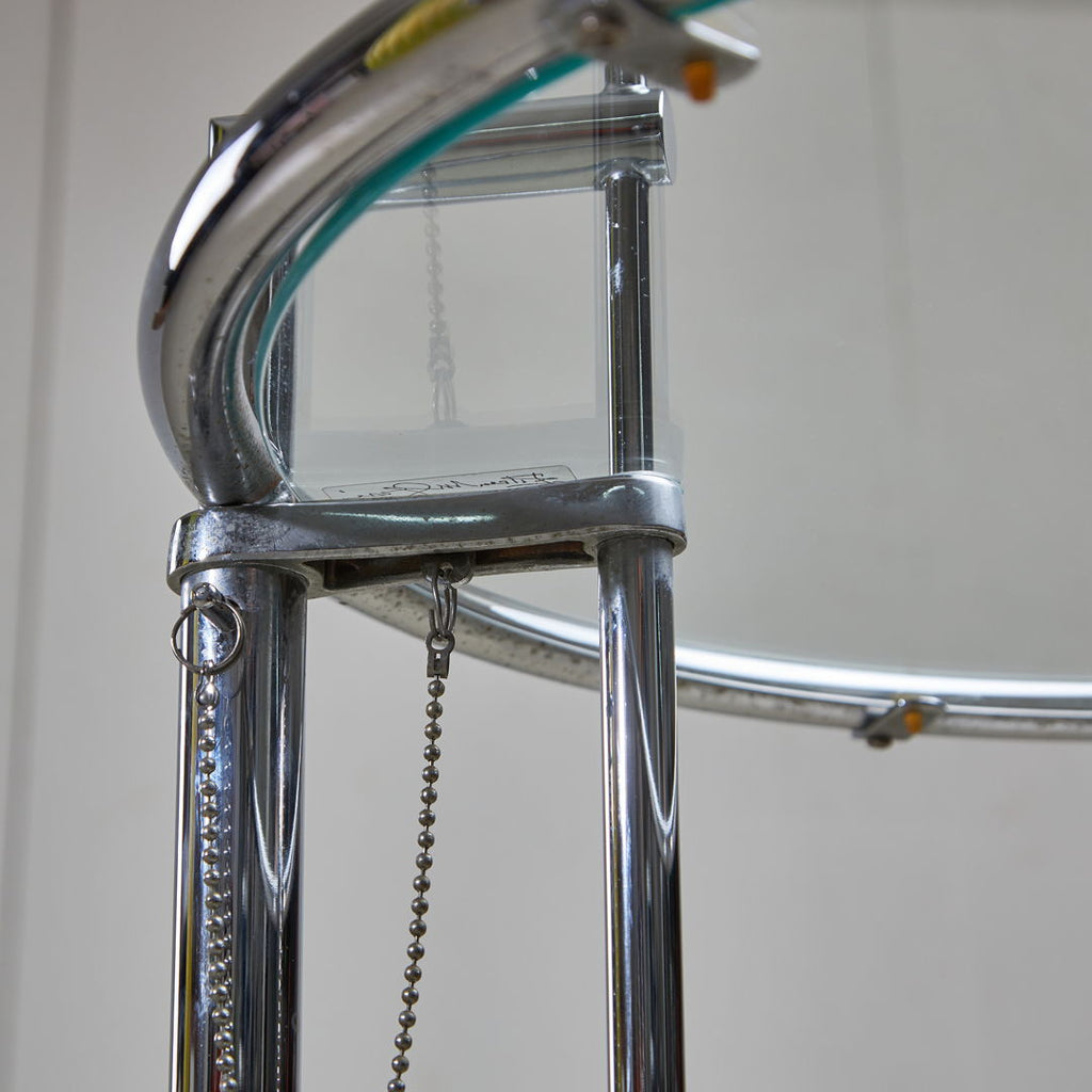 "Eileen Grey was one of the pioneers of the modern movement. The E-1027 adjustable table was designed in 1927, and is finally placed in the pantheon of the great 20th century furniture designs. Elegant shape, functional elements. The chrome-framed, circular, table has a glass top and is in a very nice condition, with small signs of abrasion and scratches consistent with age and use. "