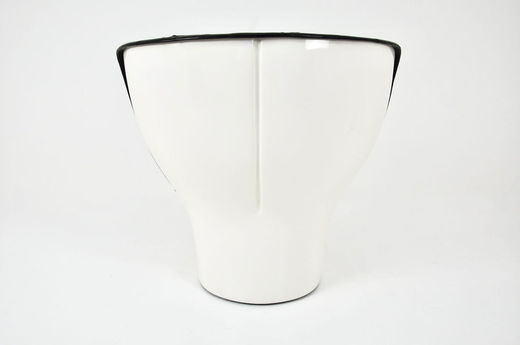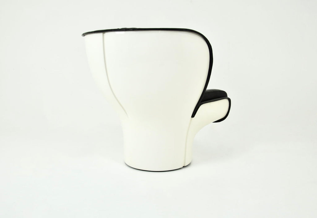 조 콜롬보(Joe Colombo)의 블랙 가죽과 화이트 쉘 소재의 회전 안락 의자. 엘다 모델. 좌석 높이 39cm. 시간과 나이로 인한 마모.