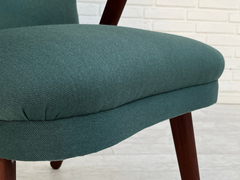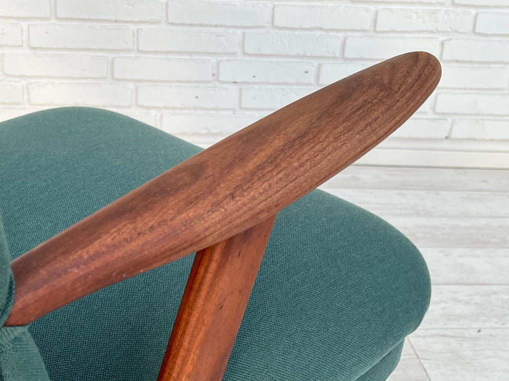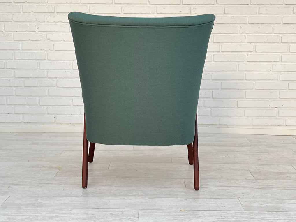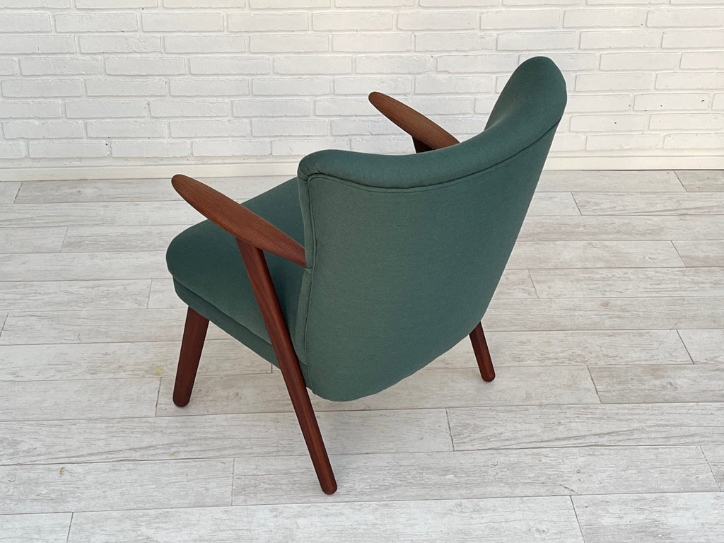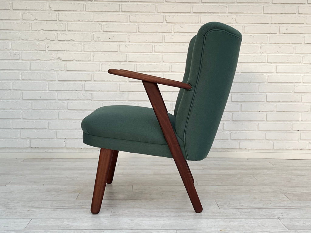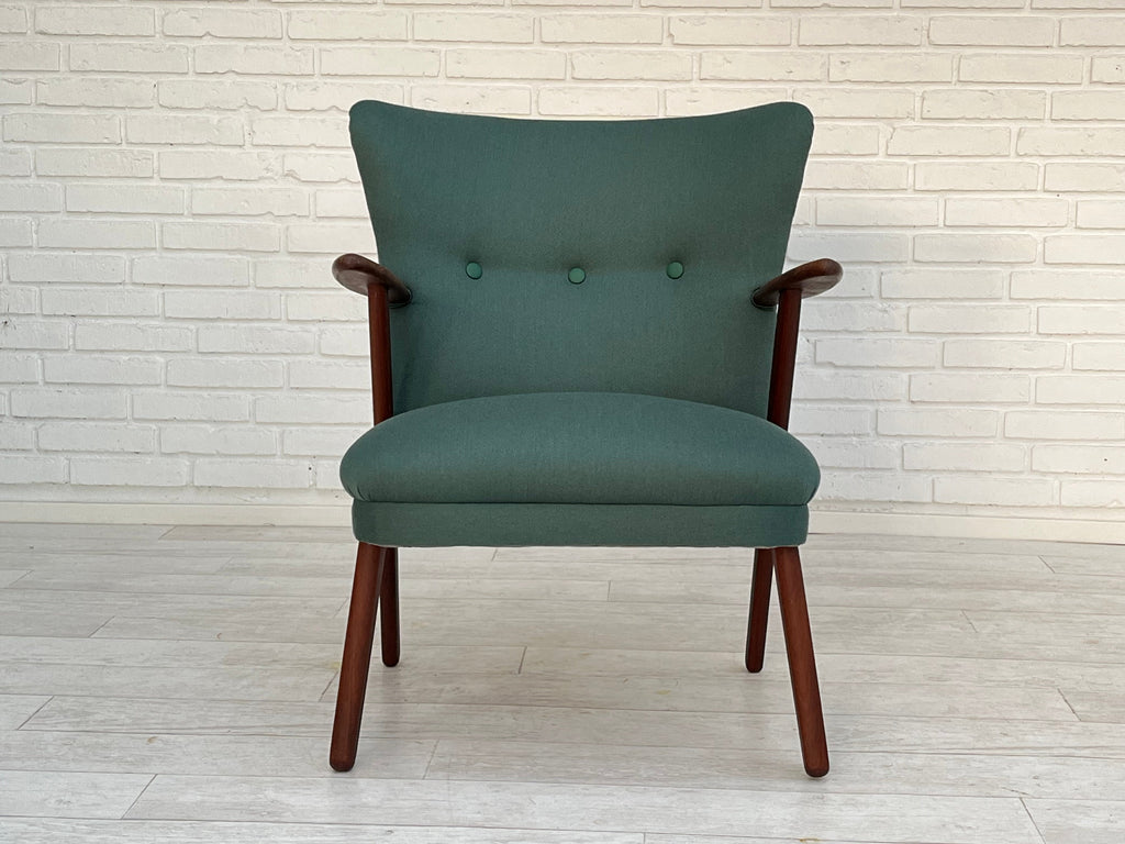 완전히 개조되고 덮개를 씌운 덴마크식 안락의자. 새로운 실내 장식품. 고품질의 밝은 녹색 가구 양모 직물, 단단한 티크재질의 팔걸이와 다리.