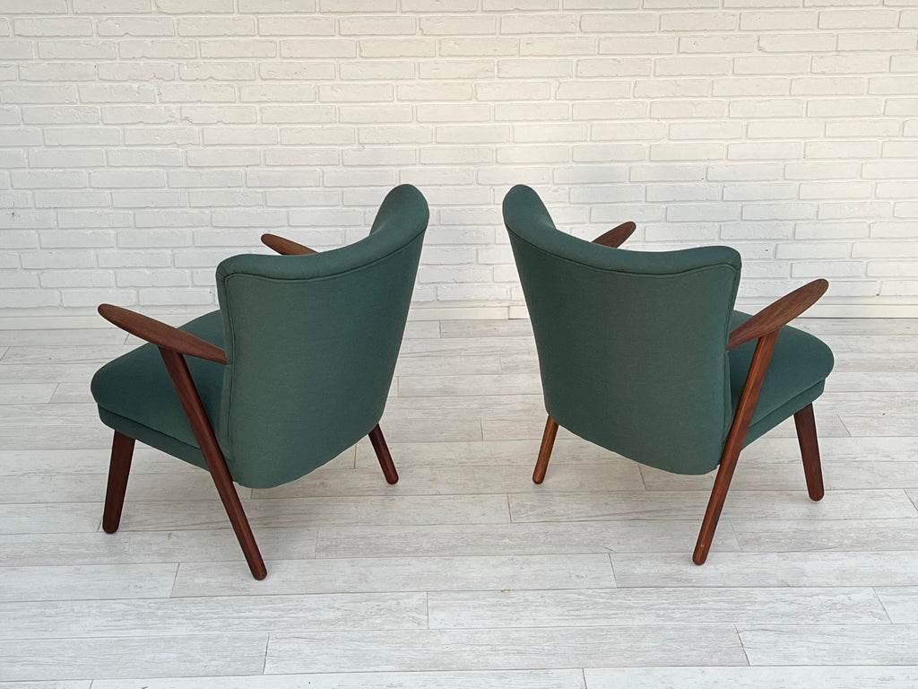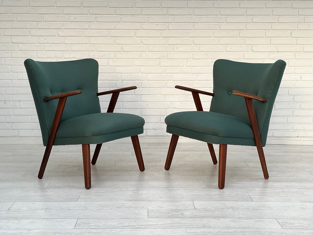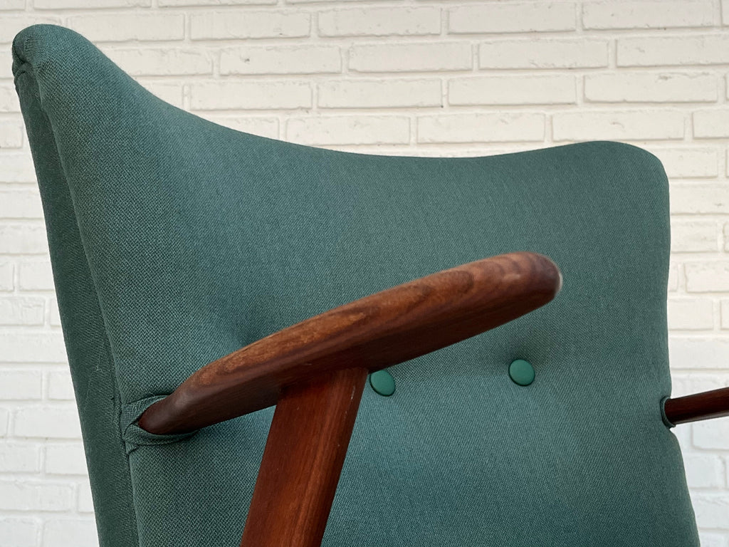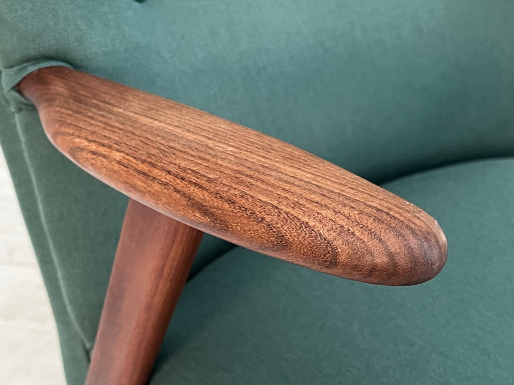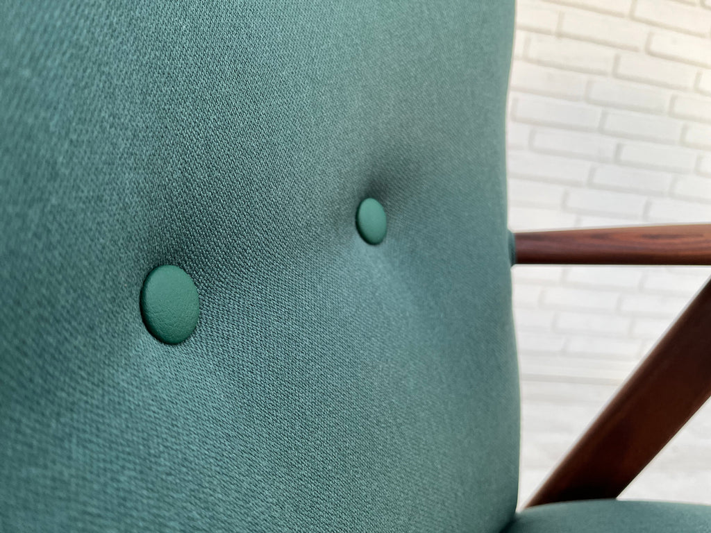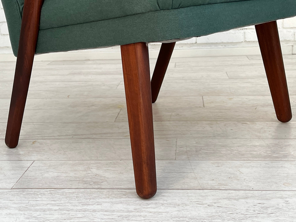 완전히 개조되고 덮개를 씌운 덴마크식 안락의자. 새로운 실내 장식품. 고품질의 밝은 녹색 가구 양모 직물, 단단한 티크재질의 팔걸이와 다리.