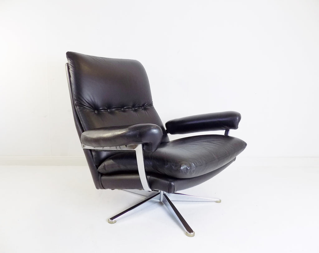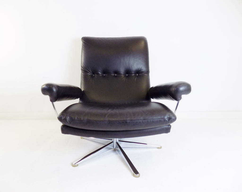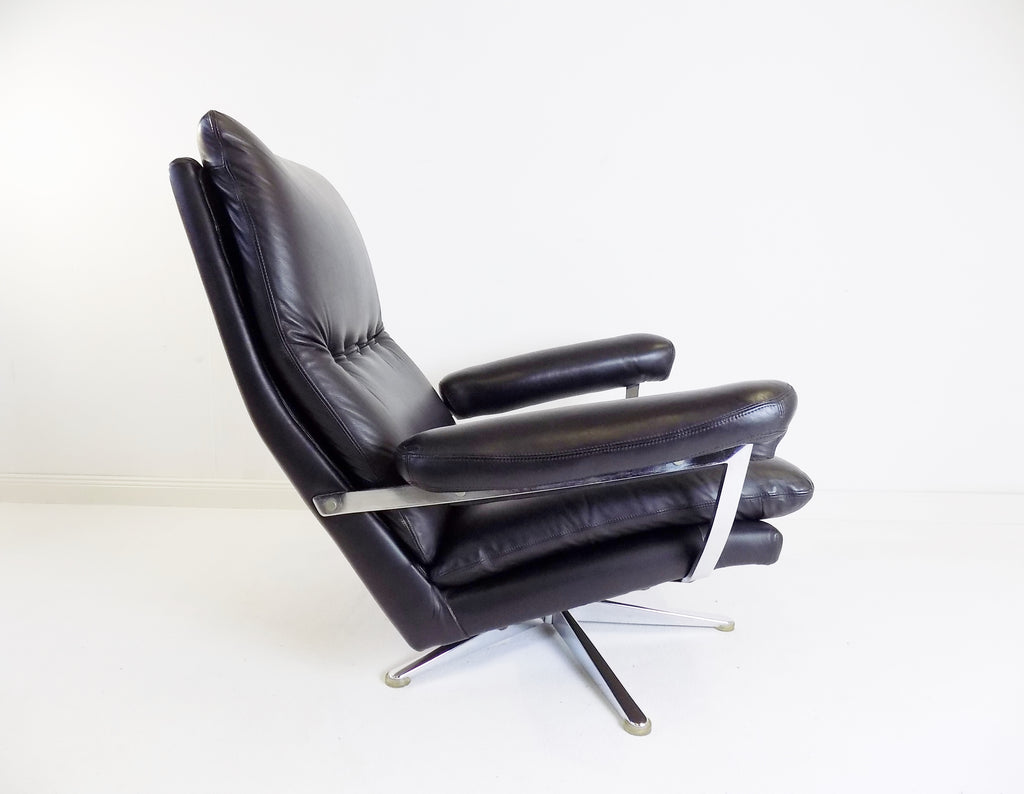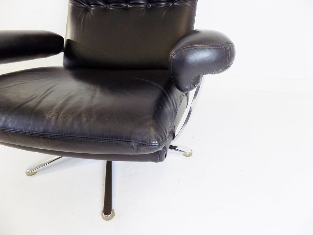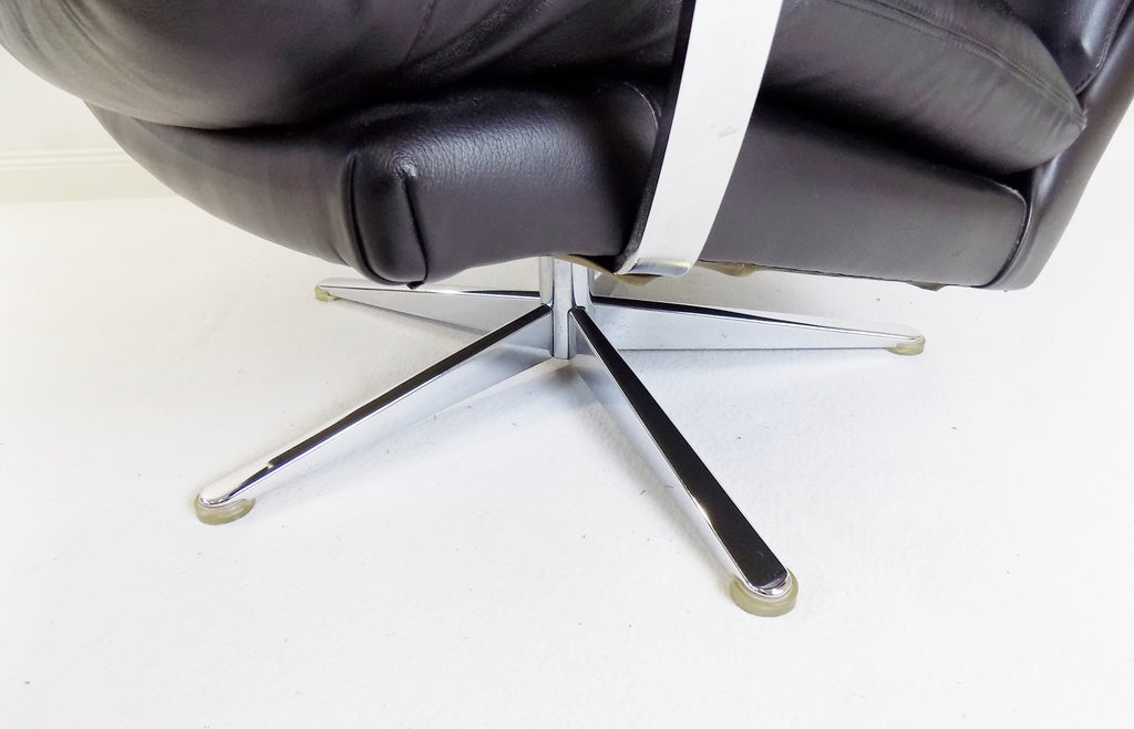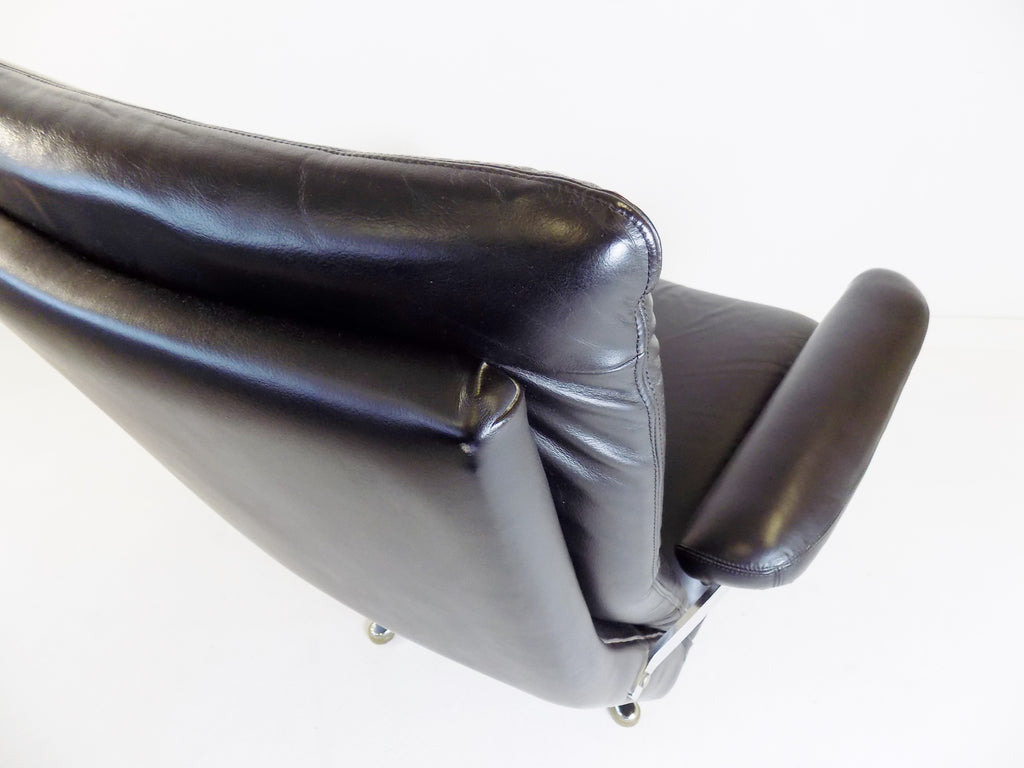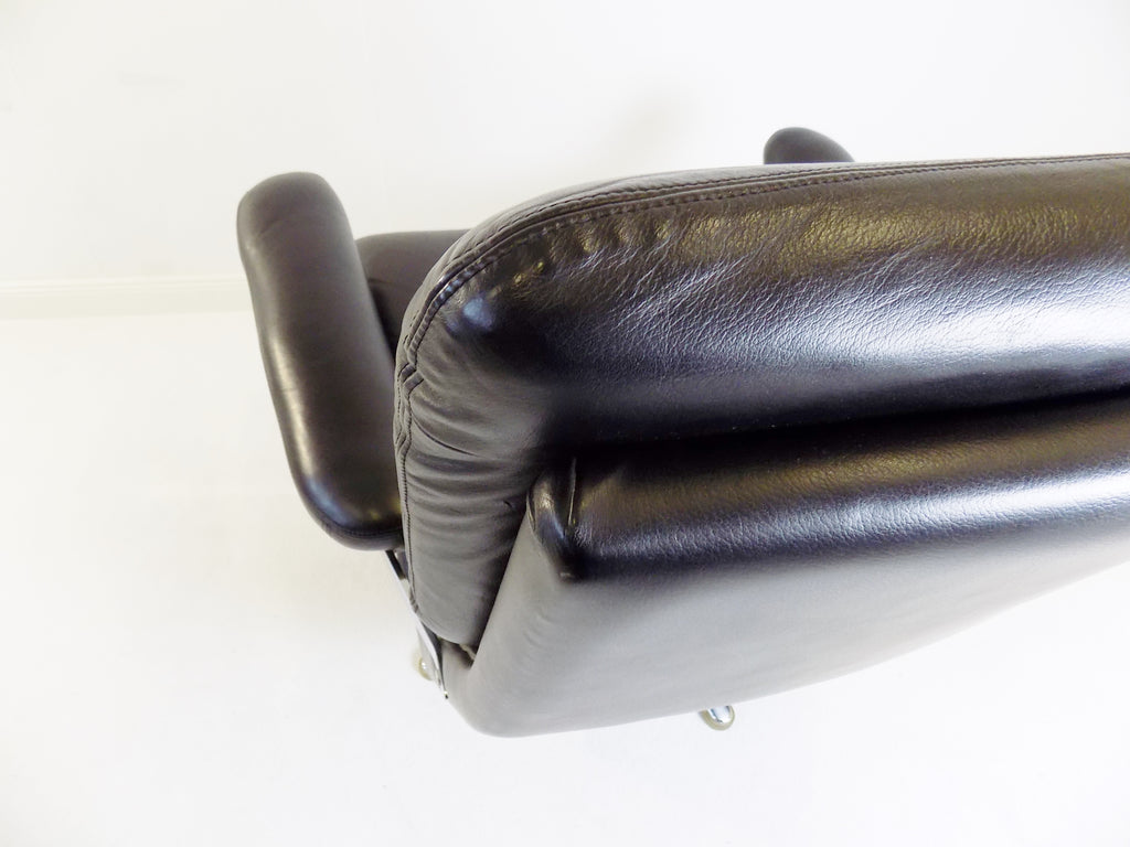 크롬 팔걸이가 있는 ESA의 이 검은색 가죽 안락의자는 최상의 상태를 보여줍니다.
