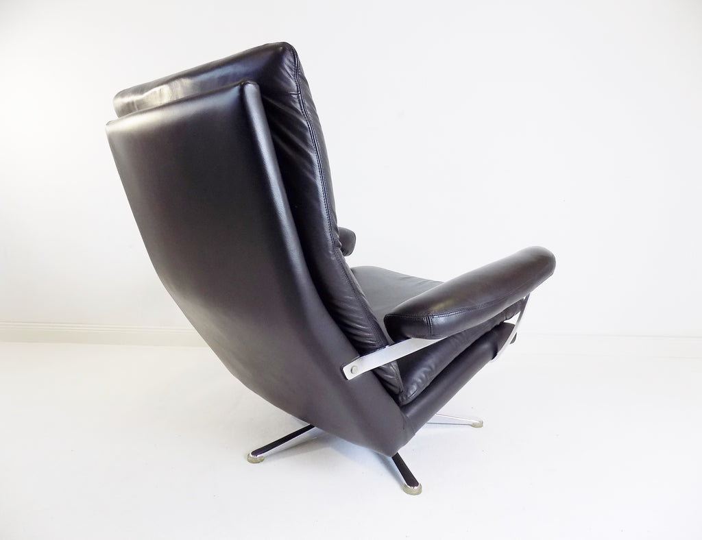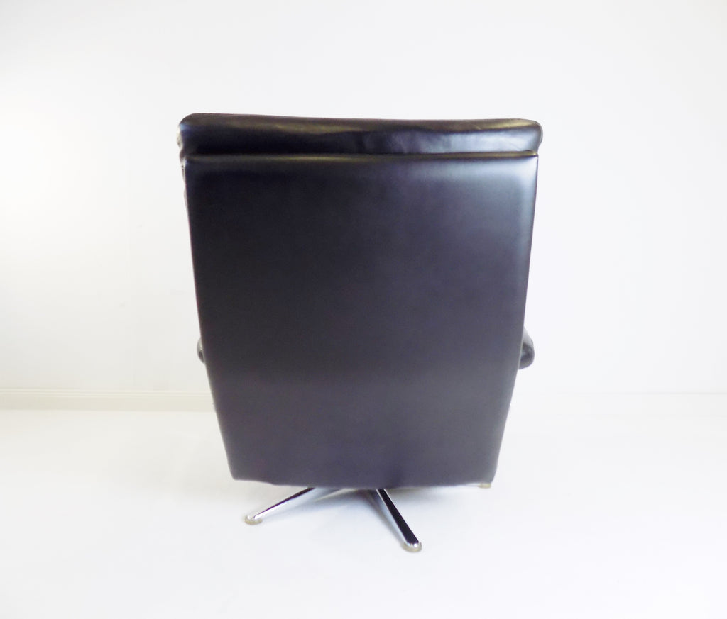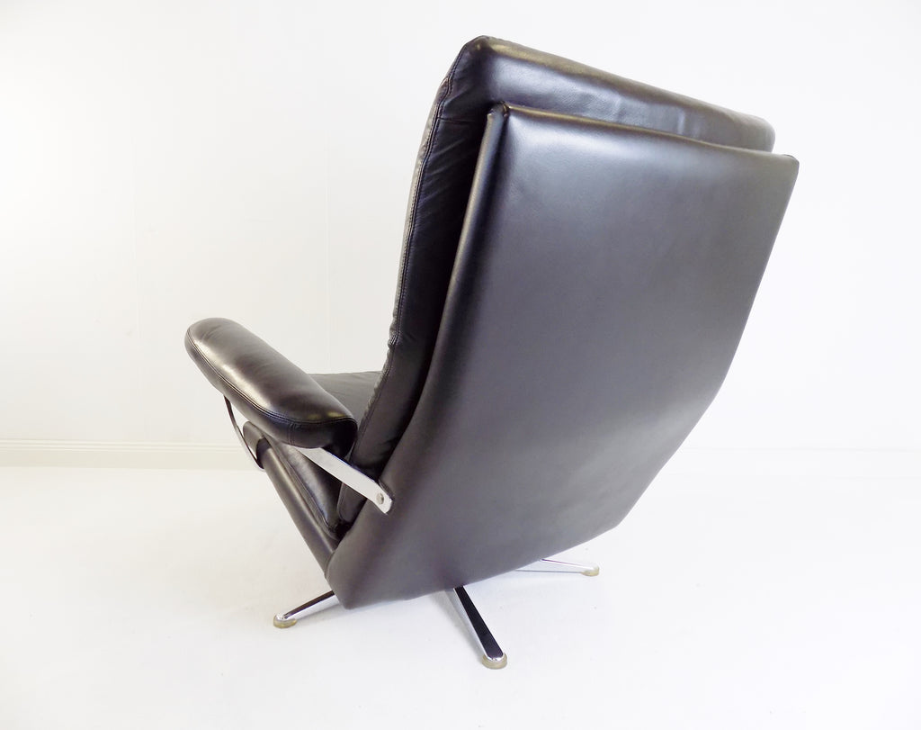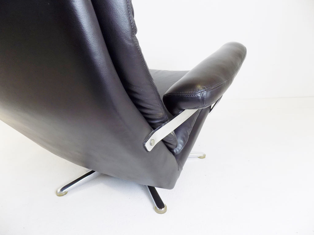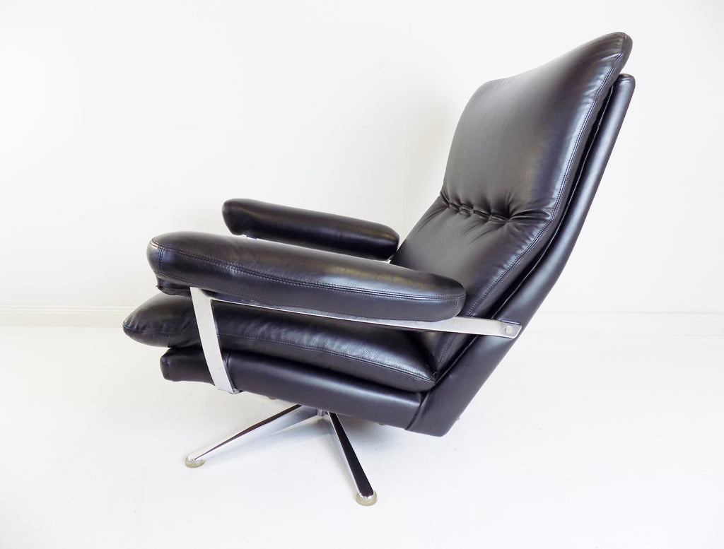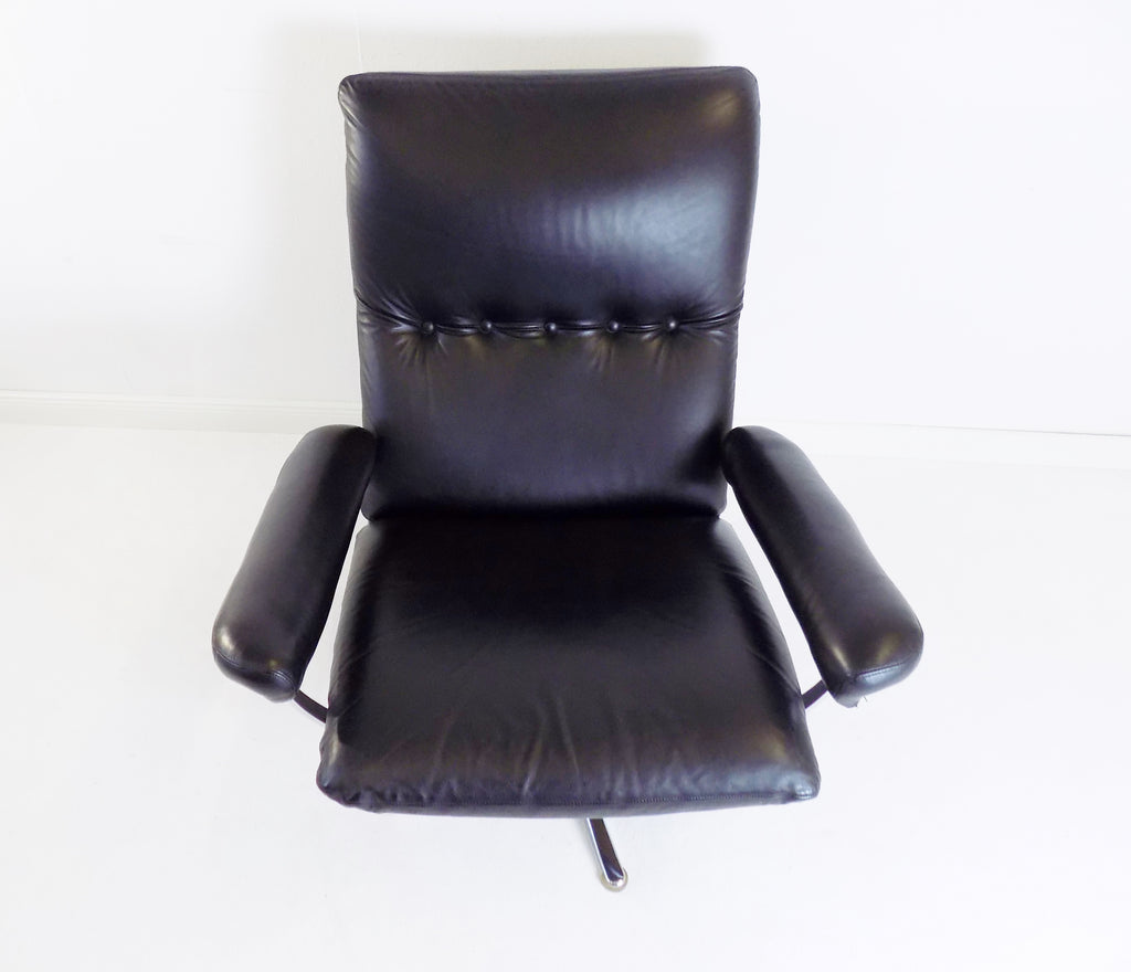 크롬 팔걸이가 있는 ESA의 이 검은색 가죽 안락의자는 최상의 상태를 보여줍니다.