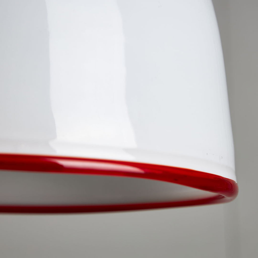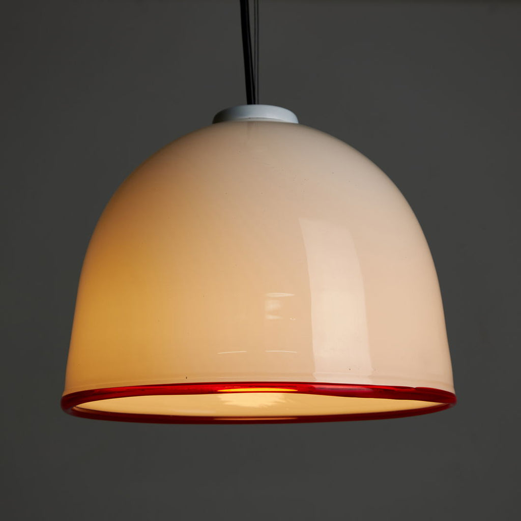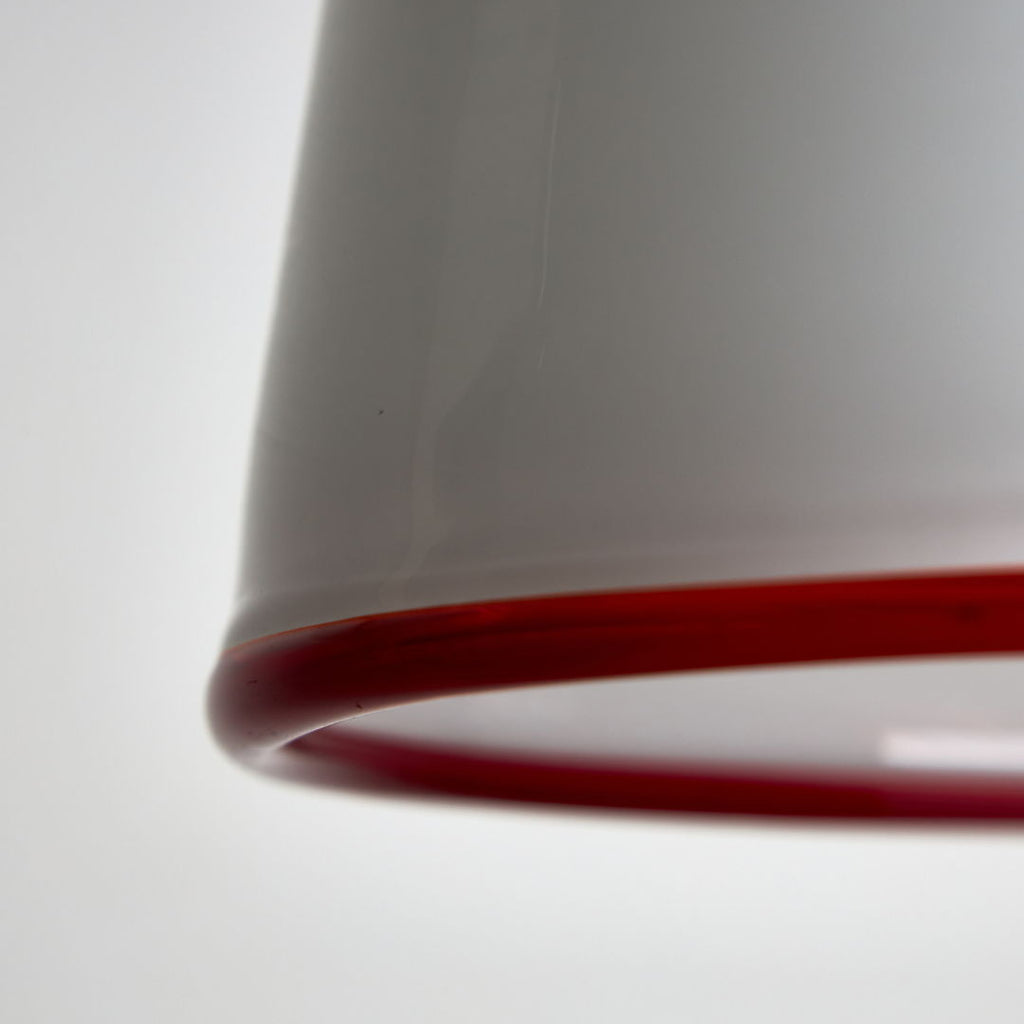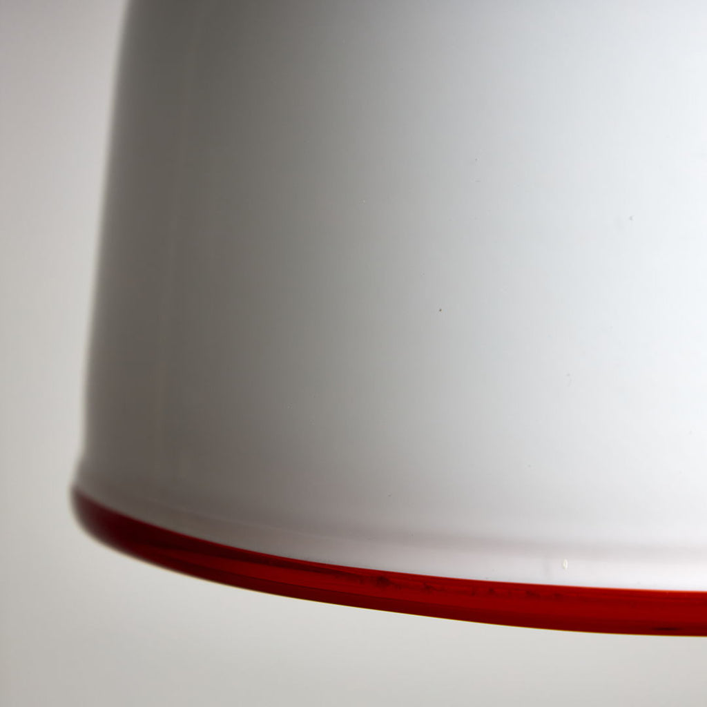 Designed by Ettore Sottsass in 1975, this pendant for Vistosi is a true masterpiece of art. Crafted from white Murano glass, this piece radiates class and style. The striking red ribbon encircling the pendant adds a pop of vibrant colour and further enhances its visual appeal. A perfect blend of form and function, this pendant is not just a lighting fixture but a work of art that will elevate any space it illuminates. Elegant, chic, and timeless, this item is a must-have for those who appreciate the finer things in life.