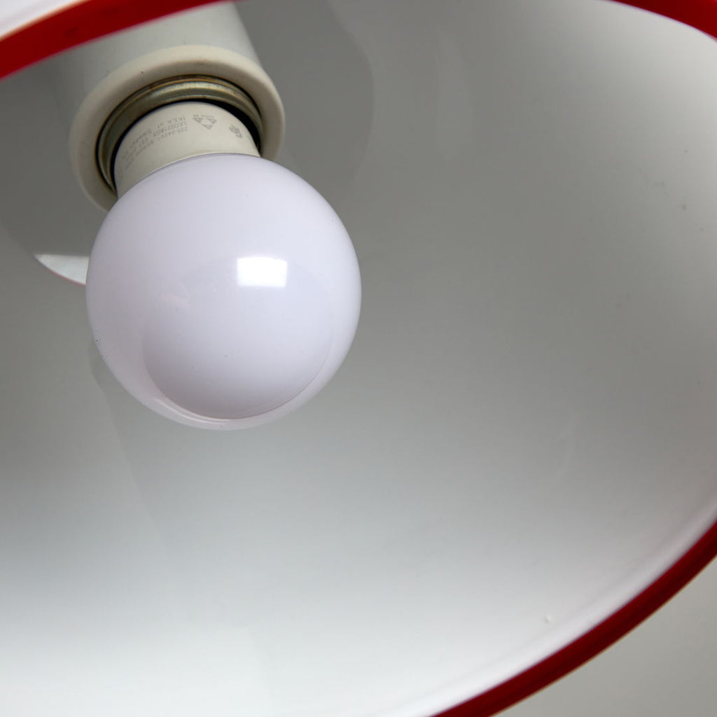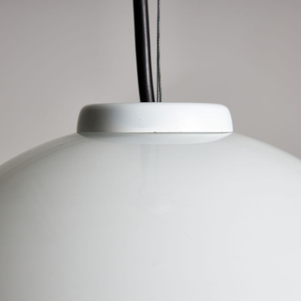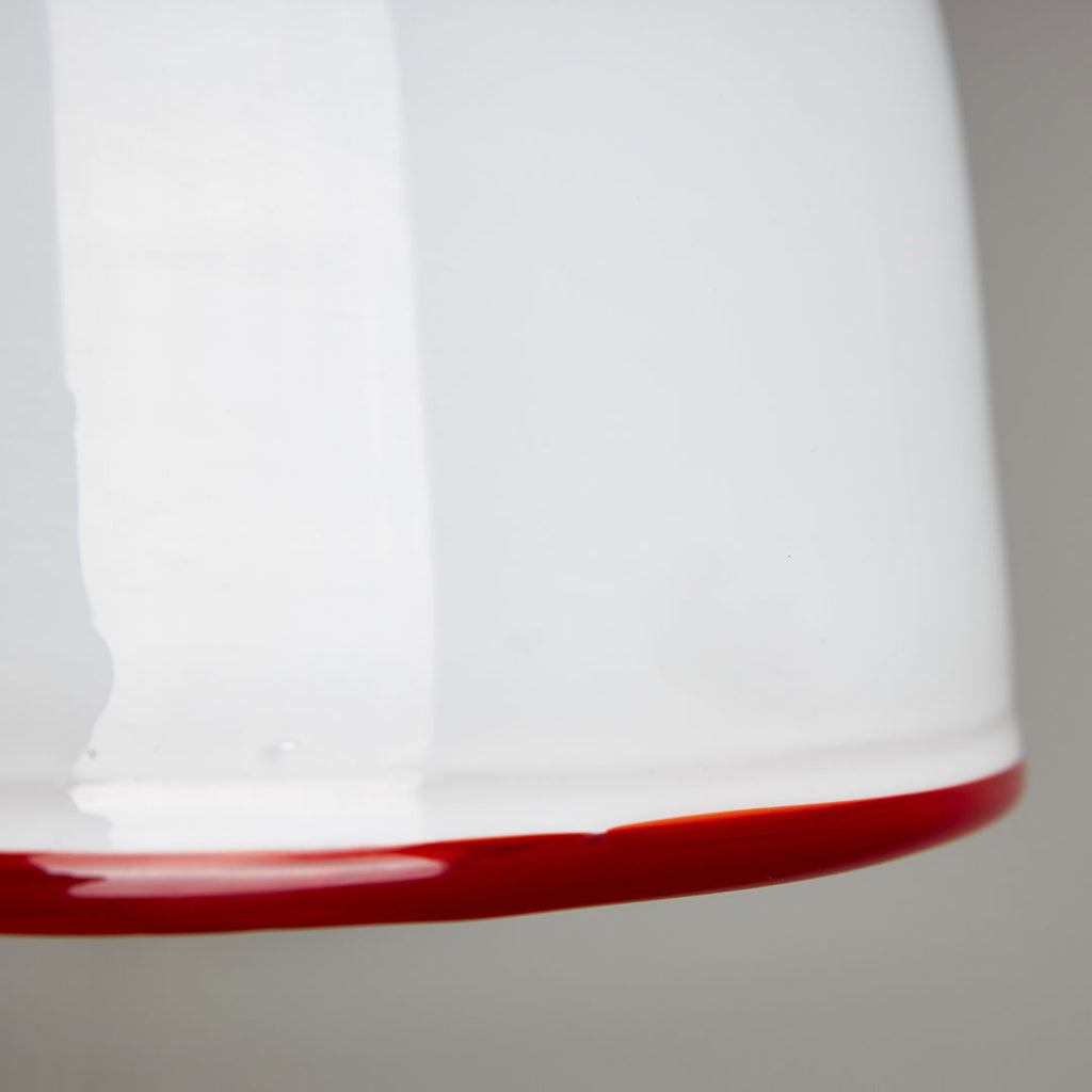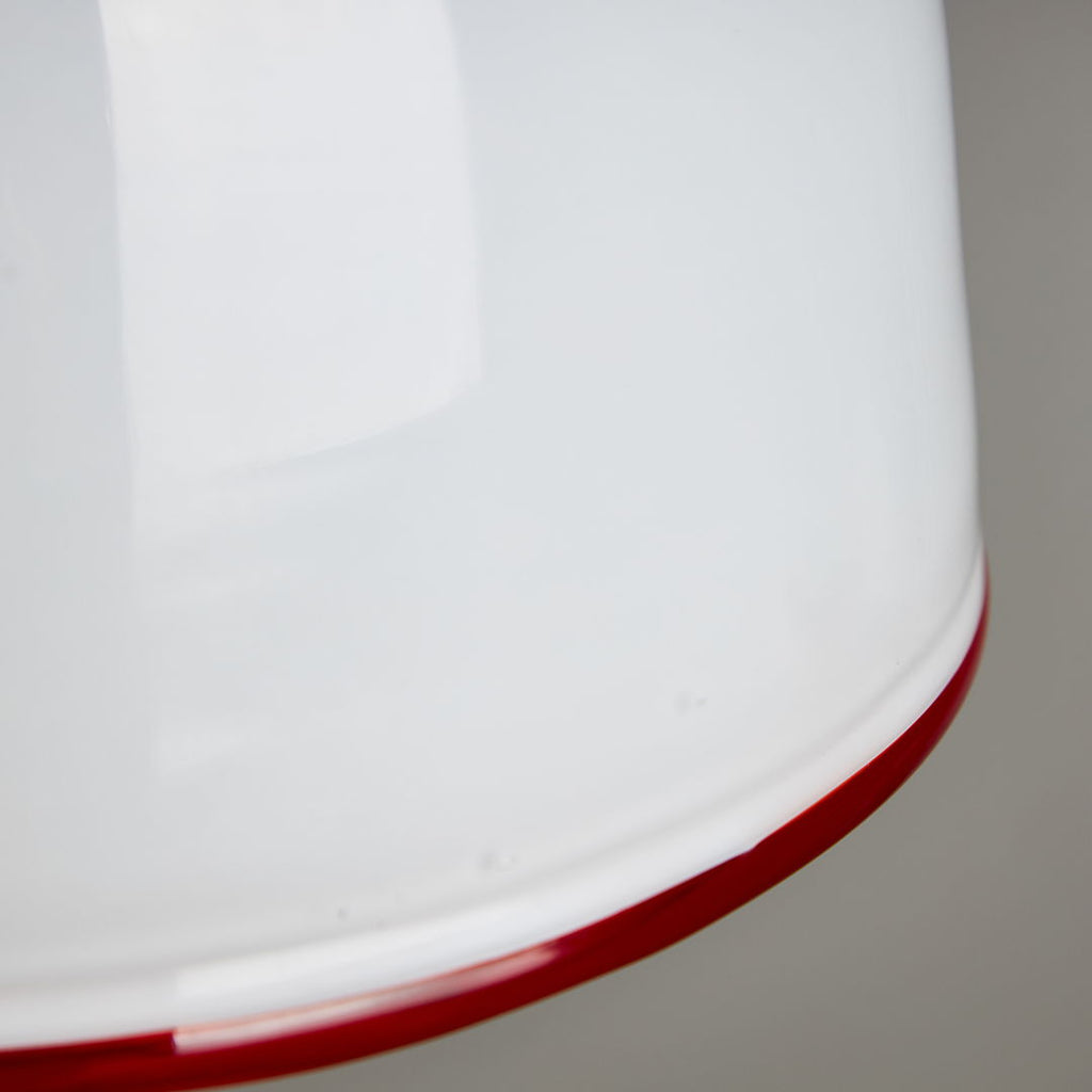 Designed by Ettore Sottsass in 1975, this pendant for Vistosi is a true masterpiece of art. Crafted from white Murano glass, this piece radiates class and style. The striking red ribbon encircling the pendant adds a pop of vibrant colour and further enhances its visual appeal. A perfect blend of form and function, this pendant is not just a lighting fixture but a work of art that will elevate any space it illuminates. Elegant, chic, and timeless, this item is a must-have for those who appreciate the finer things in life.