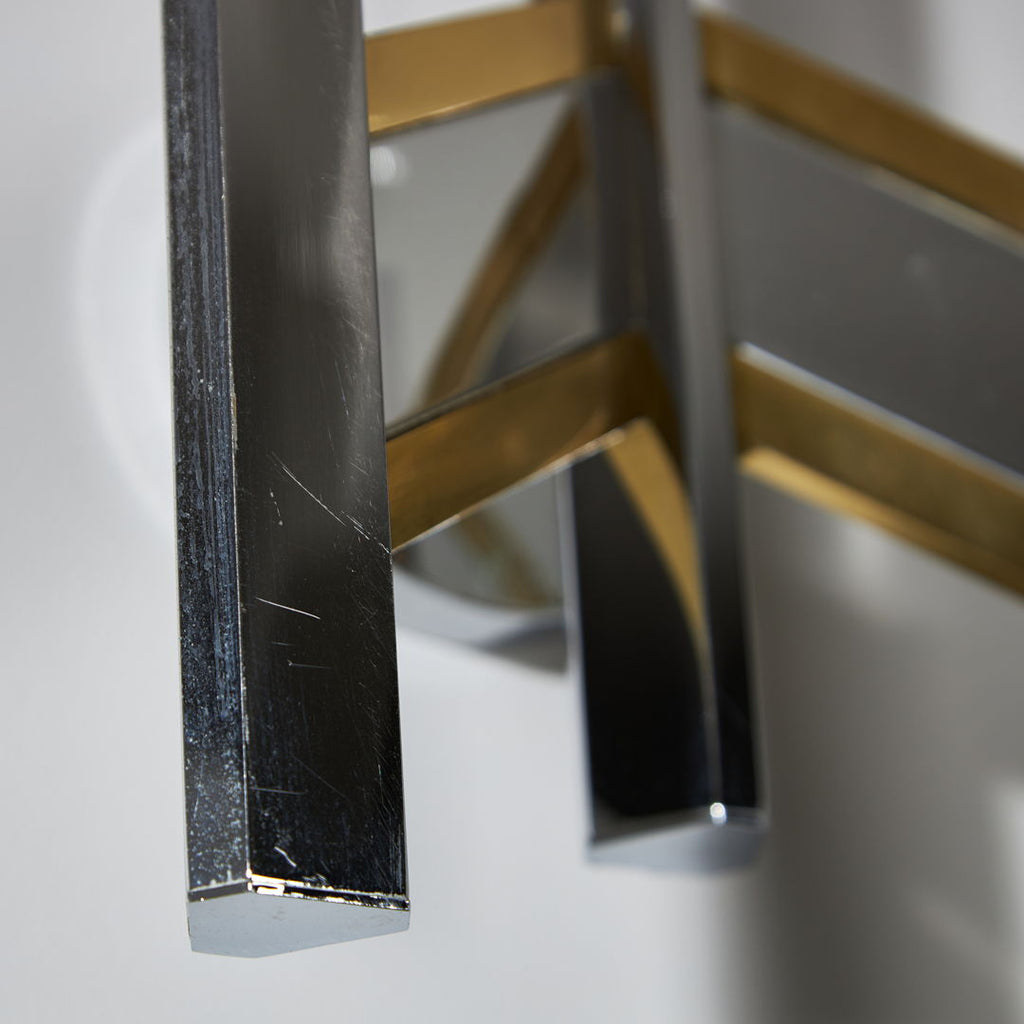 The lighting designs of Angelo Gaetano Sciolari, the Italian entrepreneur-designer, have regained attention, especially due to the growing admiration from a new generation for his glamorous 1970s pieces. This iconic wall lamp features three elegantly shaped branches with a blend of chrome and gold-plated finishes. The item is fully functional, and has light scratches and small abrasion on the metal parts. Please note that in real life the scratches are much more subtle than on the photos.