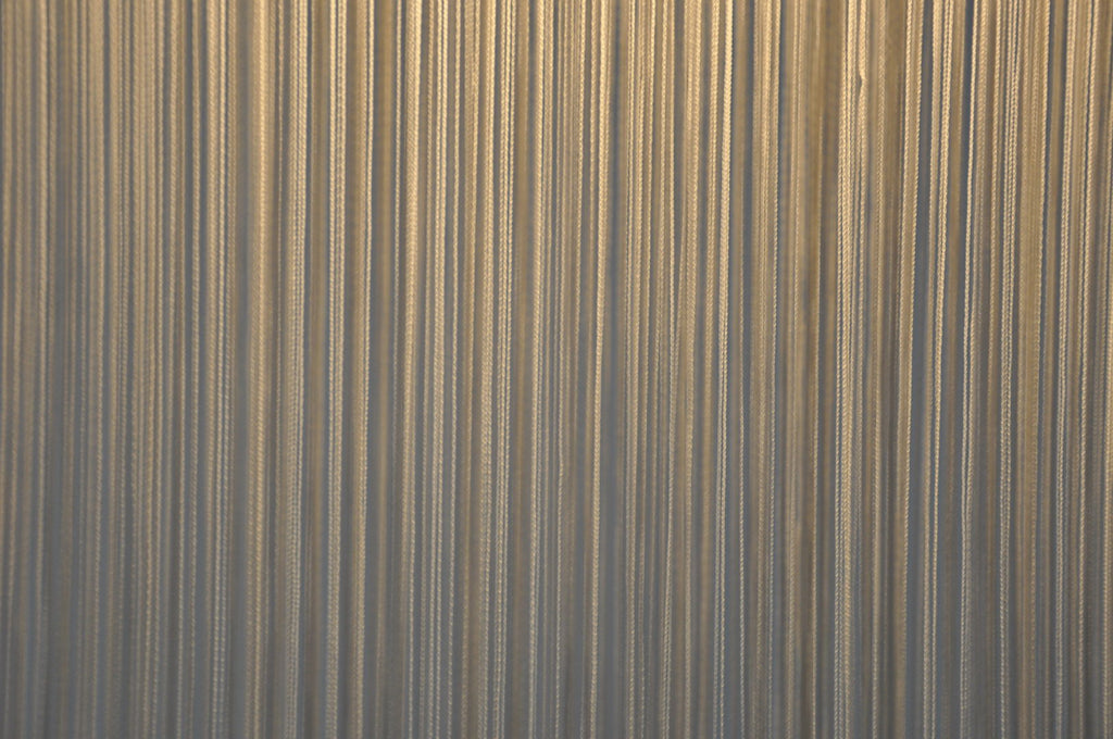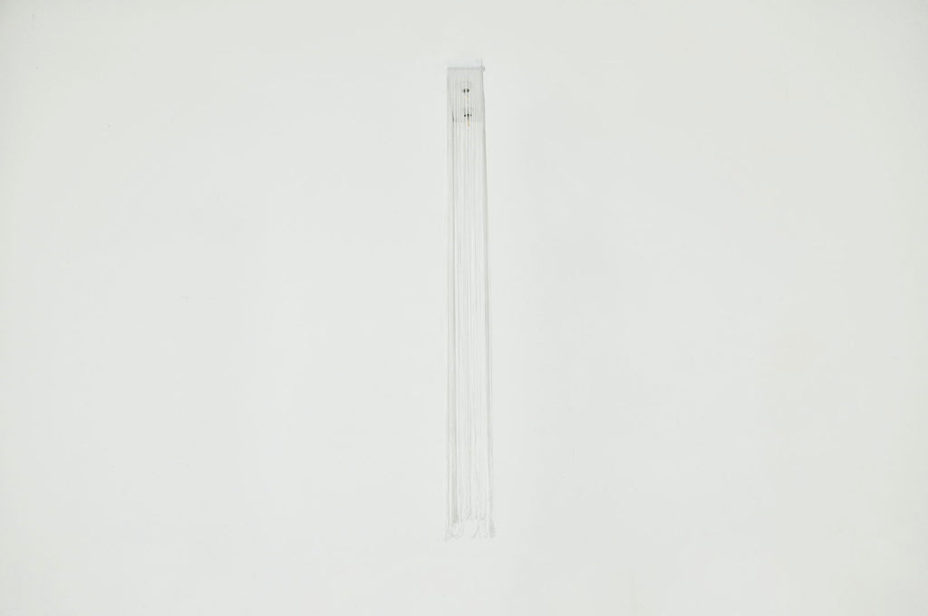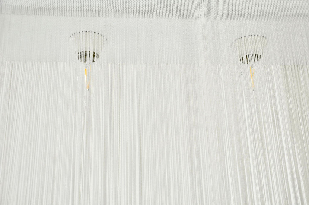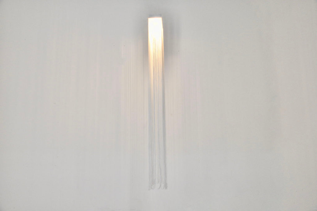 야기 마리요(Mariyo Yagi)가 디자인한 패브릭 프린지 천장 조명. 각인된 시라, 야기 마리요. 시간과 나이로 인한 마모.
