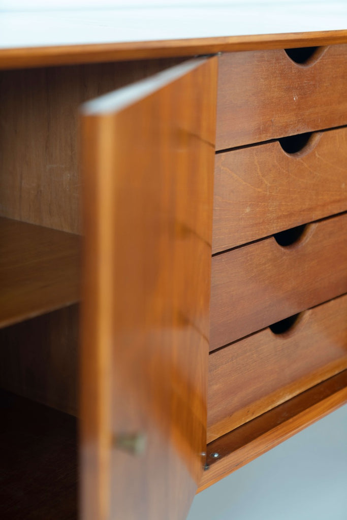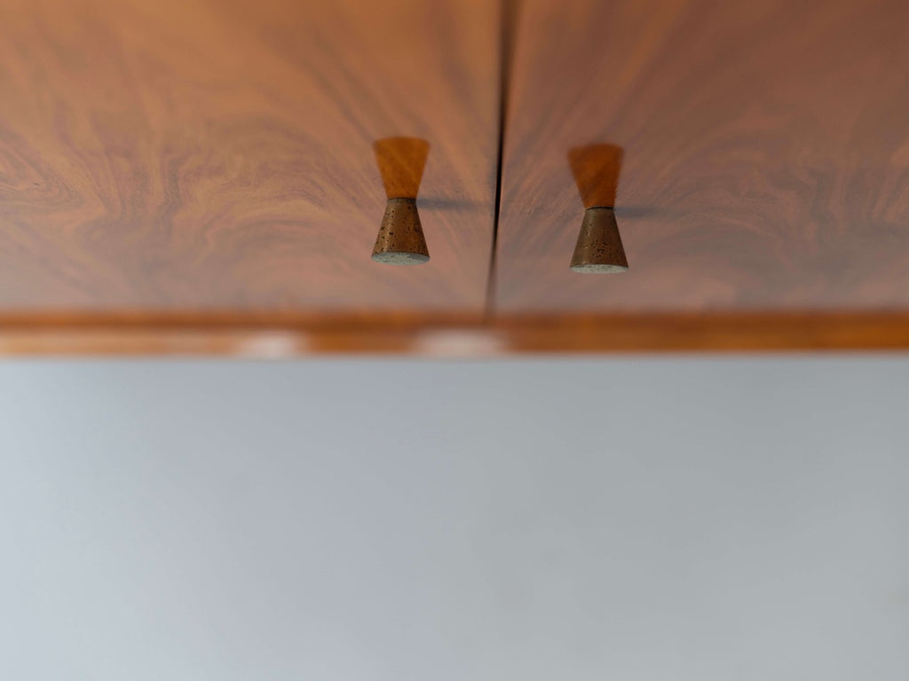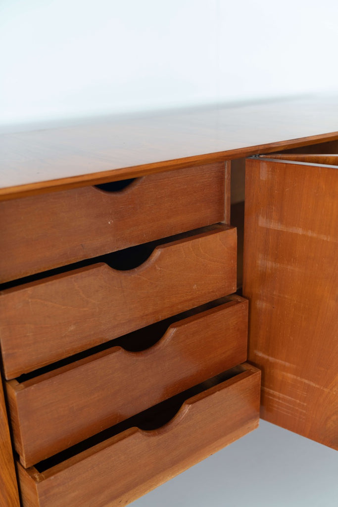 이 찬장은 유기적으로 가공된 나무로 훌륭한 디자인을 가지고 있습니다. 문의 손잡이는 황동으로 만들어졌습니다. 다리는 흥미롭고 유기적인 모양을 가지고 있으며 그의 가구에서 많이 볼 수 있는 스타일입니다. 선반이 있는 4개의 문과 4개의 서랍이 있는 중간 문이 있습니다.