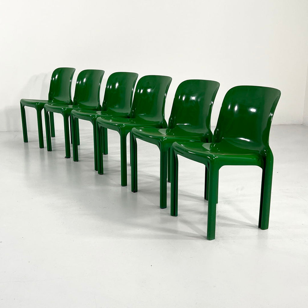디자이너 - Vico Magistretti 프로듀서 - Artemide 모델 - Selene Chair 디자인 기간 - 70년대 측정 - 폭 47cm x 깊이 50cm x 높이 76cm x 좌석 높이 48cm 소재 - 플라스틱 색상 - 녹색 연한 사용 연령과 용도에 맞게 착용하세요. 가장자리와 마찰 부위/발 주변에 약간의 흠집이 있습니다. 의자 1개 등받이 모서리에 작은 균열이 있습니다. 세부 사진을 참조하세요.