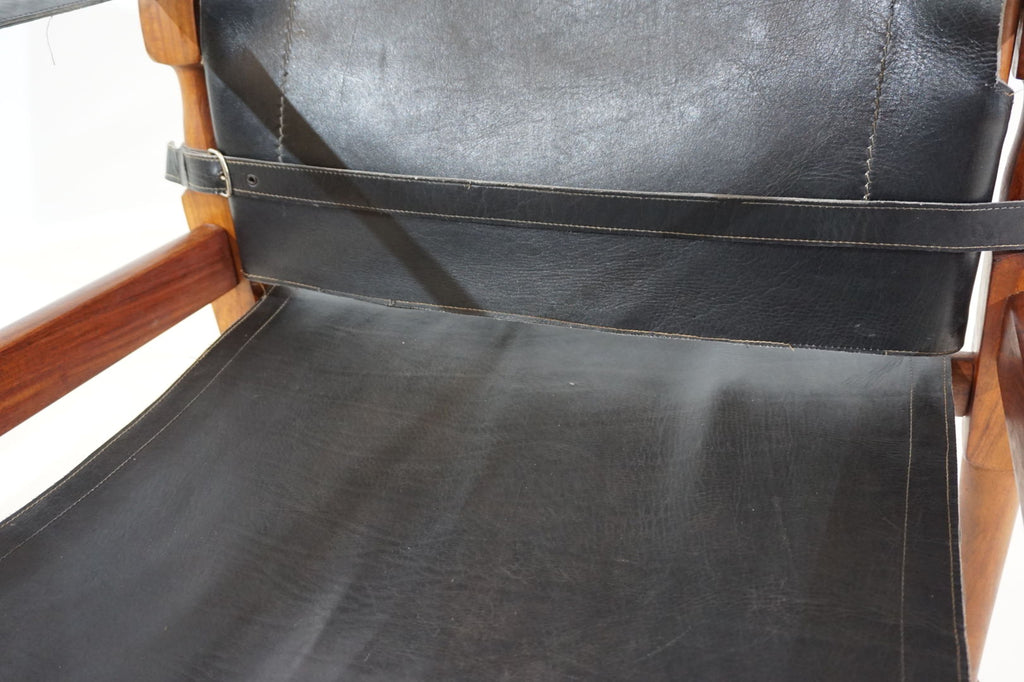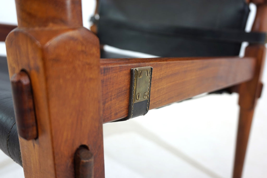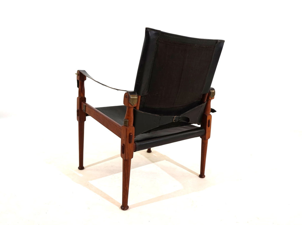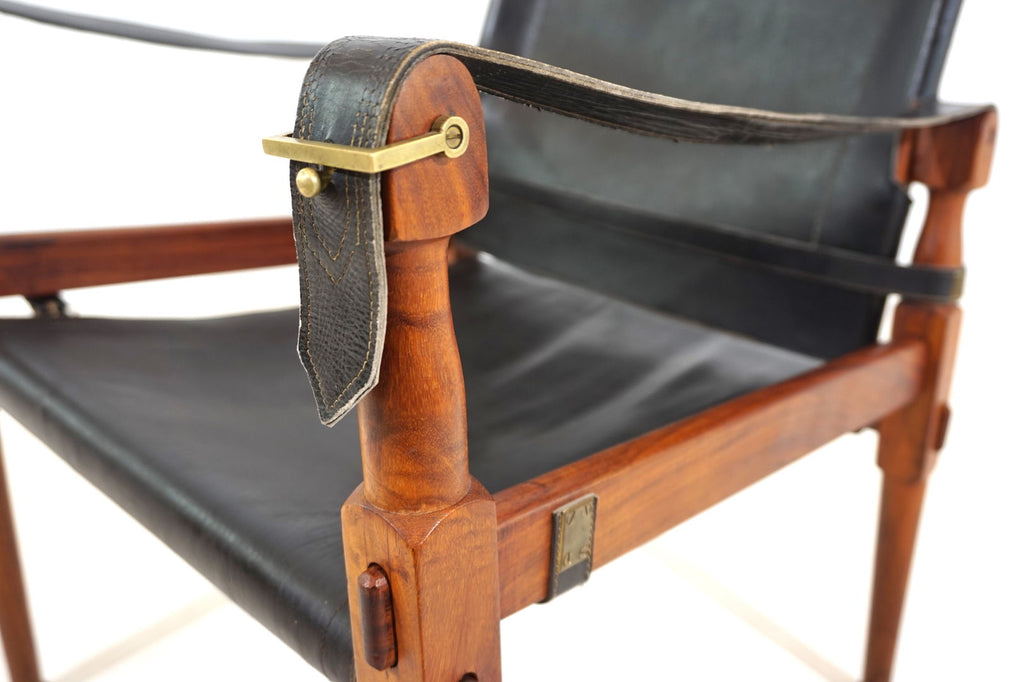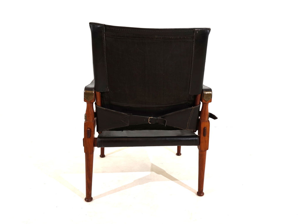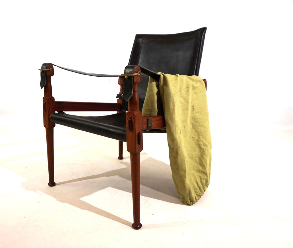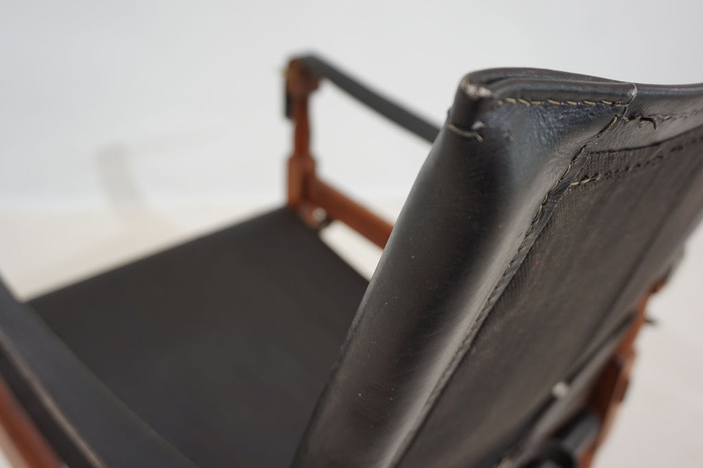 This original Hayat Roorkee Campaign Safari chair from the 60s is in first-class condition. The black leather has almost no visible signs of wear. The wooden frames, made of beautiful teak, are in very good condition. The tension cables are all in order, all fittings are tight and without damage. Exceptionally good piece. The Safari Roorkee chair was developed in 1933 by Hayat Brothers in Pakistan for the British officials and was used on safaris. Hayat developed a model that can be quickly dismantled but is still stable and comfortable. High-quality materials such as rosewood, mahogany or teak and the best leather were used.
